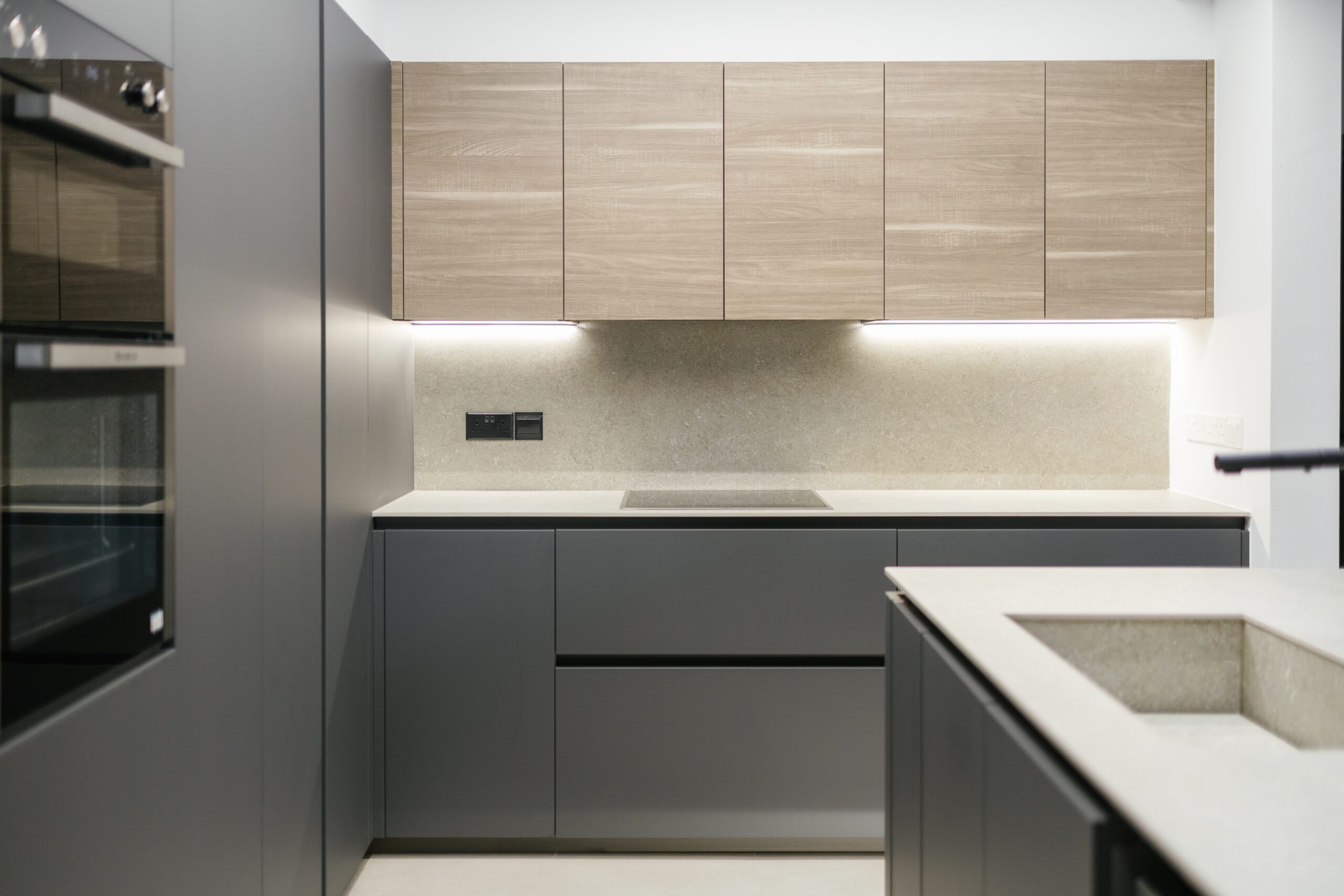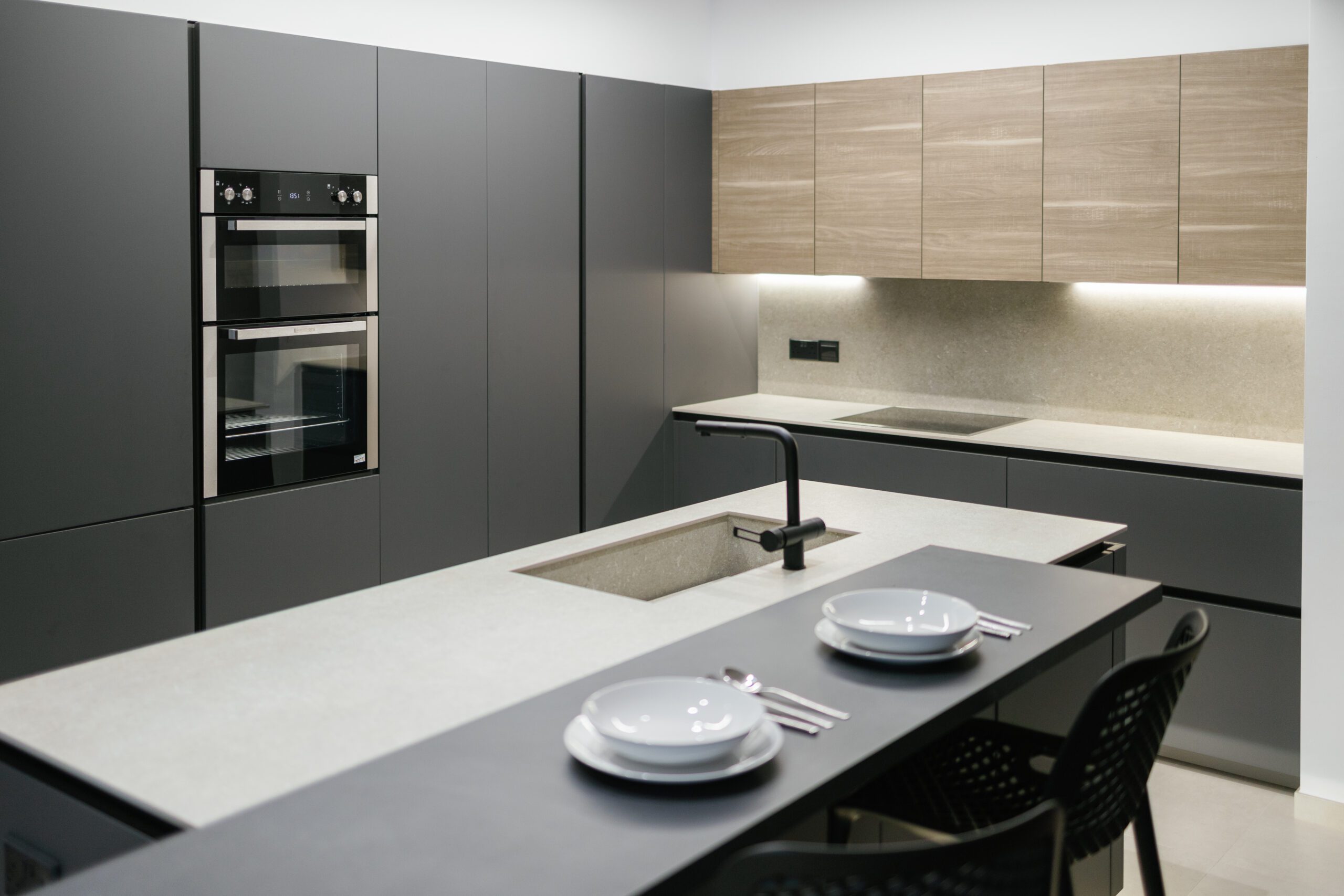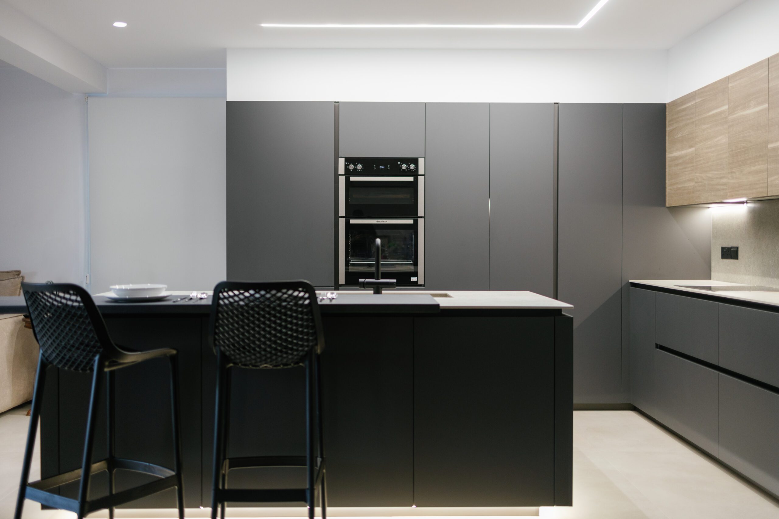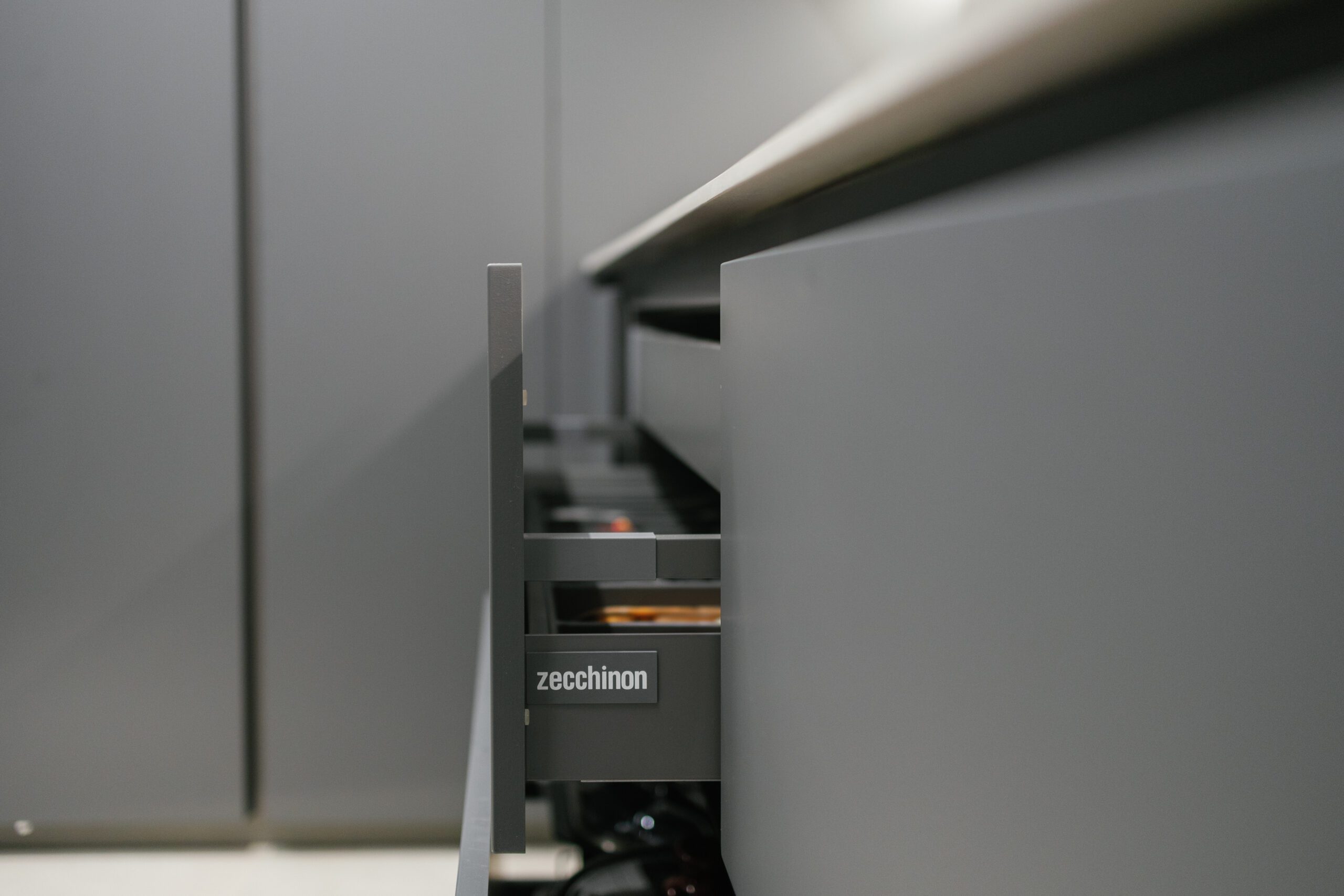 At Kitchen Studio, we’re thrilled to showcase our latest project featuring the Zecchinon Cucine Kalea and Tiffany kitchen models. This stunning design combines the smooth and contemporary Antracite Super Matt finish with the warmth of the wooden-effect melamine in Rovere Sinai finish.
