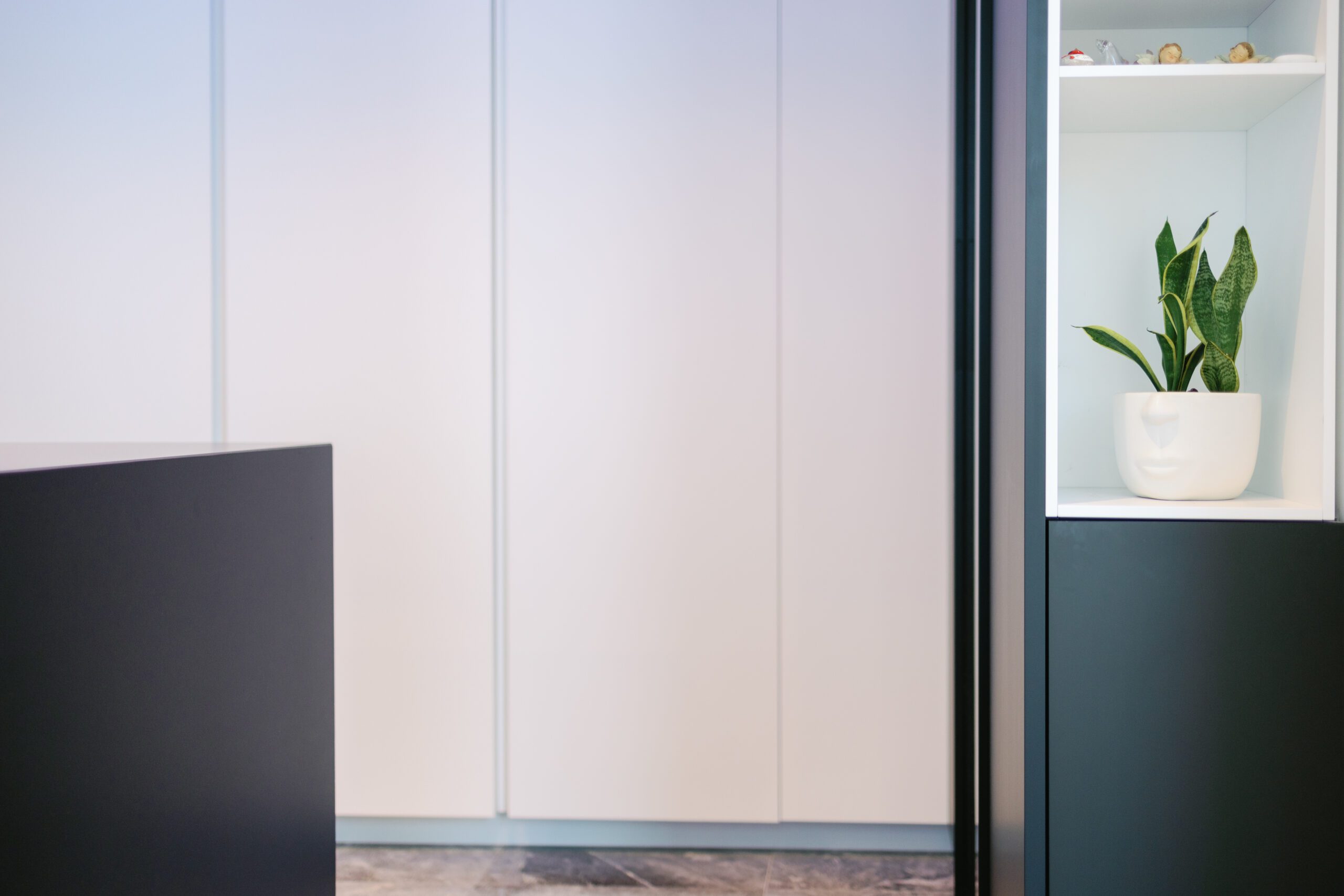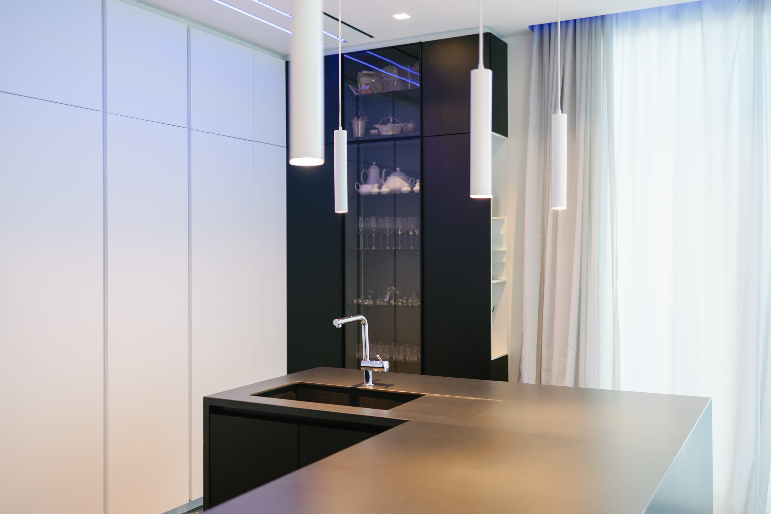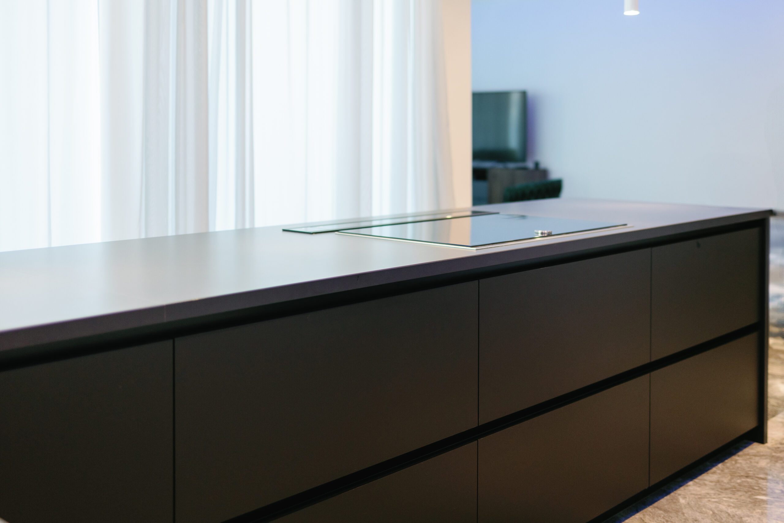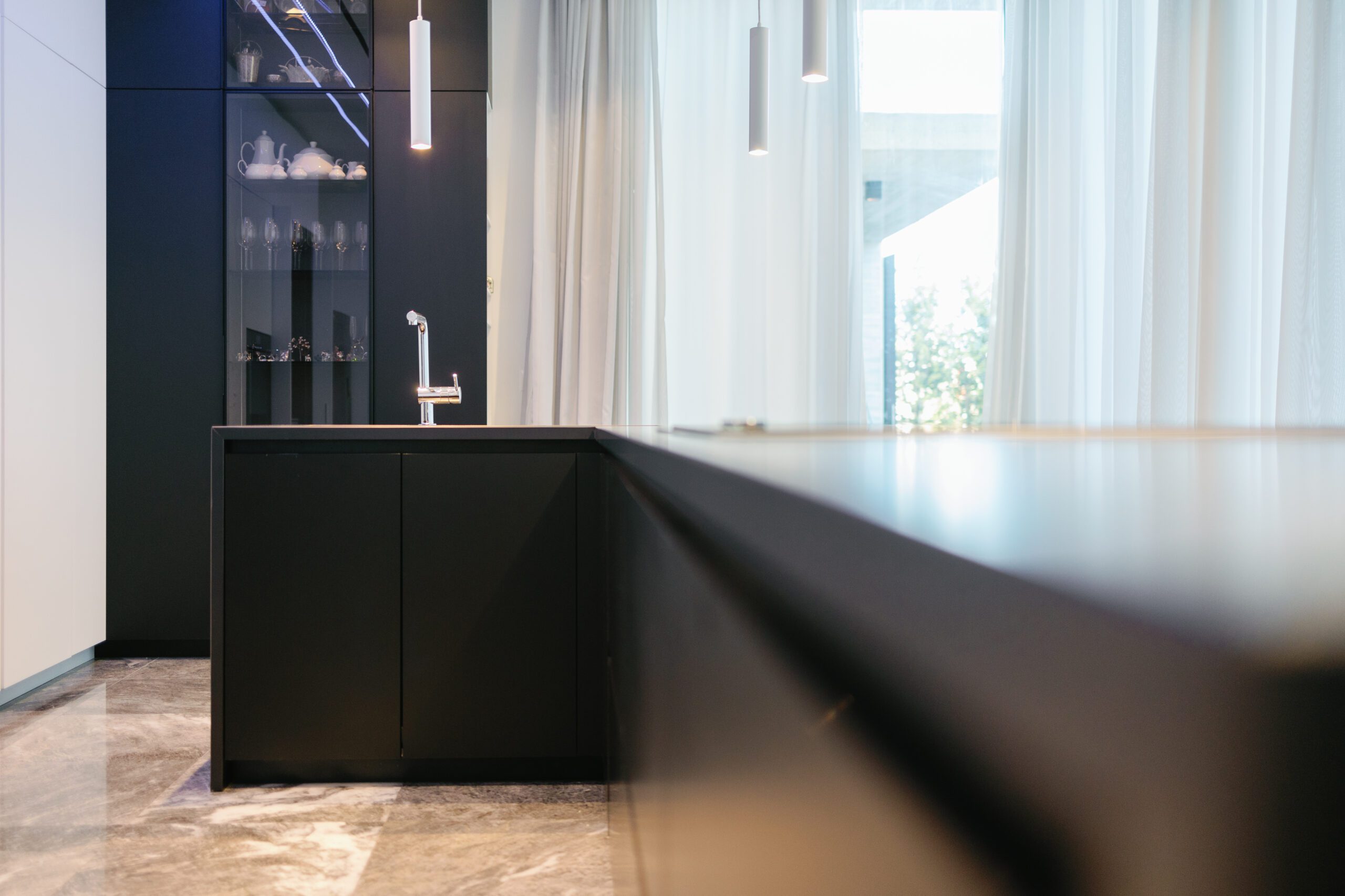 The combination of Respet Tecnolamina in a Black matt finish with Ecolacquered in Optic White matt creates a striking contrast that enhances both texture and style.