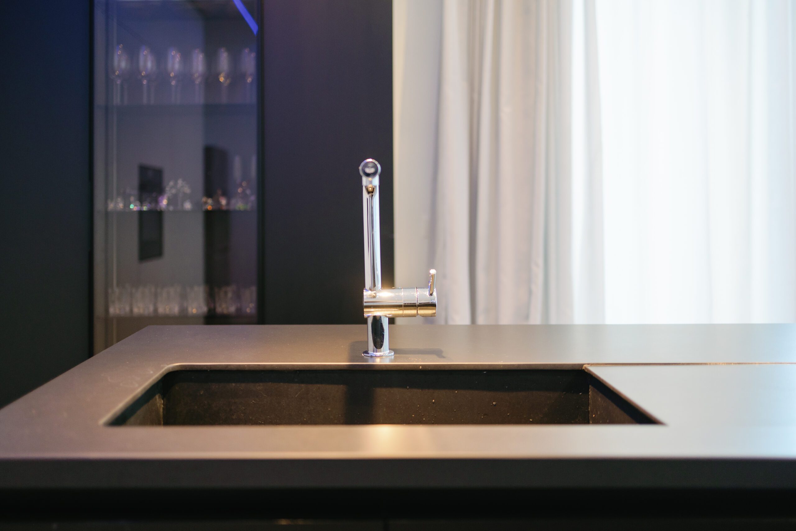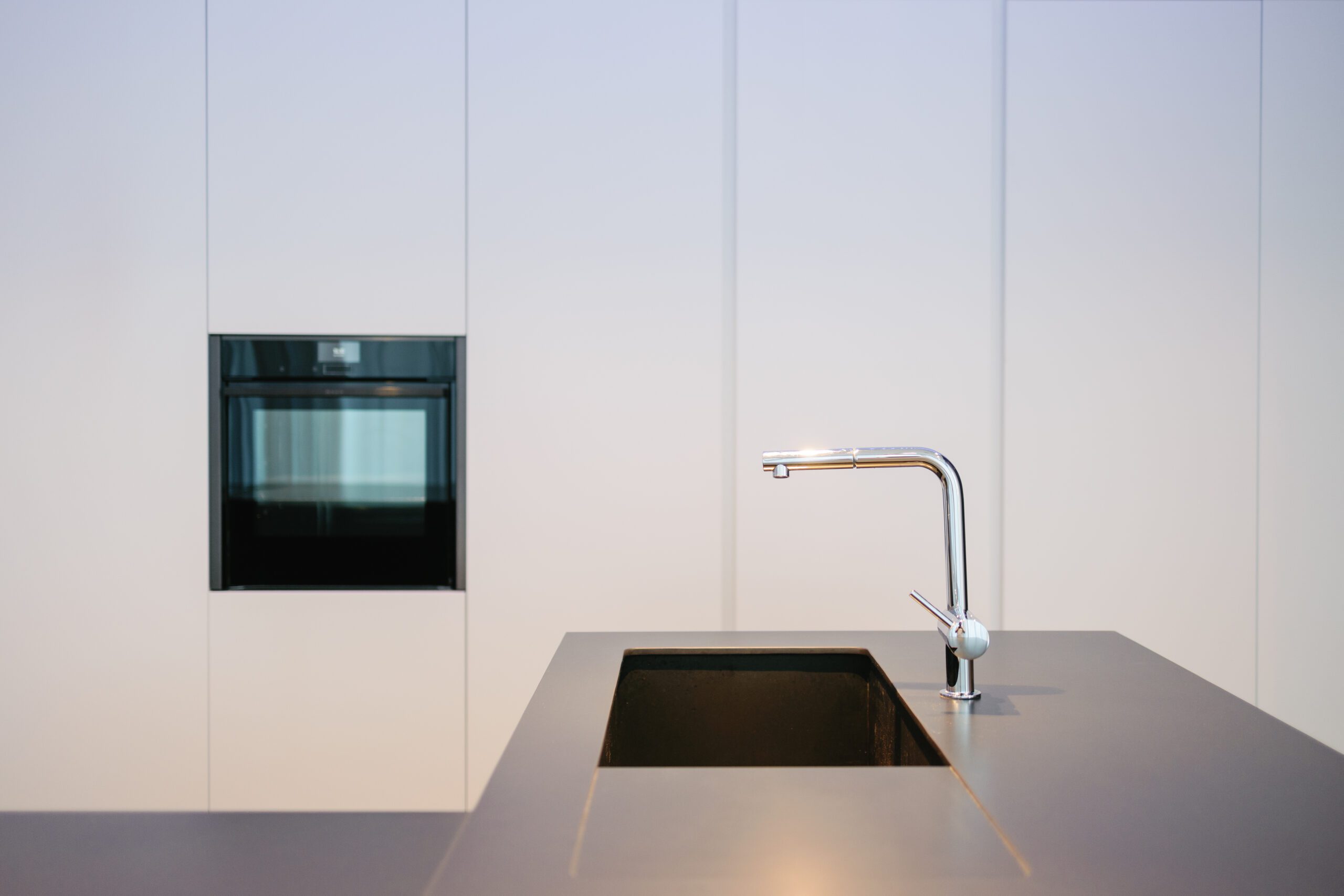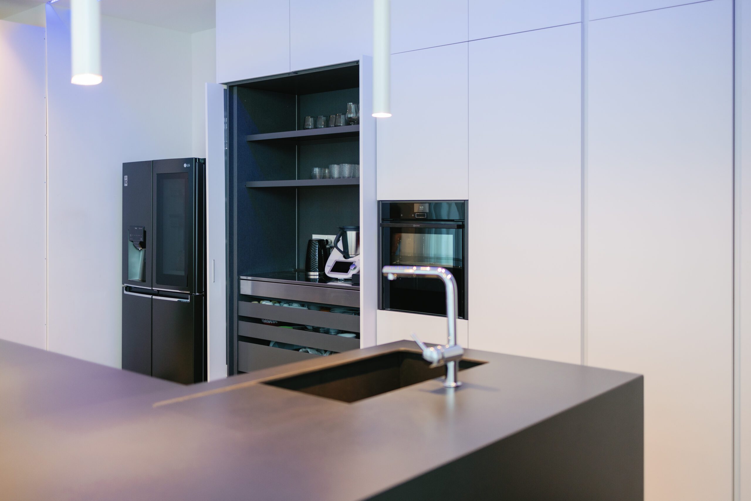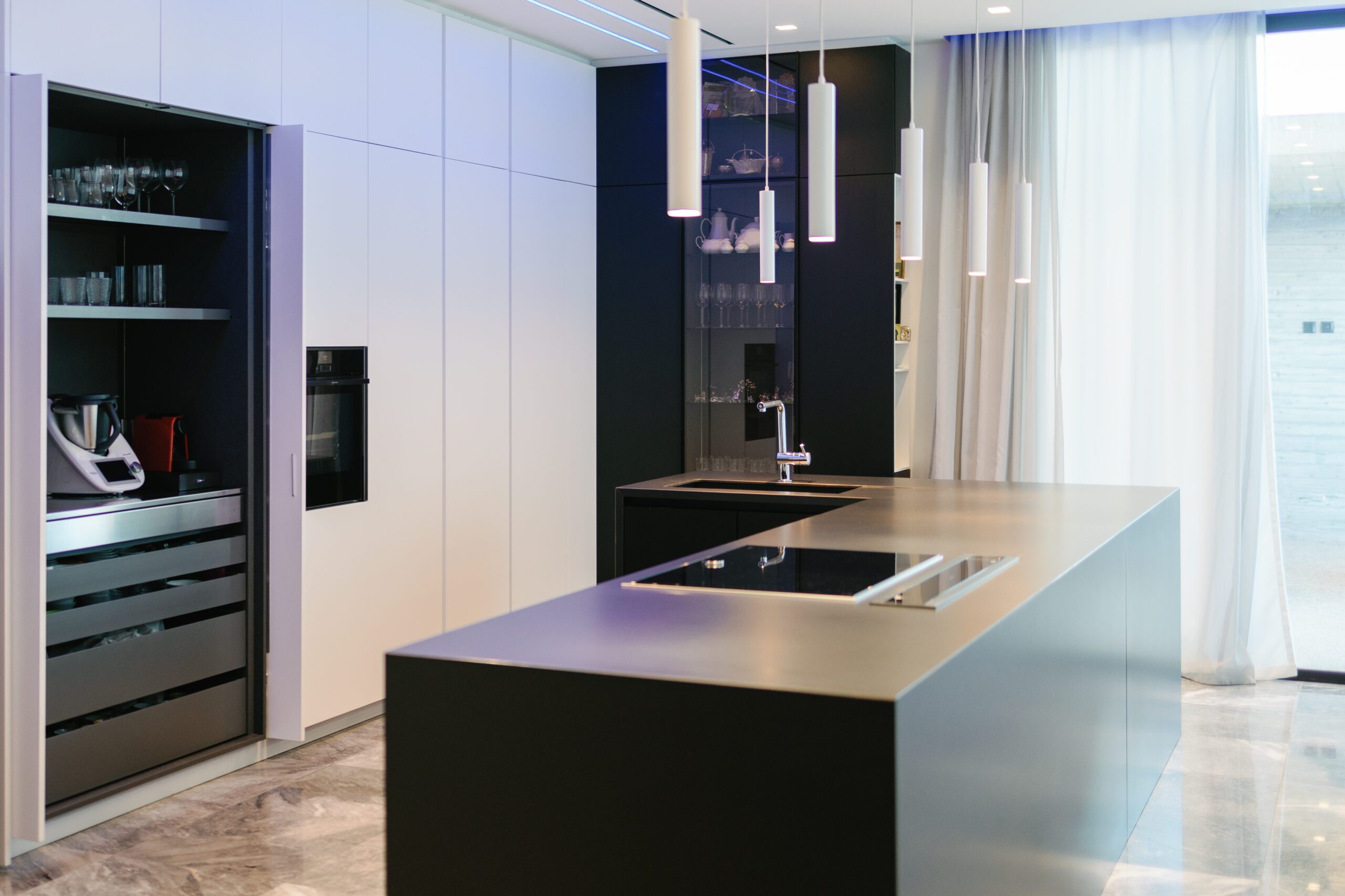 The combination of Respet Tecnolamina in a Black matt finish with Ecolacquered in Optic White matt creates a striking contrast that enhances both texture and style.