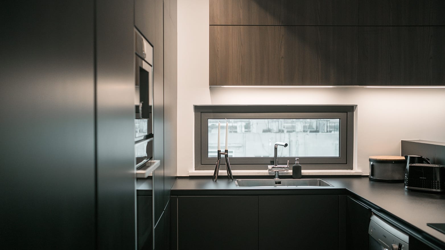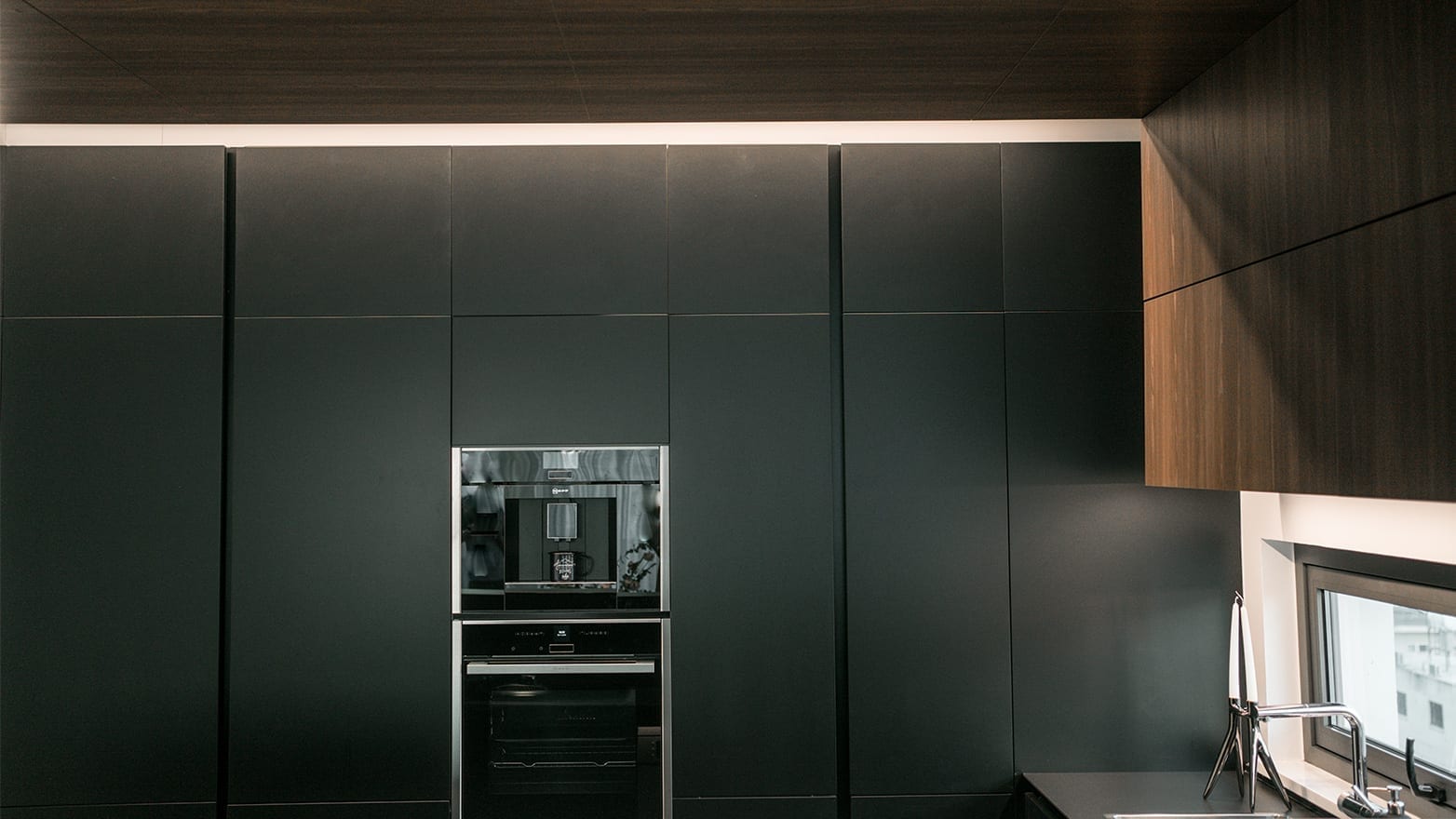 Aesthetically decoding the modern-themed kitchen design, primary modules and back units are created with eco-friendly ecolaccato in black matt finish and upper assisting units with thermo structured TSS in cortex matt finish, demonstrating a conscious style in every term.
