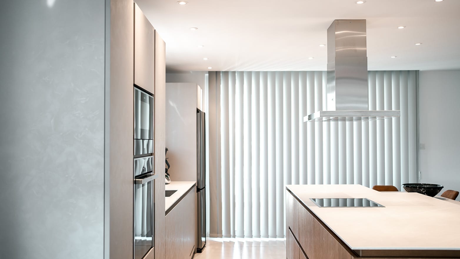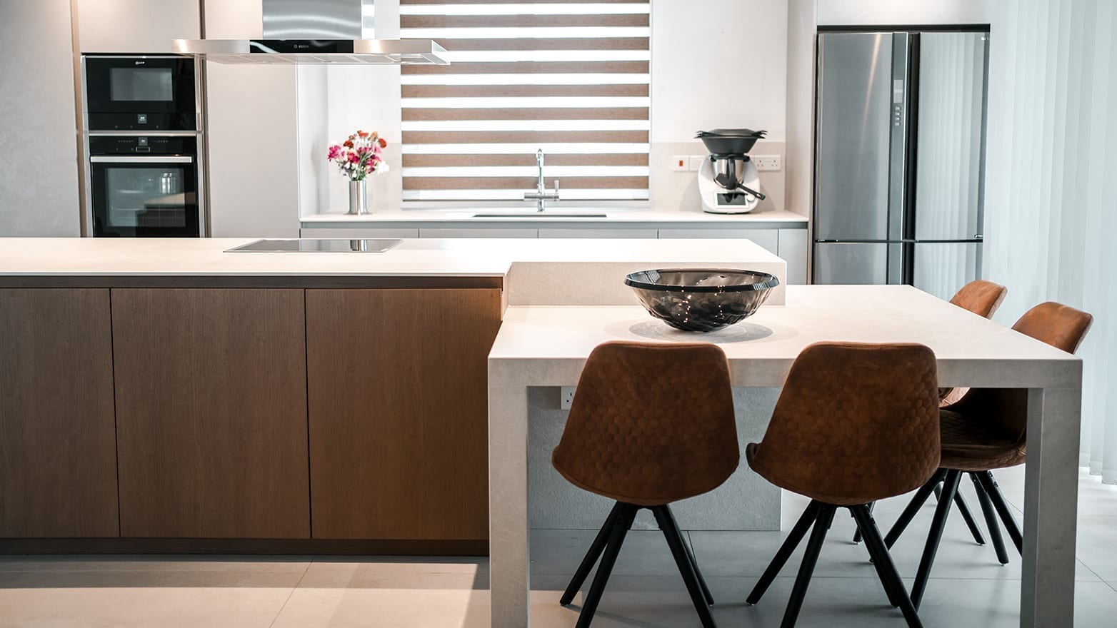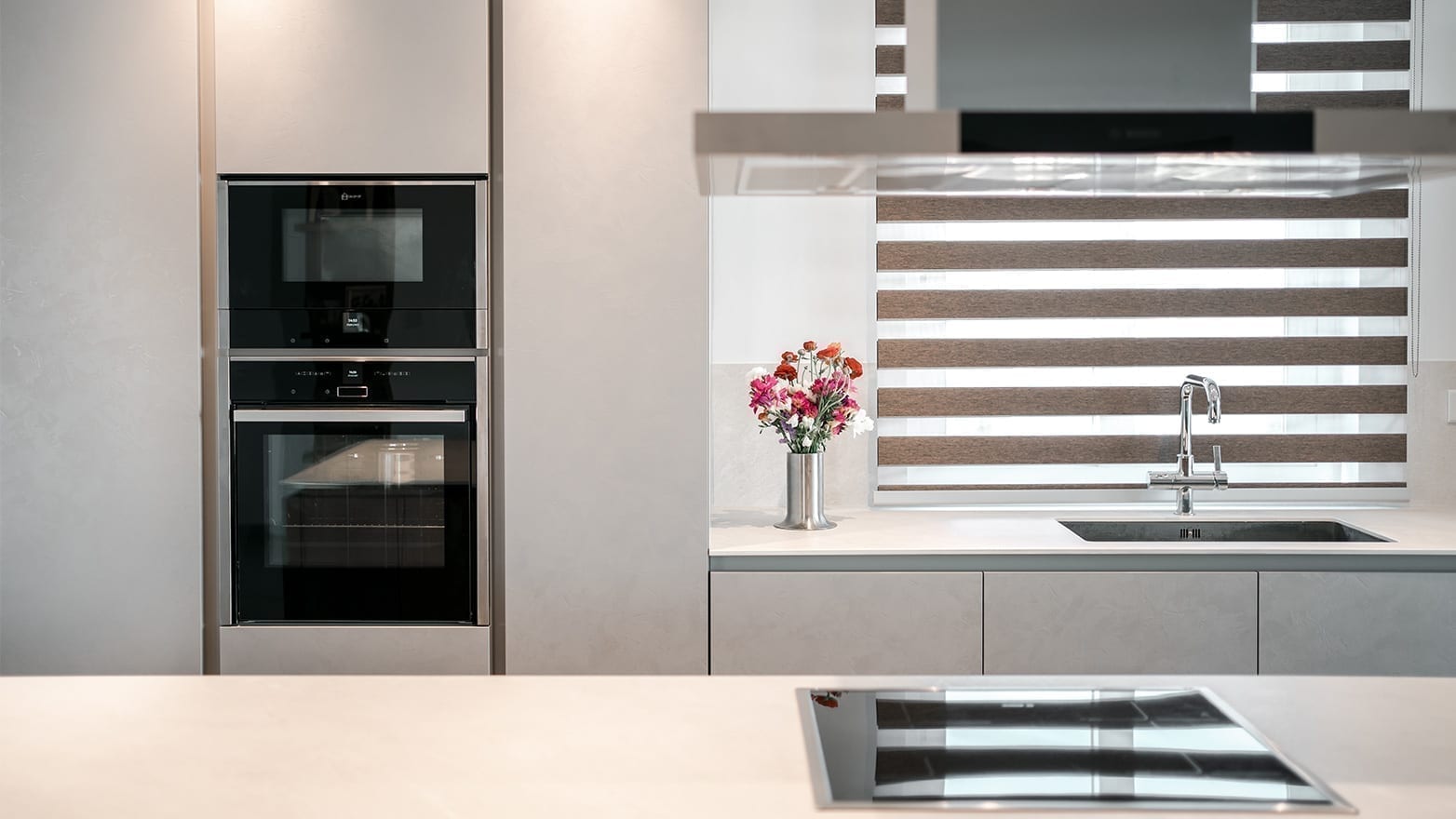 A modern kitchen in a city centre apartment at Larnaca that showcases flexibility, ergonomy and clear aesthetics, in line with the urban lifestyle.