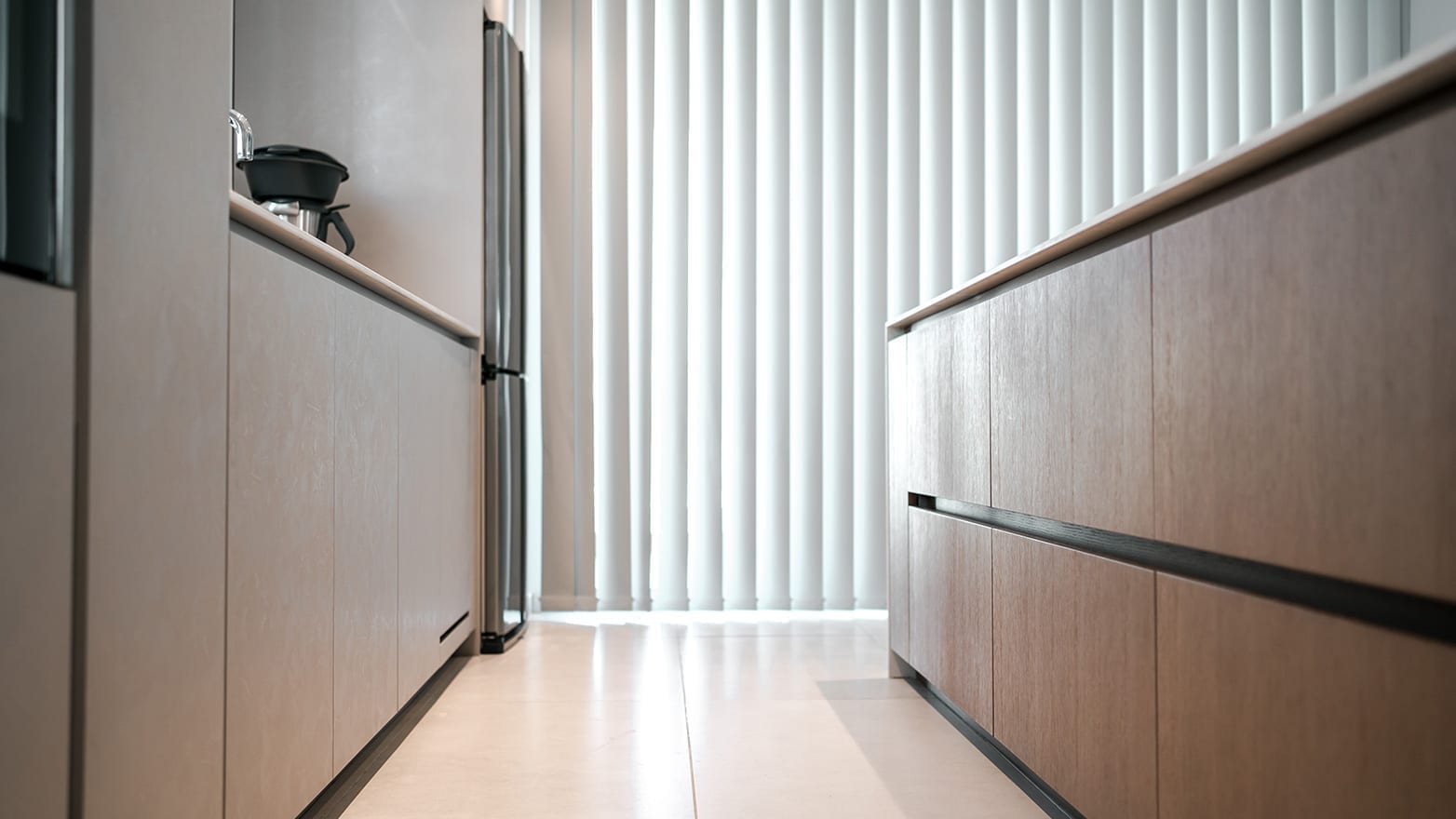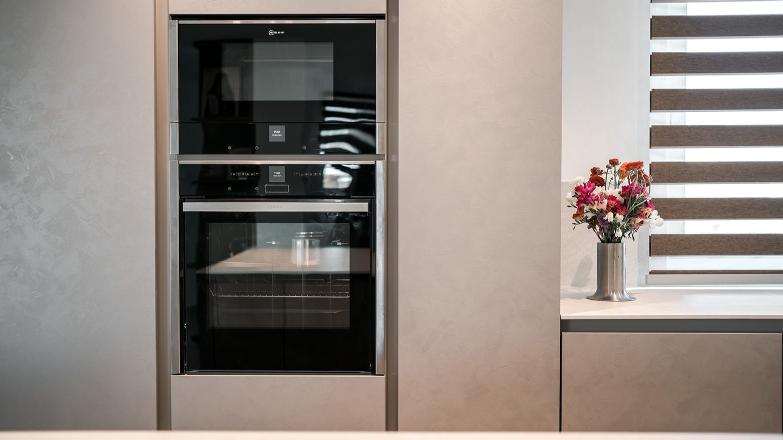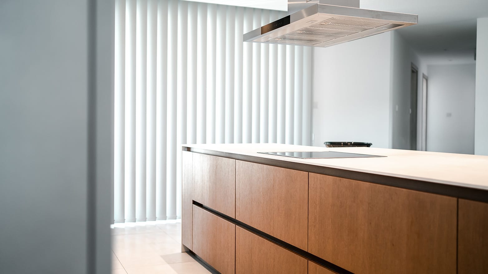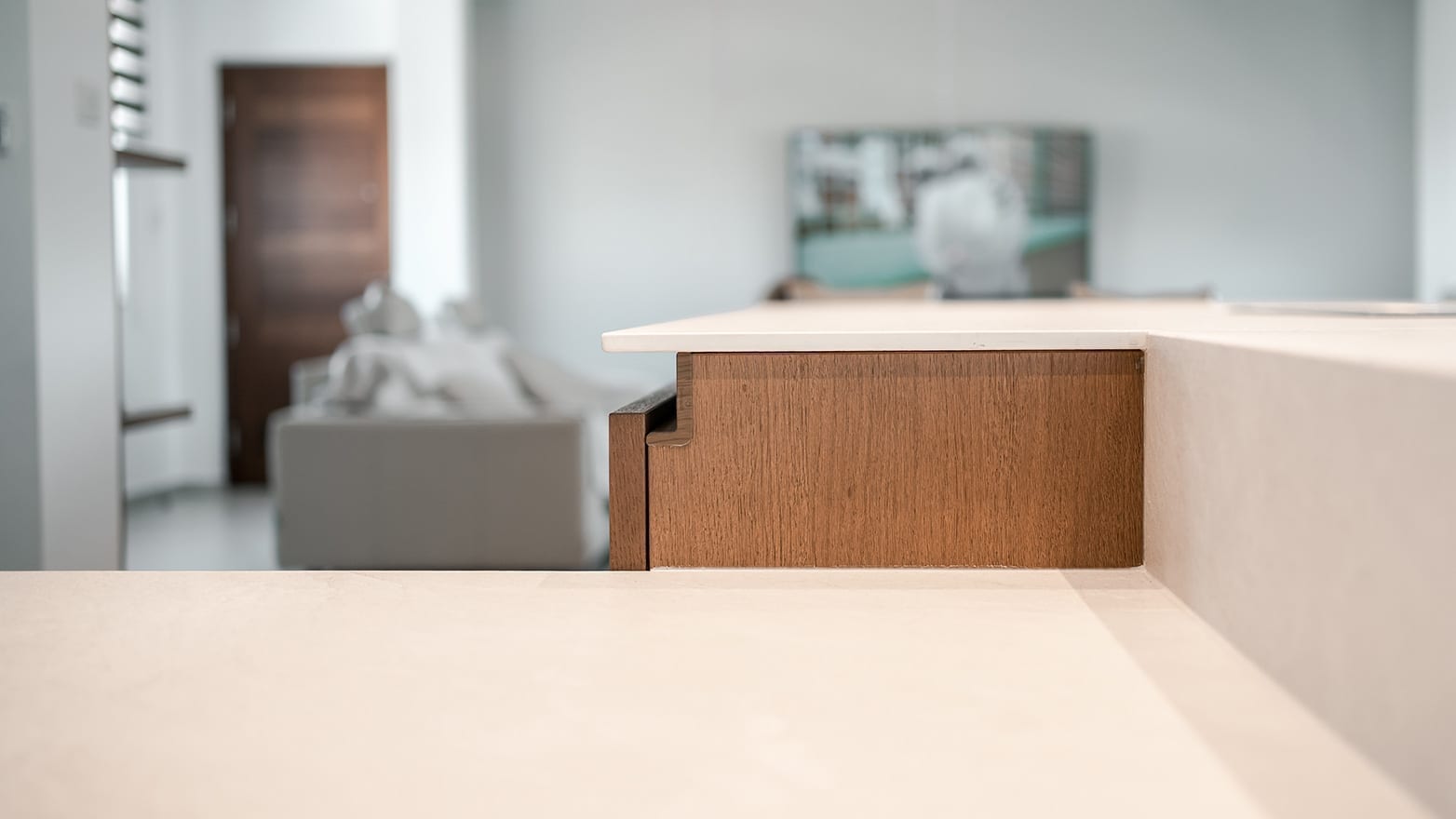 A modern kitchen in a city centre apartment at Larnaca that showcases flexibility, ergonomy and clear aesthetics, in line with the urban lifestyle.