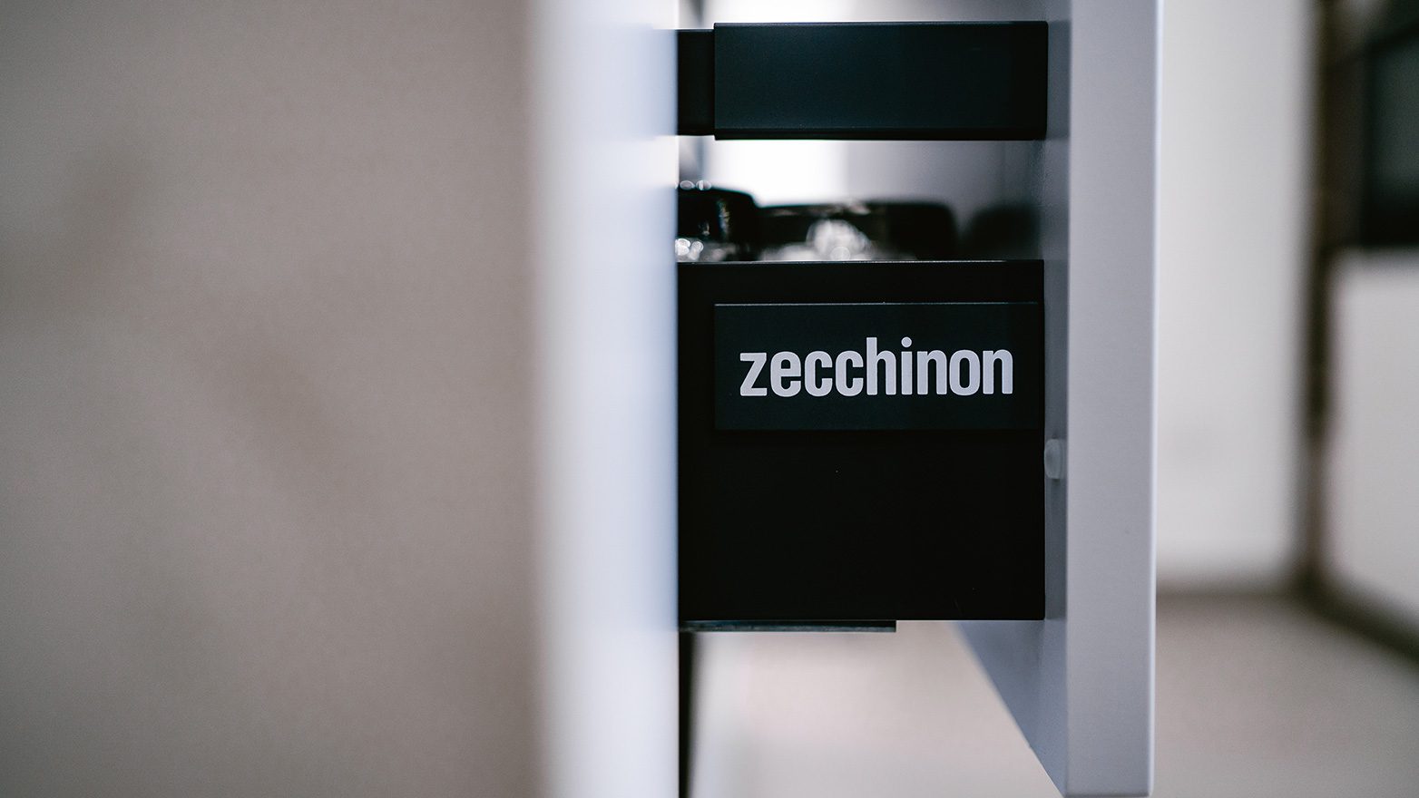 Zecchinon Cuccine Kalea modules in Grigio matt finish are developed for the kitchen island and peripherally, while K105 modules in Rovere Kronos finish create an all around assistive unit, integrating kitchen essential appliances linear.