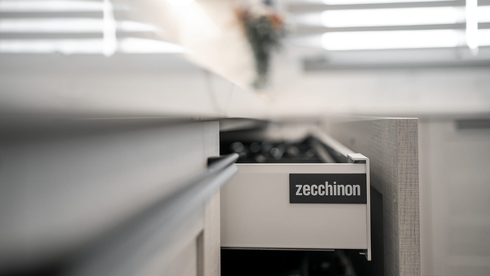 The Tiffany Multisystem of Zecchinon Cucine is utilized to develop modules peripherally and on the central kitchen island in rovero bianco finish, that offers a mat wooden effect in line with the exceptional kitchen design.