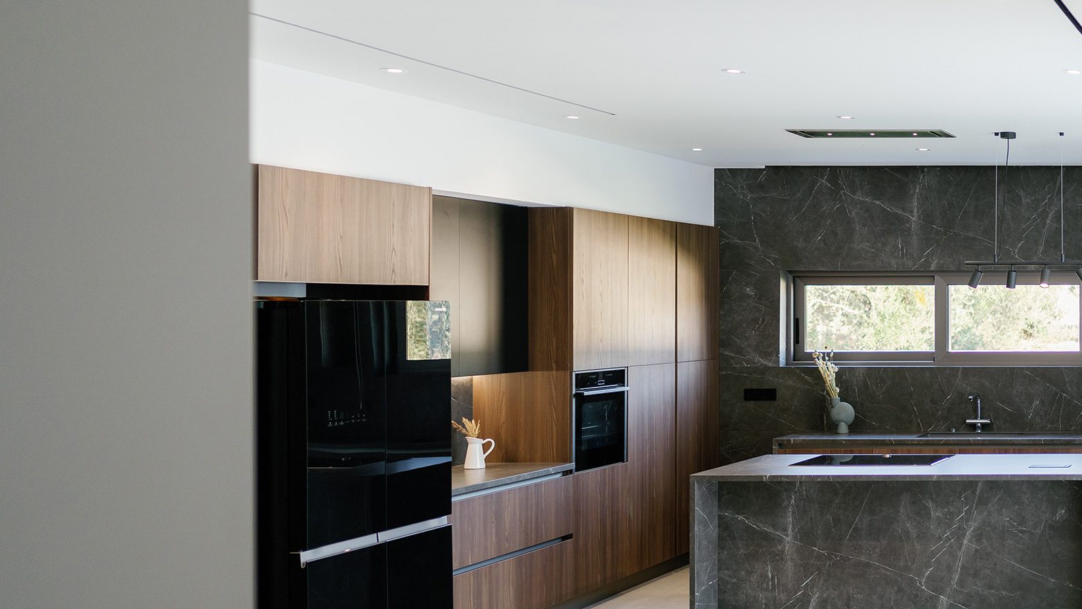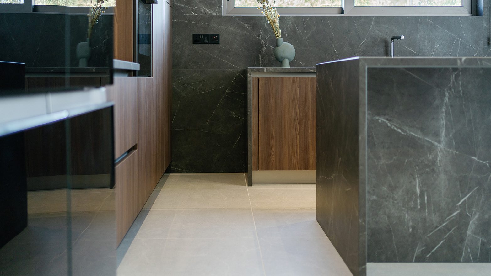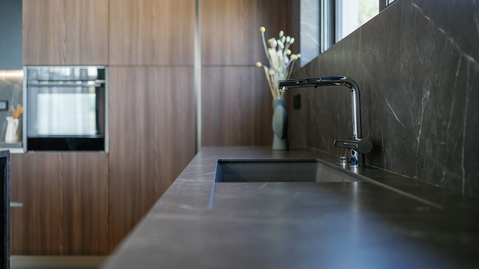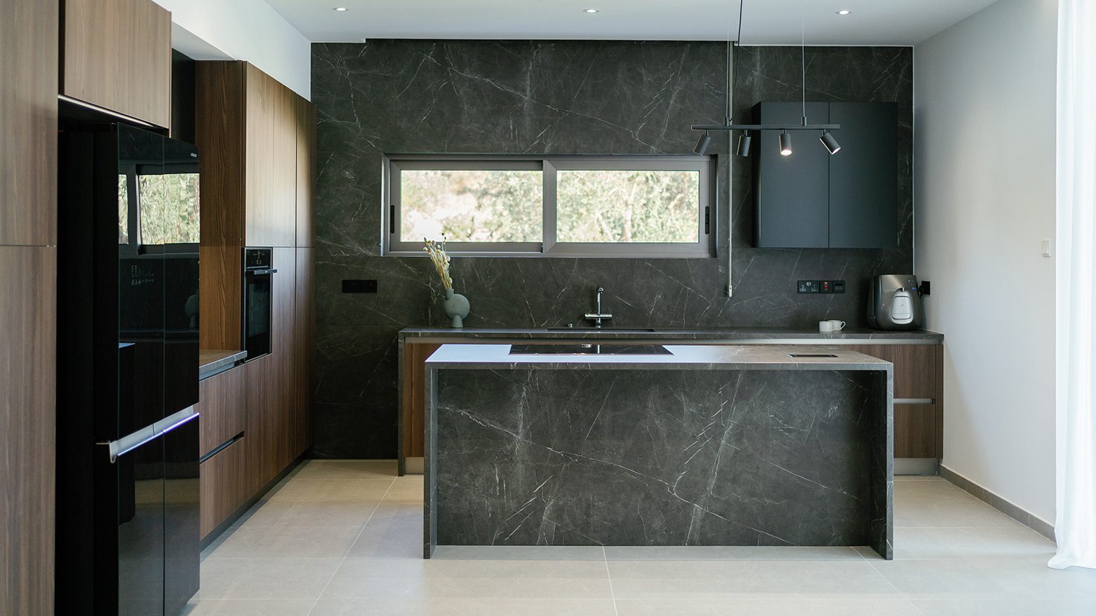 A combination of different materials, textures and colours, provides the new kitchen with a modern, natural look; following a linear design approach that, in result, compliments its high quality and aesthetics.