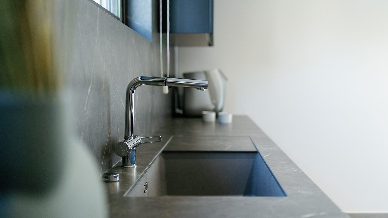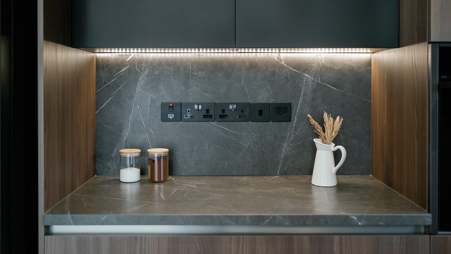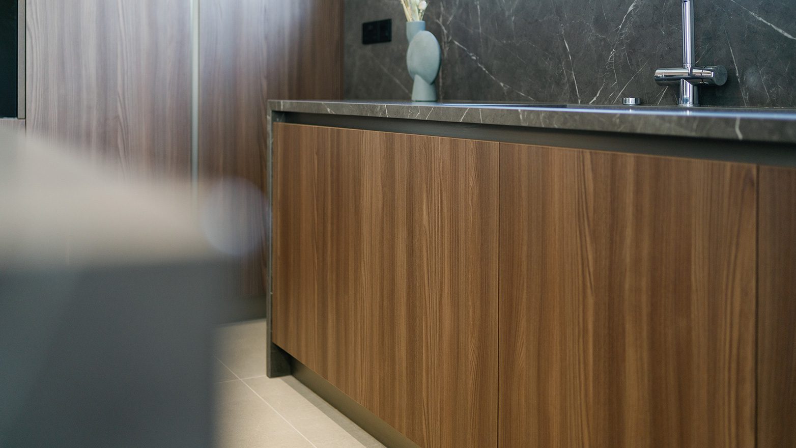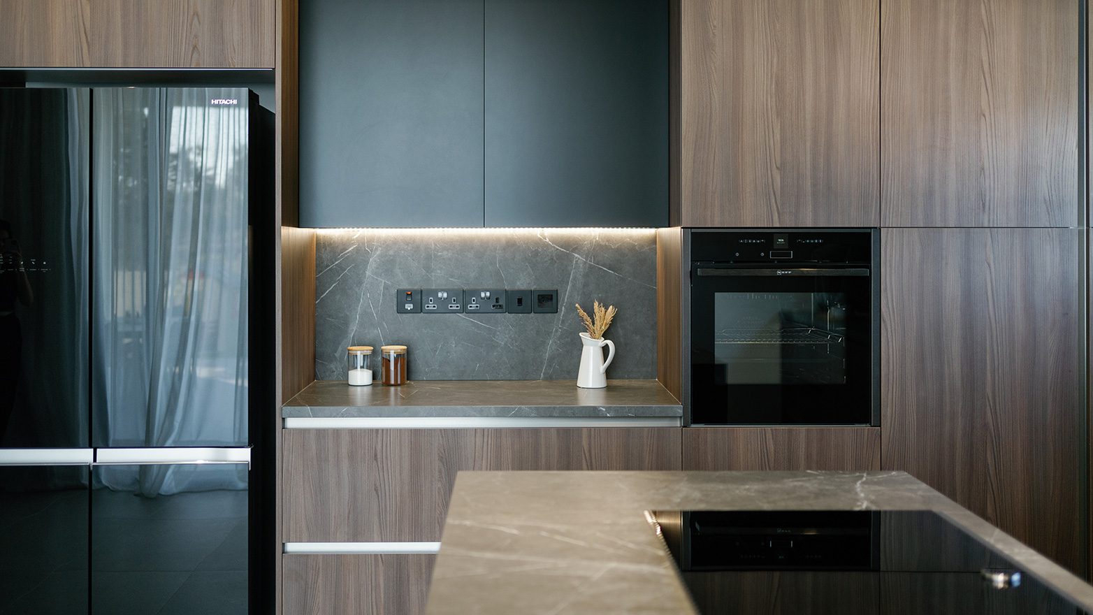 A combination of different materials, textures and colours, provides the new kitchen with a modern, natural look; following a linear design approach that, in result, compliments its high quality and aesthetics.