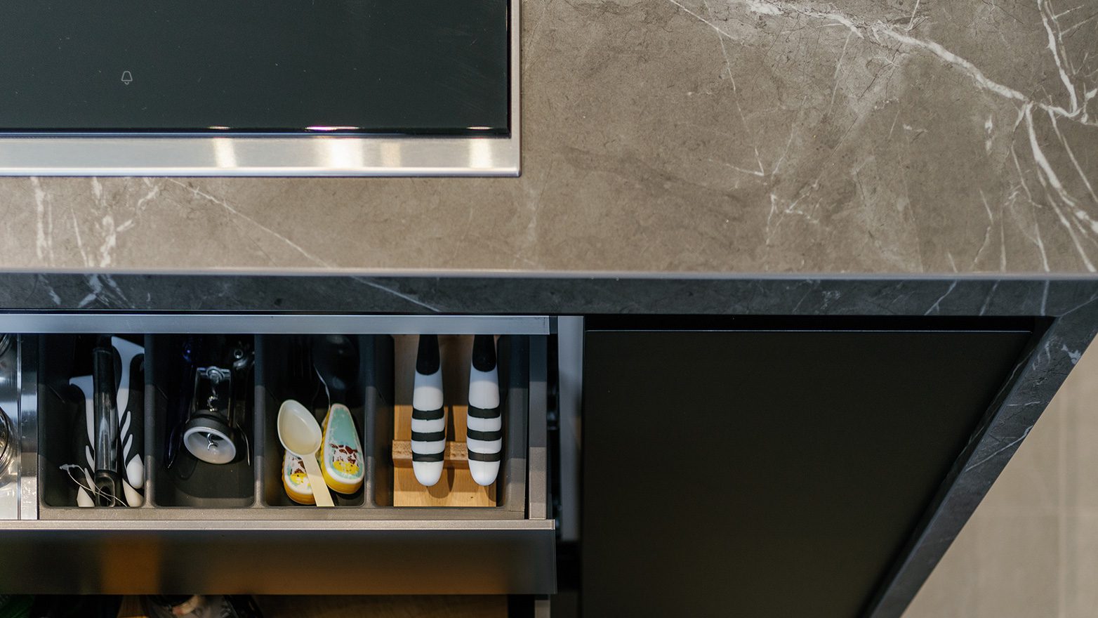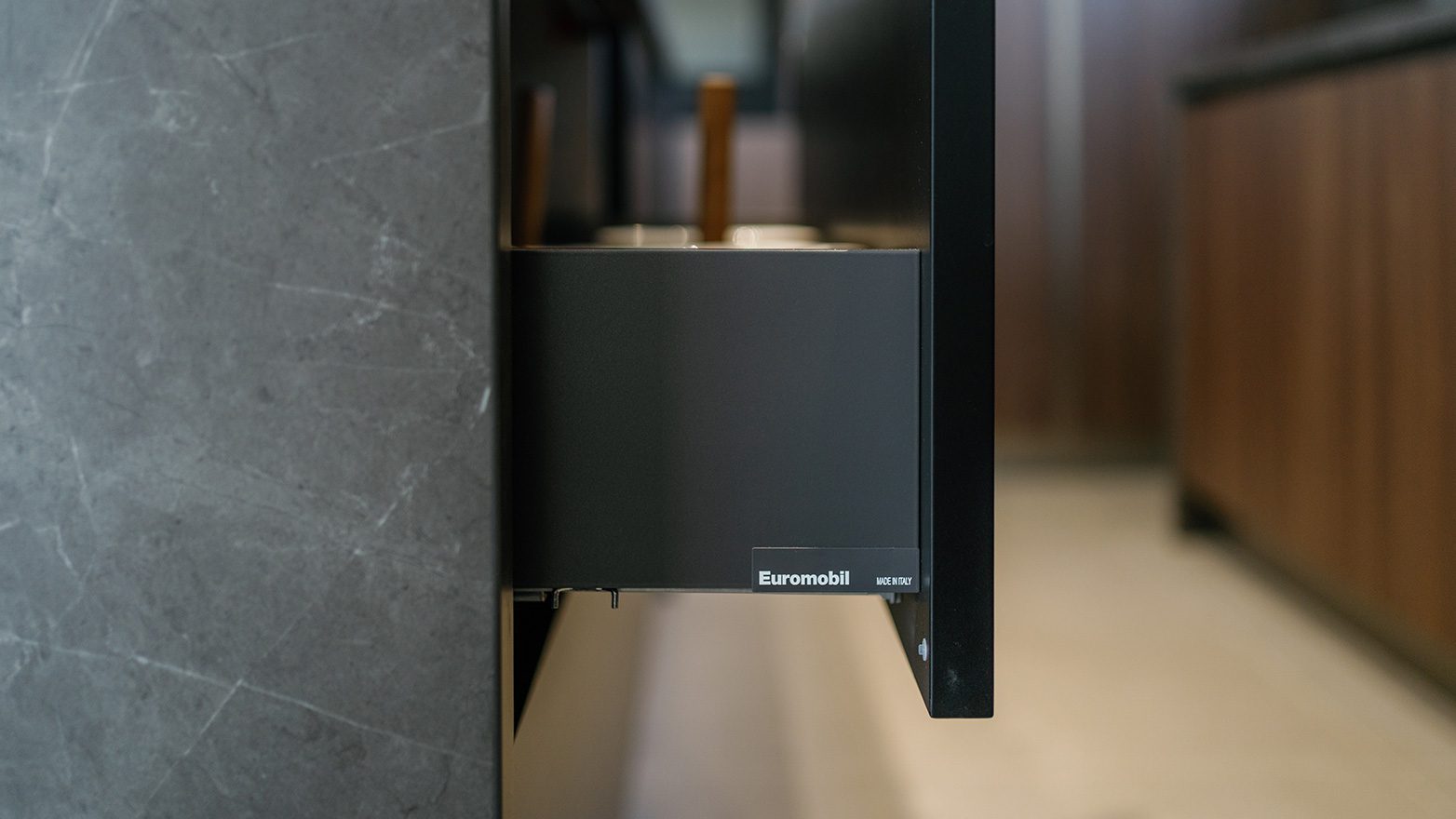 In a closer look, peripheral upper and base units are developed with thermostructured panels in wooden effect, Elm Cortex finish; while, kitchen island, and back-to-wall upper unit with smooth eco-lacquered, are seen with a minimal profile in a matt colour, absolute black finish.
