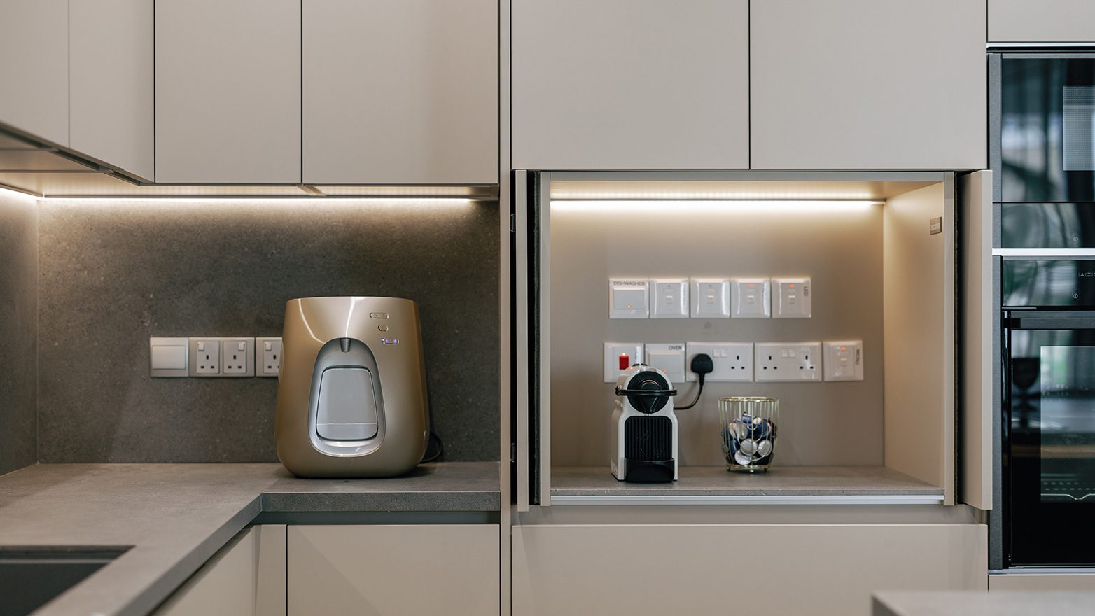 In a closer look, peripheral and assisting units in smooth, tortora matt colour finish, with System Kappa opening groove; featuring an integrated, stationary unit with pocket door. The kitchen island completes the composition, created with a gloss polymeric cabinet profile, caffè lucido in colour finish.