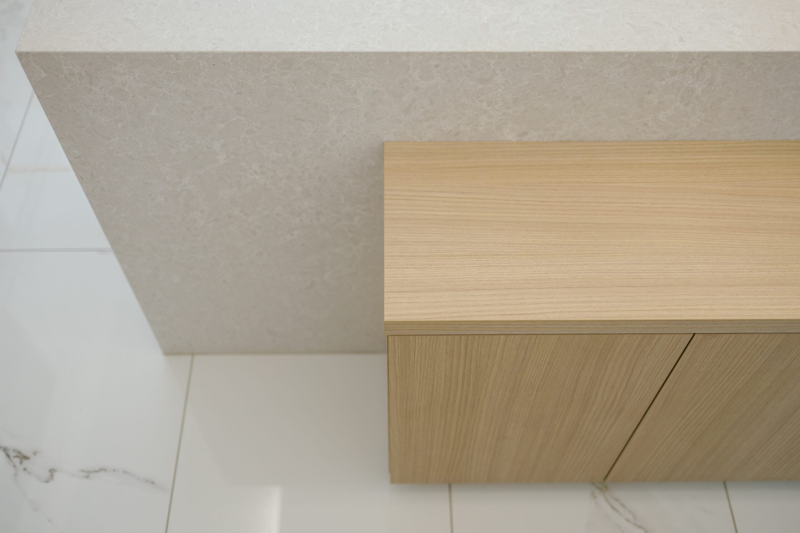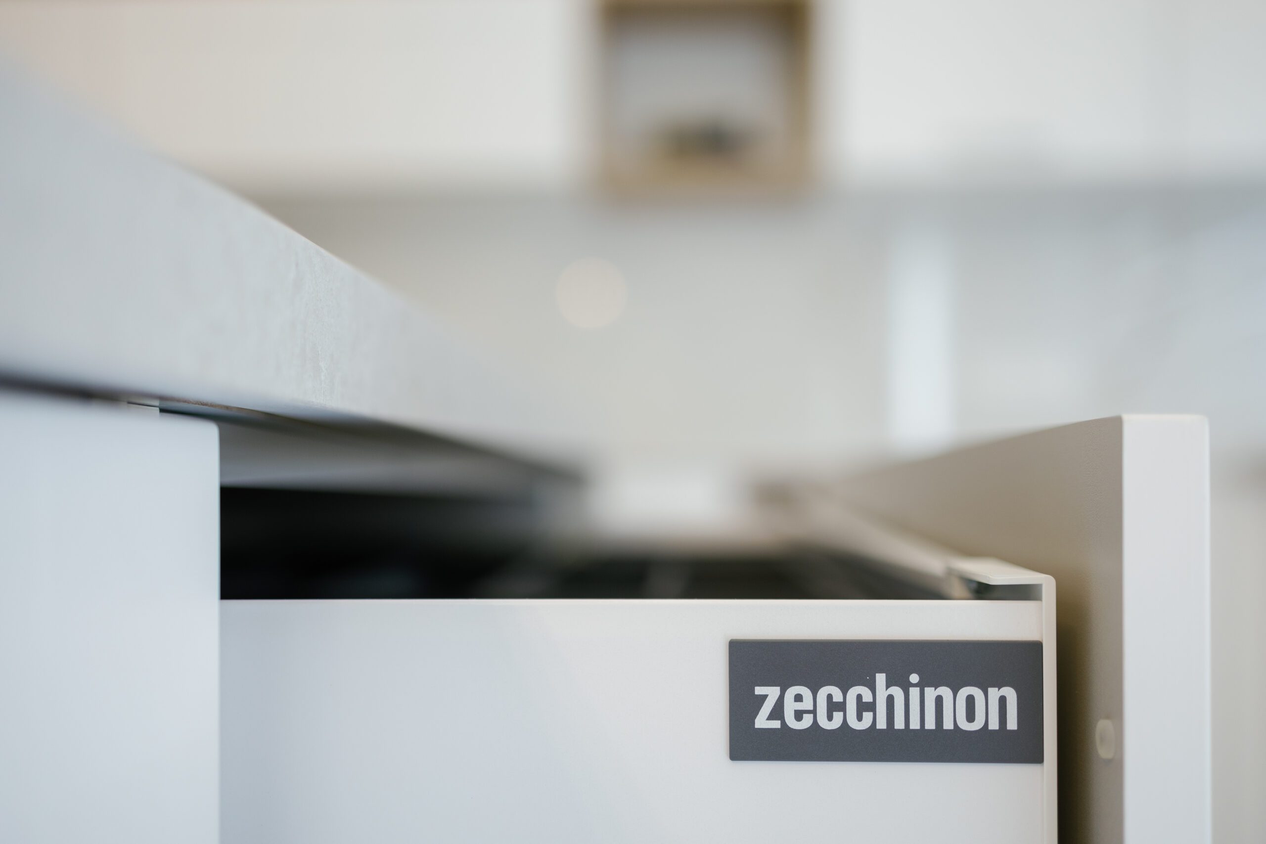 QUADRA & K105 models by Zecchinon, Plymeric in matt colour finish with White Matt & Thermostructure in textured wood-grain effect, Quercia Juta.
