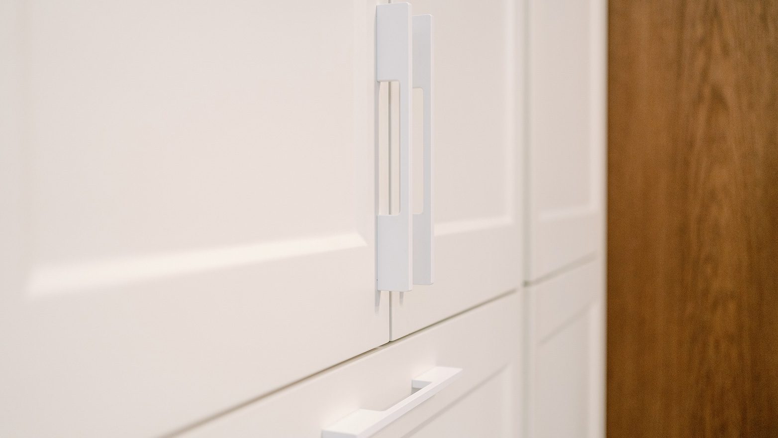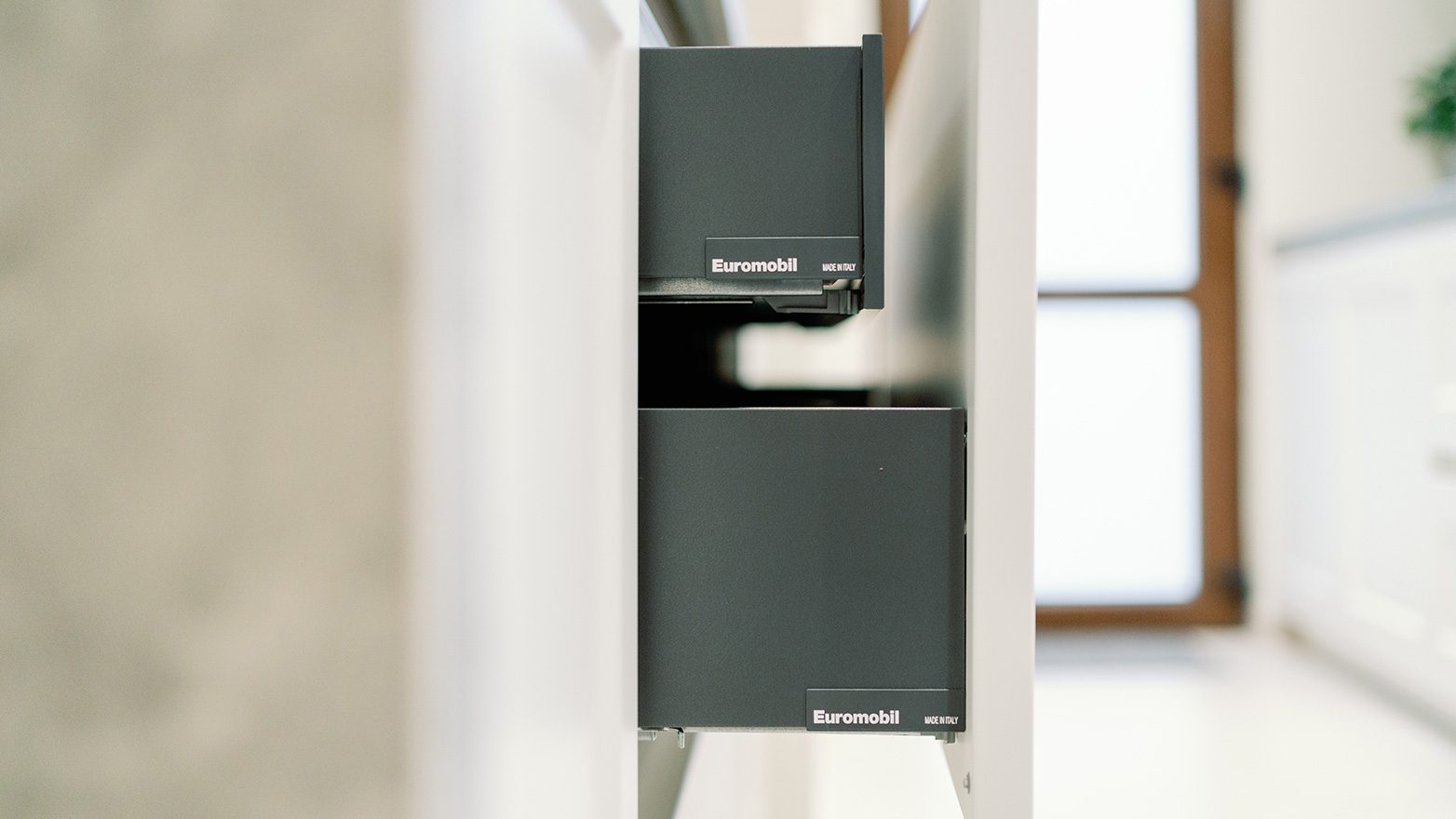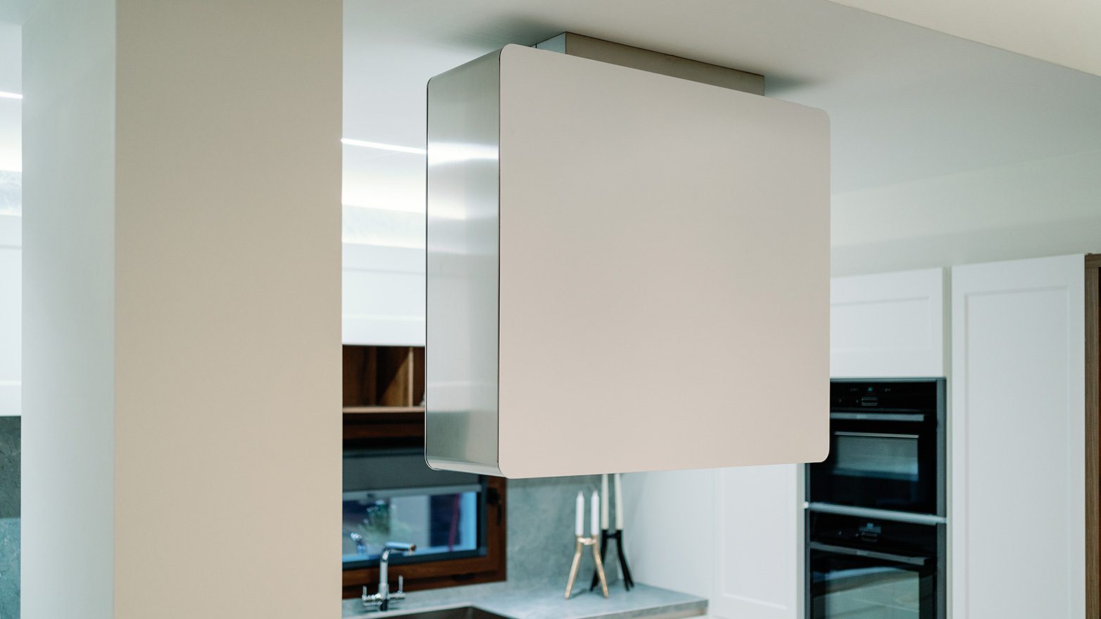 Taking a closer look at the synthesis – peripheral and upper modules in matt white finish have been developed with theGruppo Euromobil Filò model, offering aesthetic expression and a practical solution, while a suspended island hood has been installed to accommodate any type of cooking session.