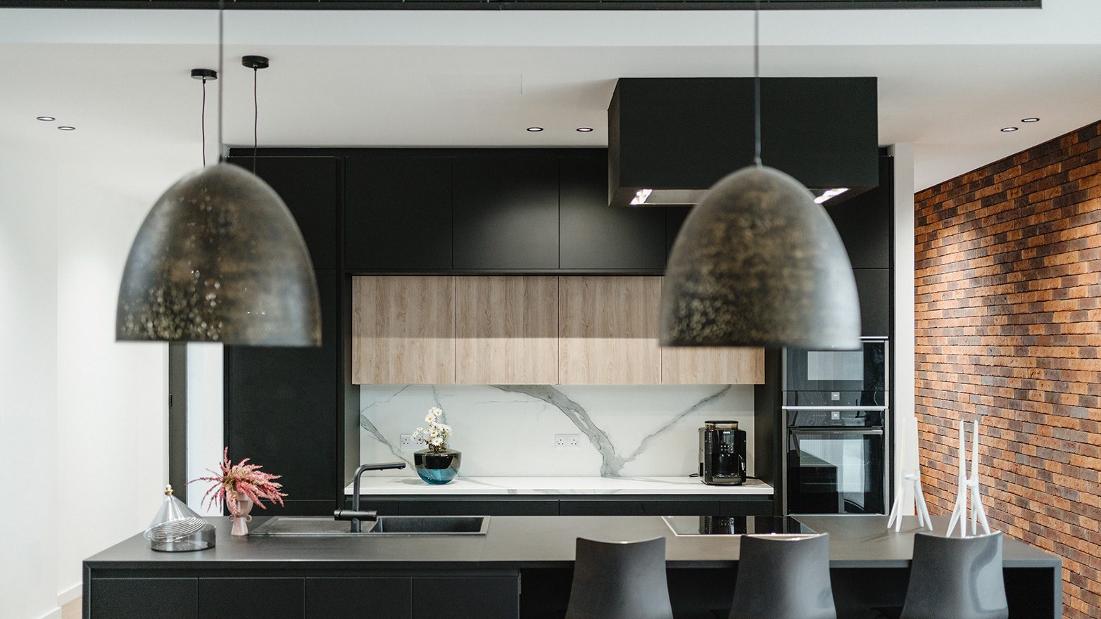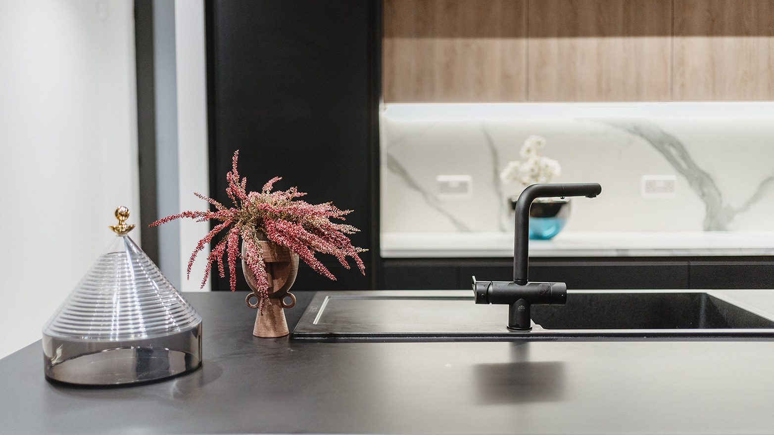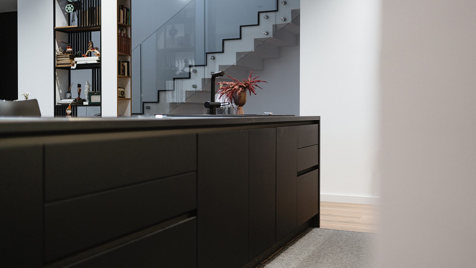 Taking a closer look at the synthesis – the main and peripheral kitchen modules and vent hood are developed in matt black finish, based on Zecchinon Cucine Kalea model, while the hanging kitchen cabinets in wood finish are developed with the Sharon model.