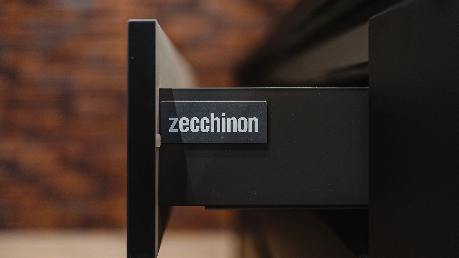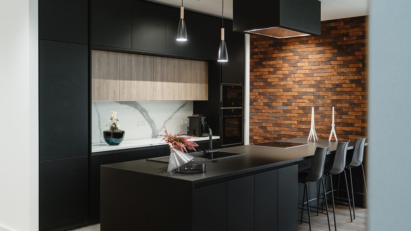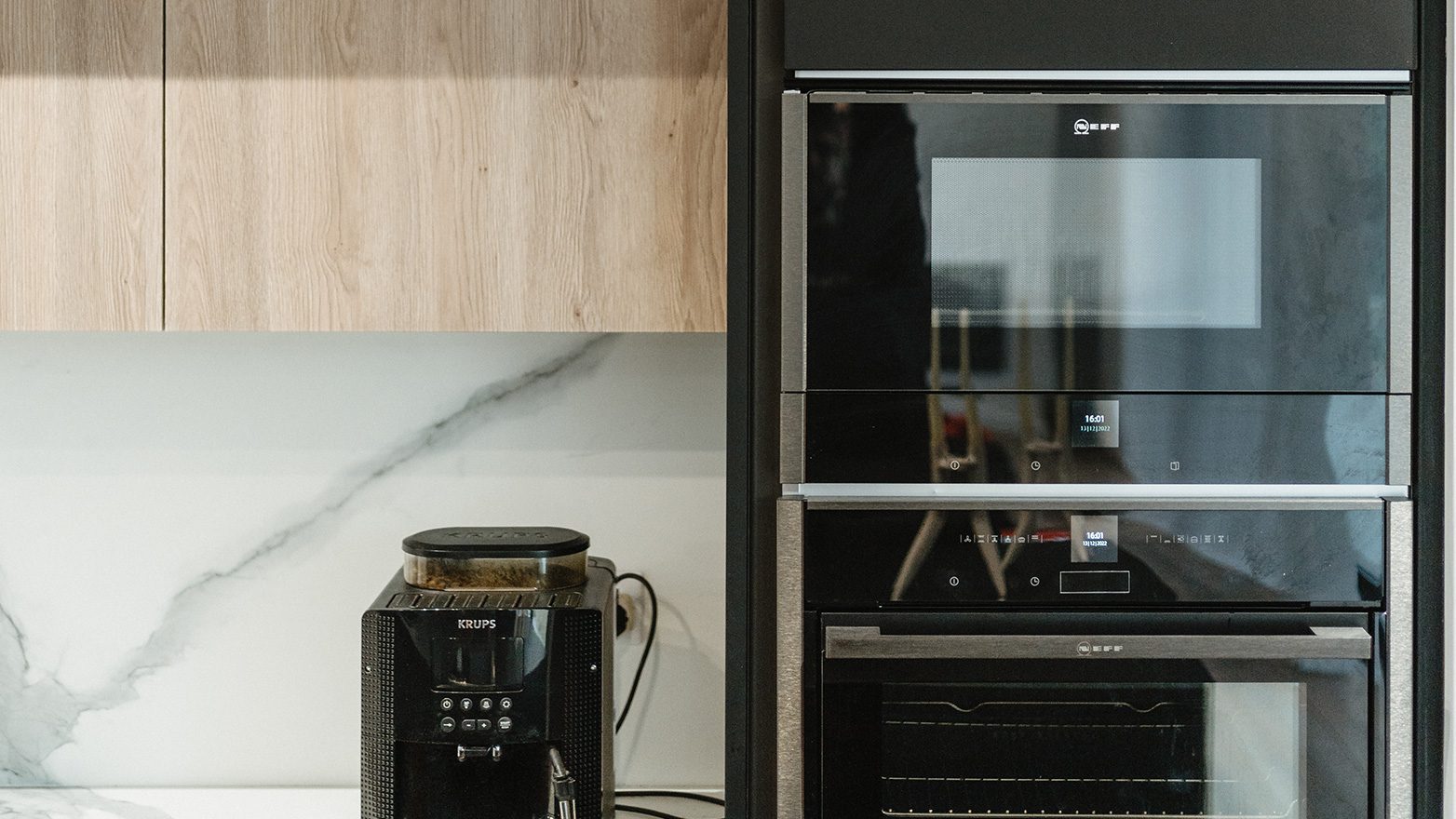 Taking a closer look at the synthesis – the main and peripheral kitchen modules and vent hood are developed in matt black finish, based on Zecchinon Cucine Kalea model, while the hanging kitchen cabinets in wood finish are developed with the Sharon model.