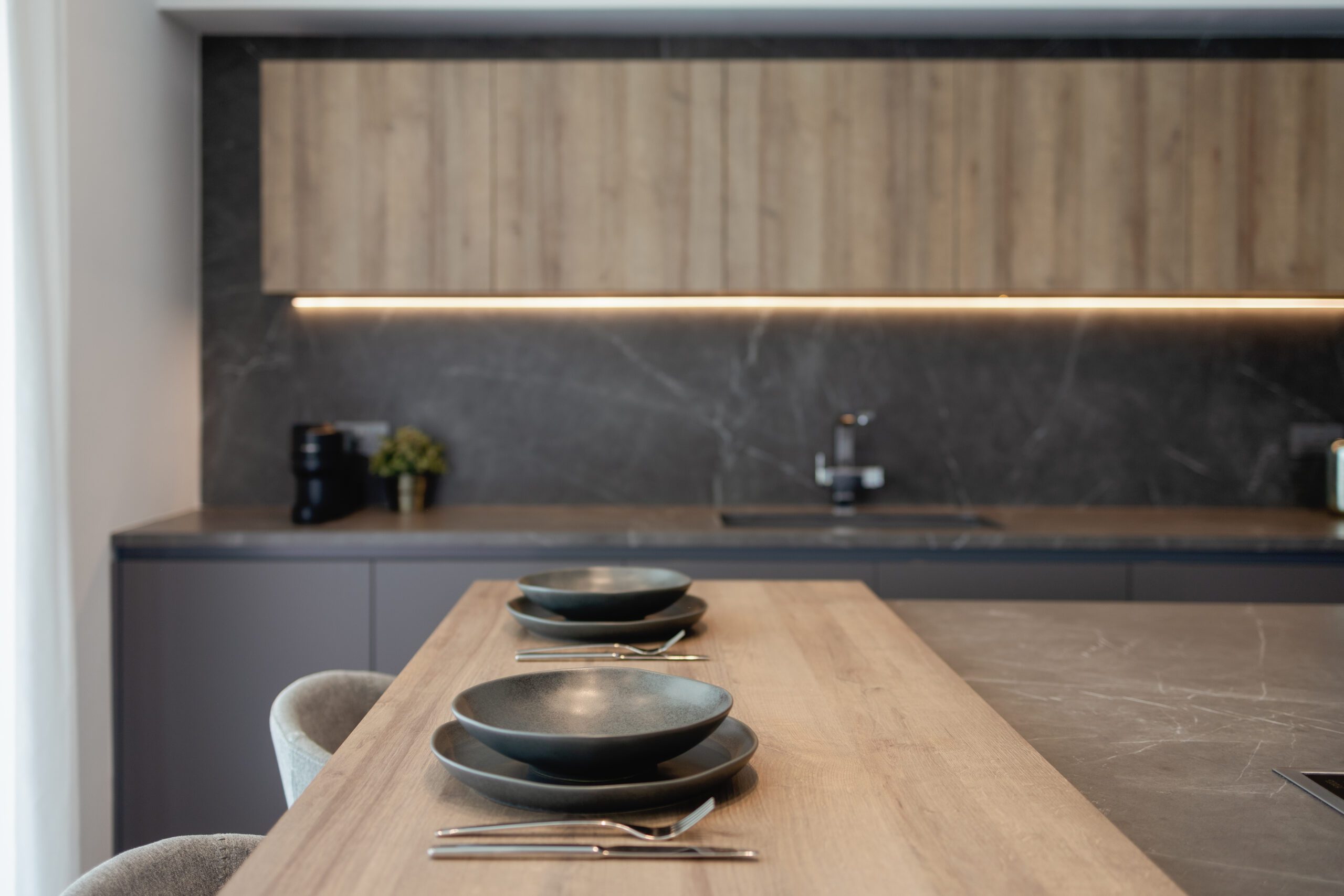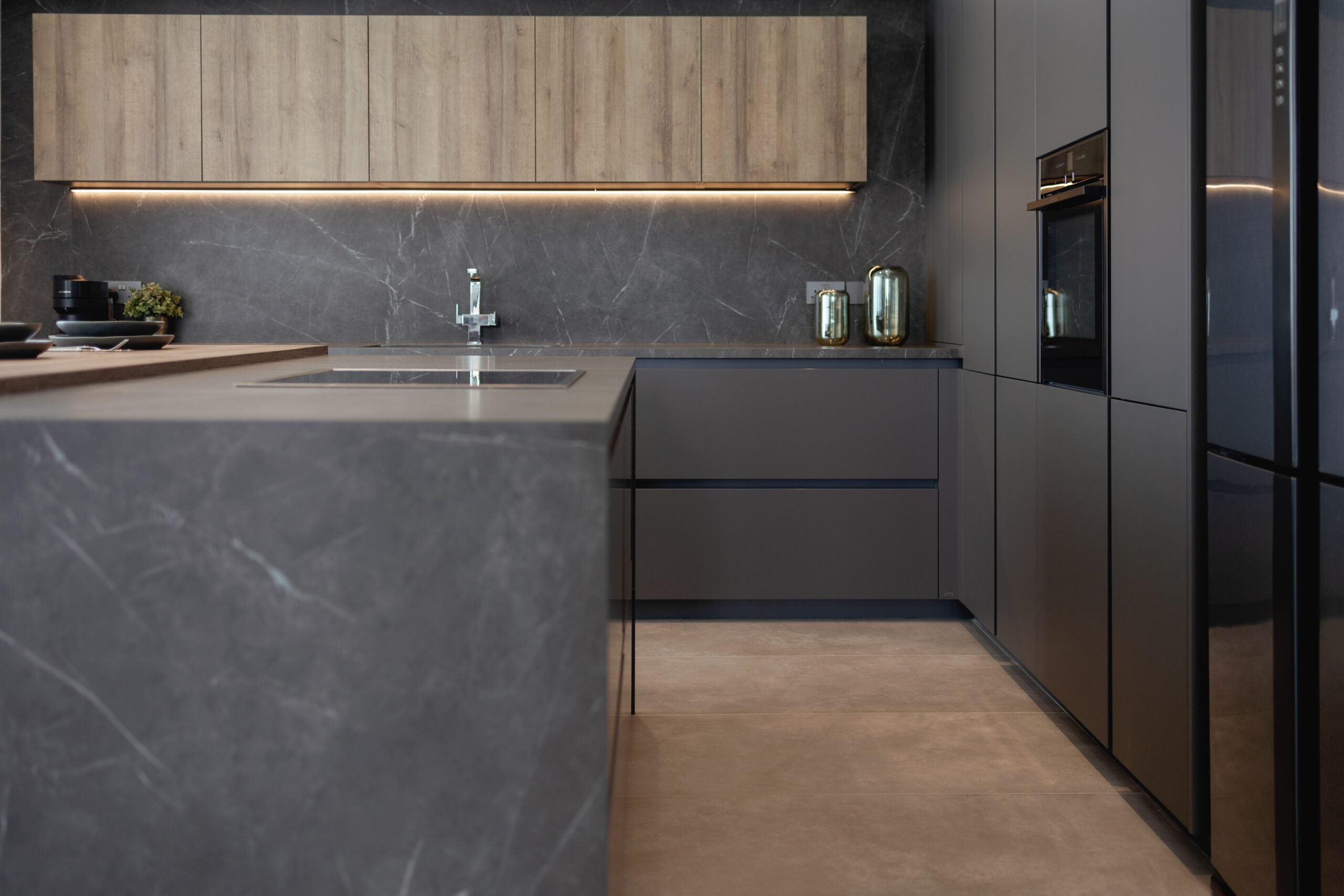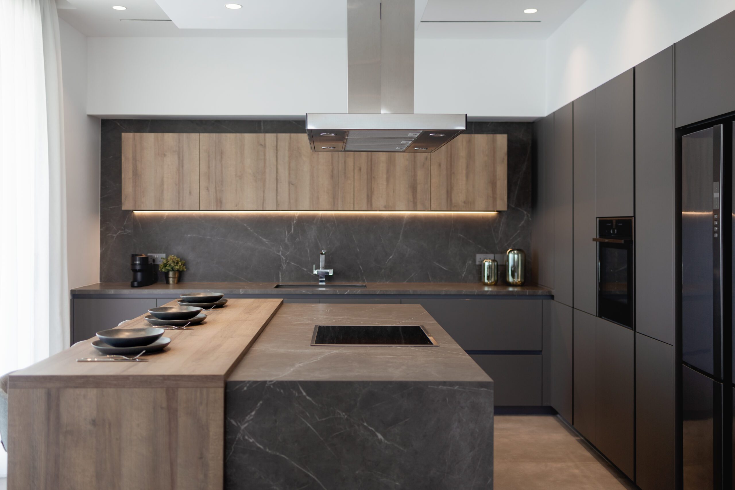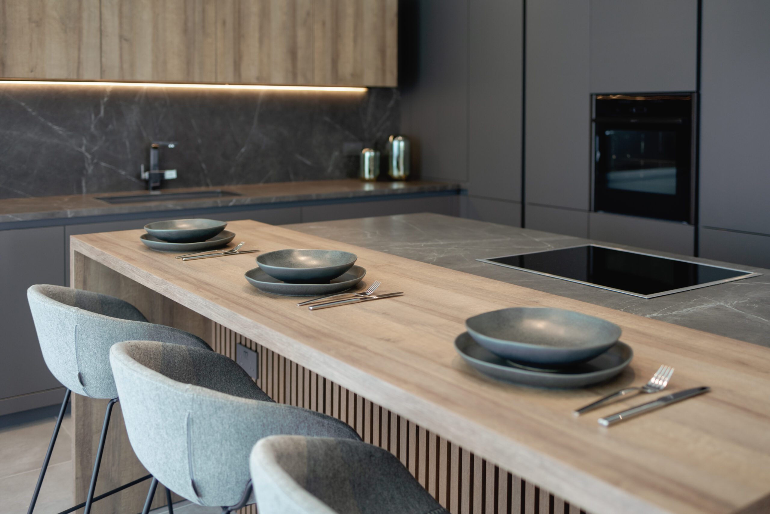 LAIN PLAN by Euromobil, Tecnolamina in matt colour finish with Lavagna & Tss in wooden effect finish – Ontario Oak.