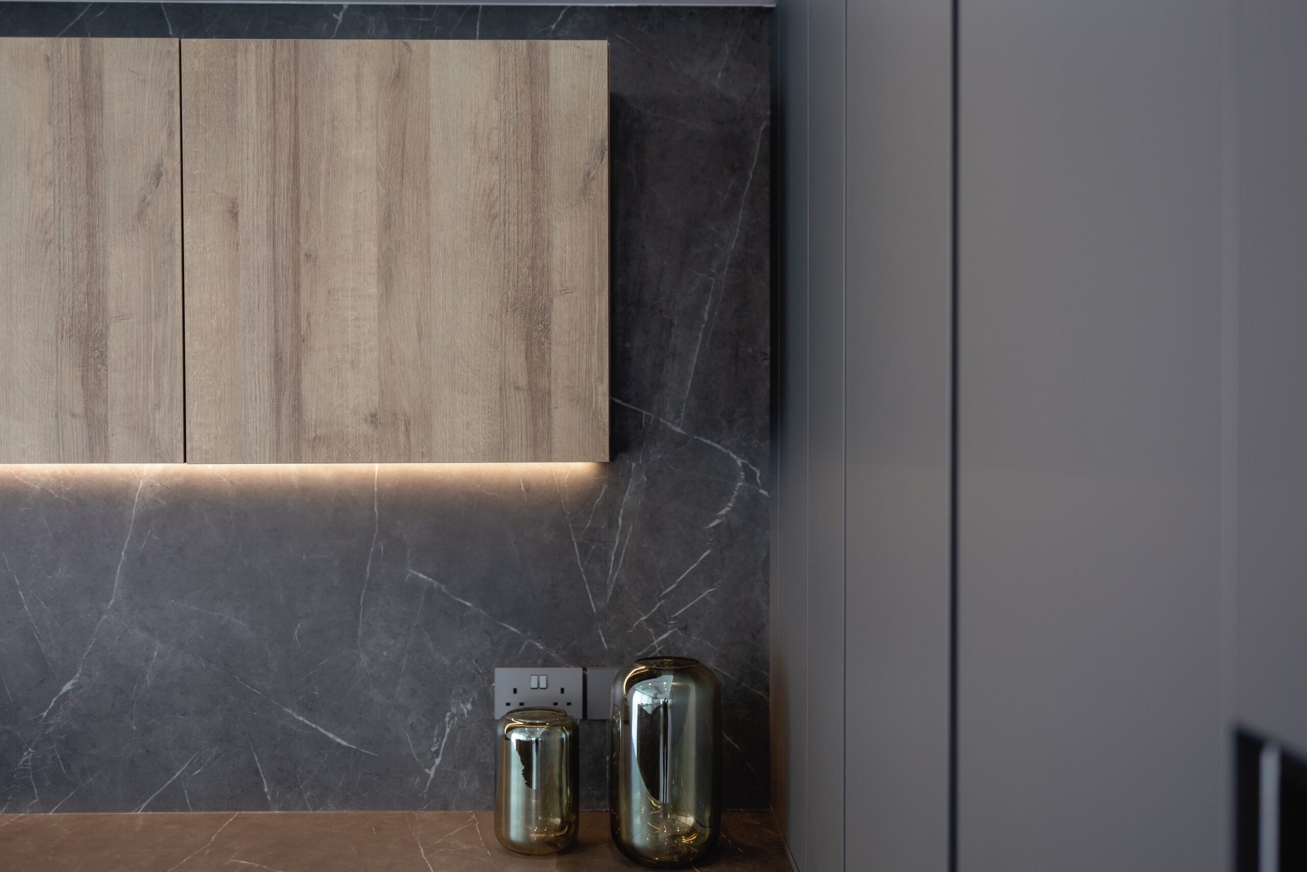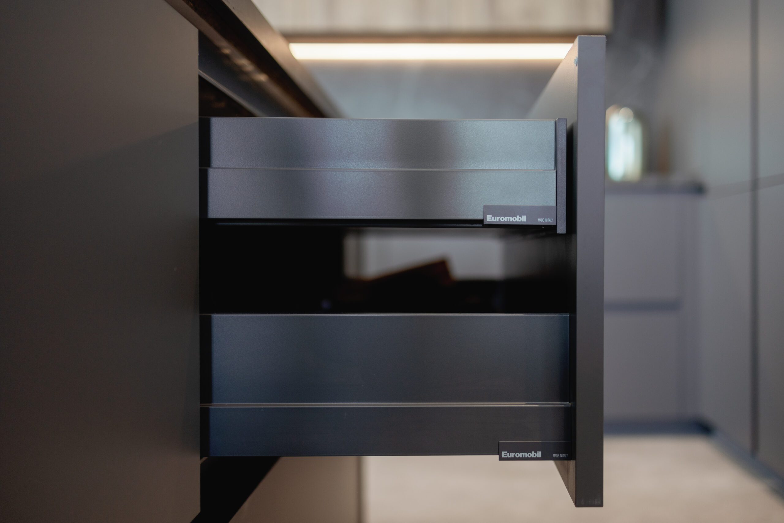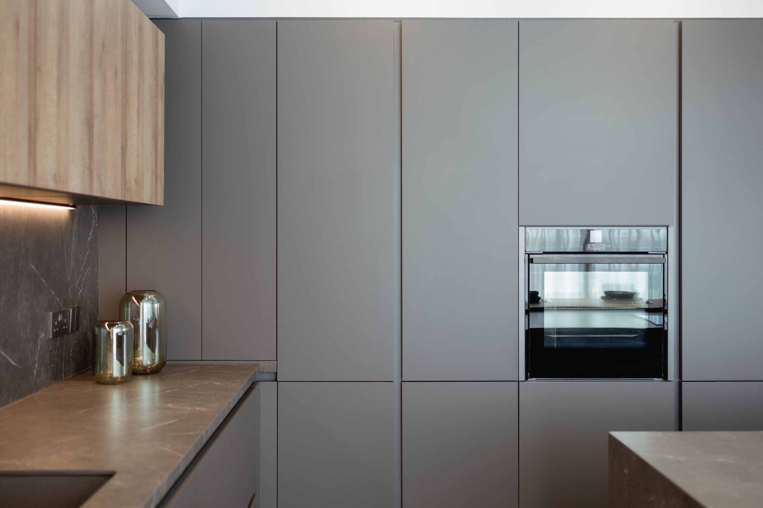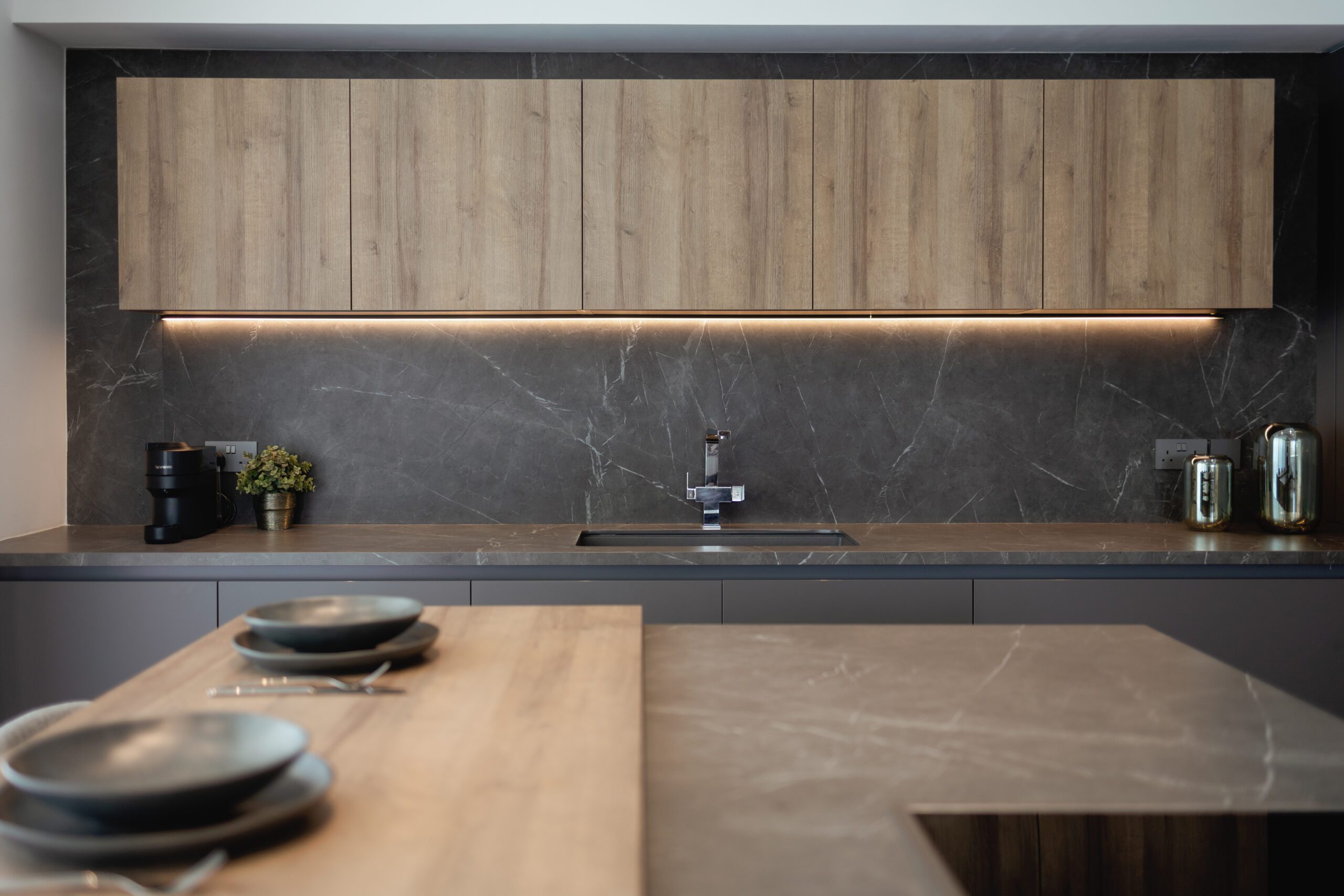 LAIN PLAN by Euromobil, Tecnolamina in matt colour finish with Lavagna & Tss in wooden effect finish – Ontario Oak.