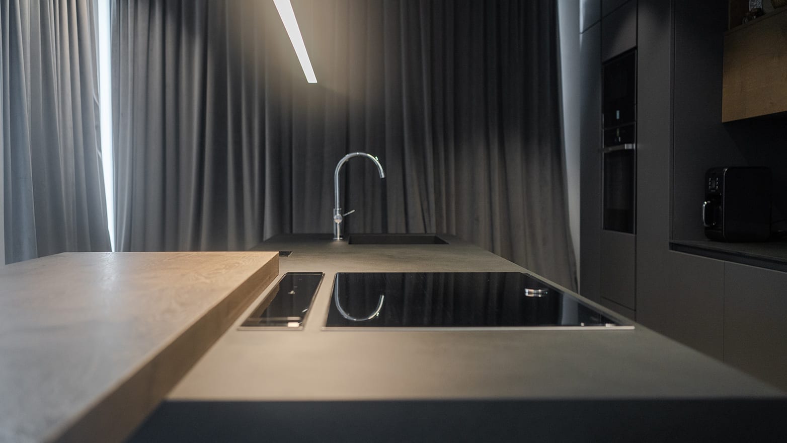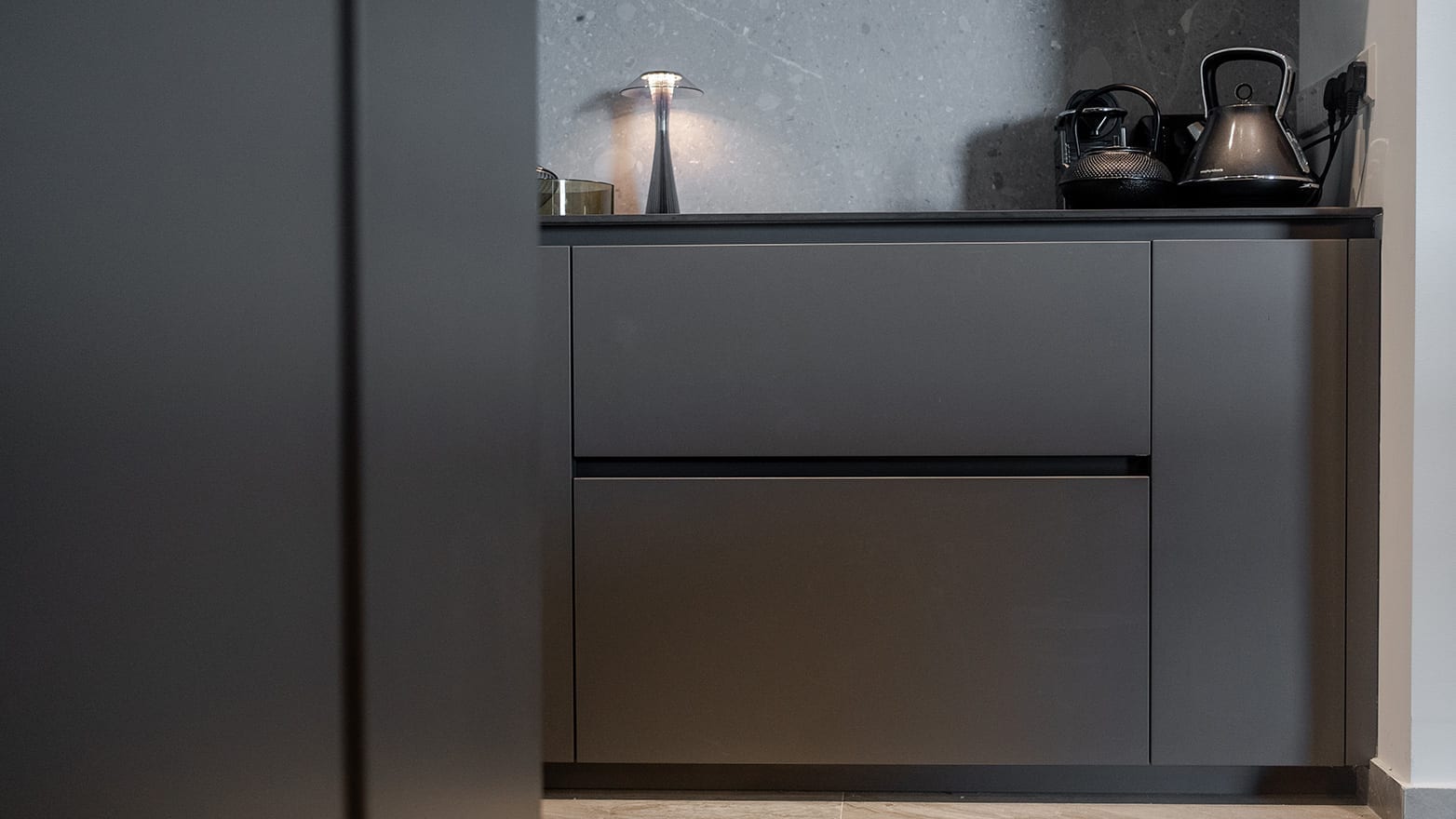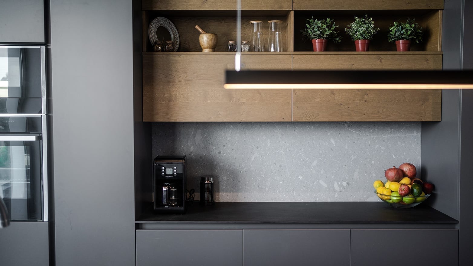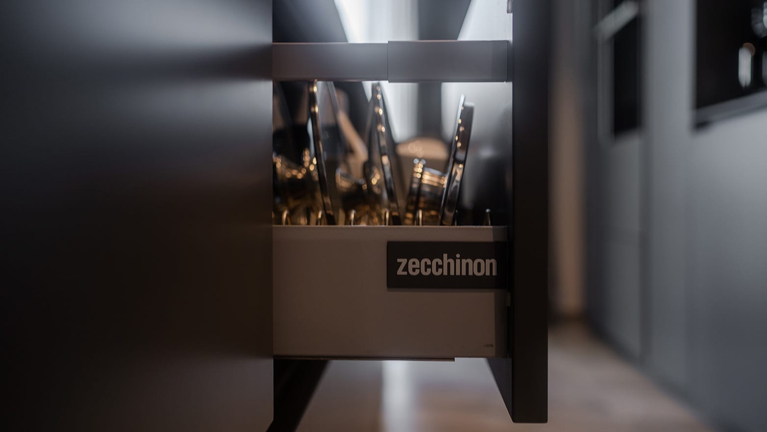 Zecchinon Cucine’s K105 and System Kappa provided the basis for the development, in the process of creating the kitchen modules with lacquered mdf in anthracite finish.