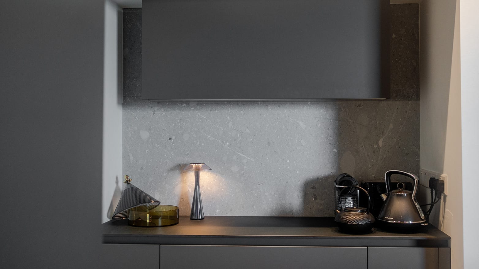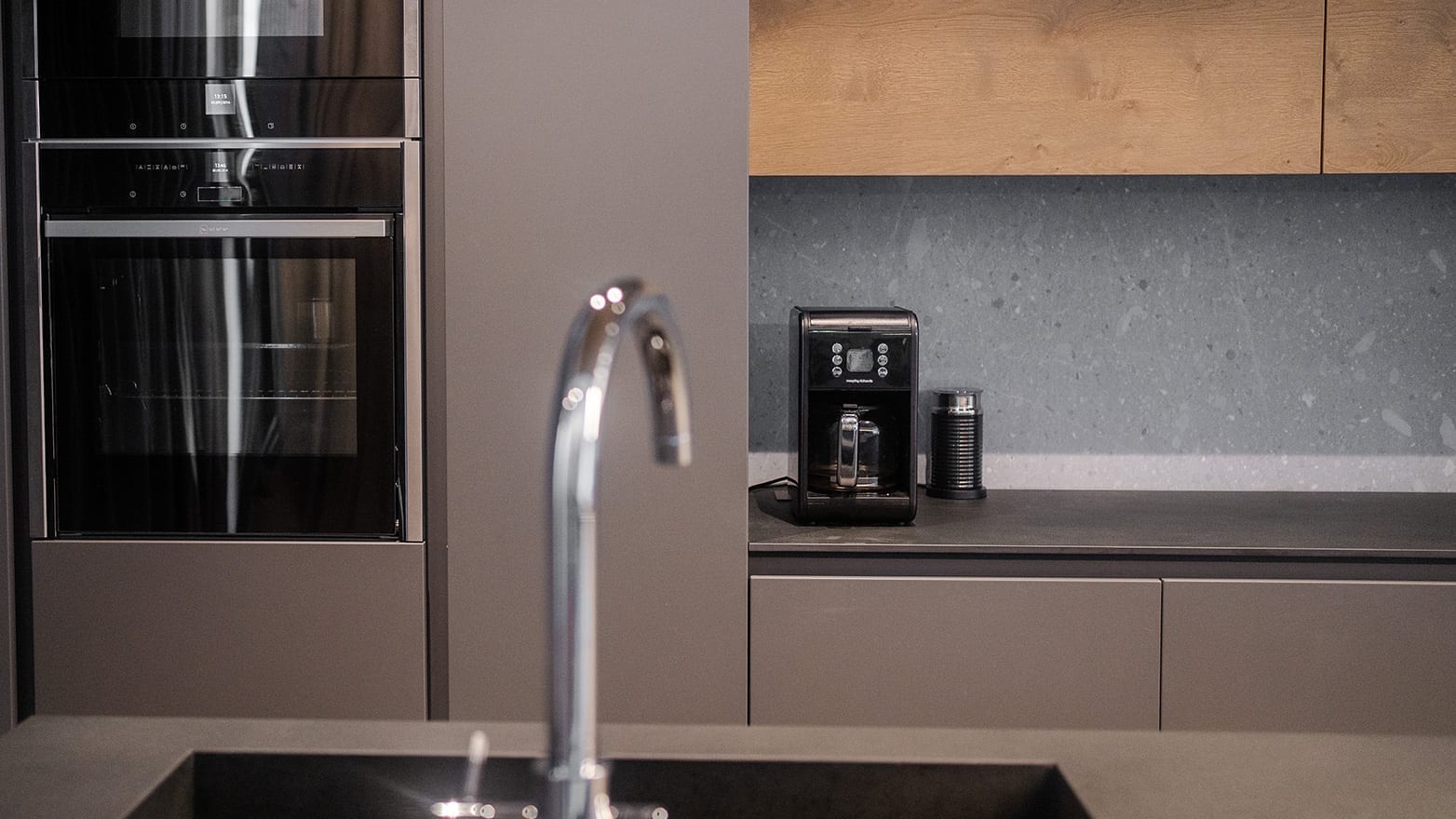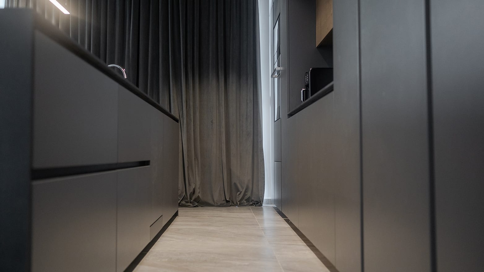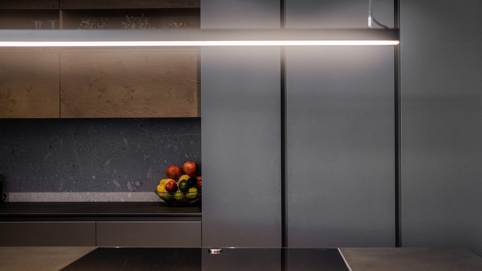 Zecchinon Cucine’s K105 and System Kappa provided the basis for the development, in the process of creating the kitchen modules with lacquered mdf in anthracite finish.