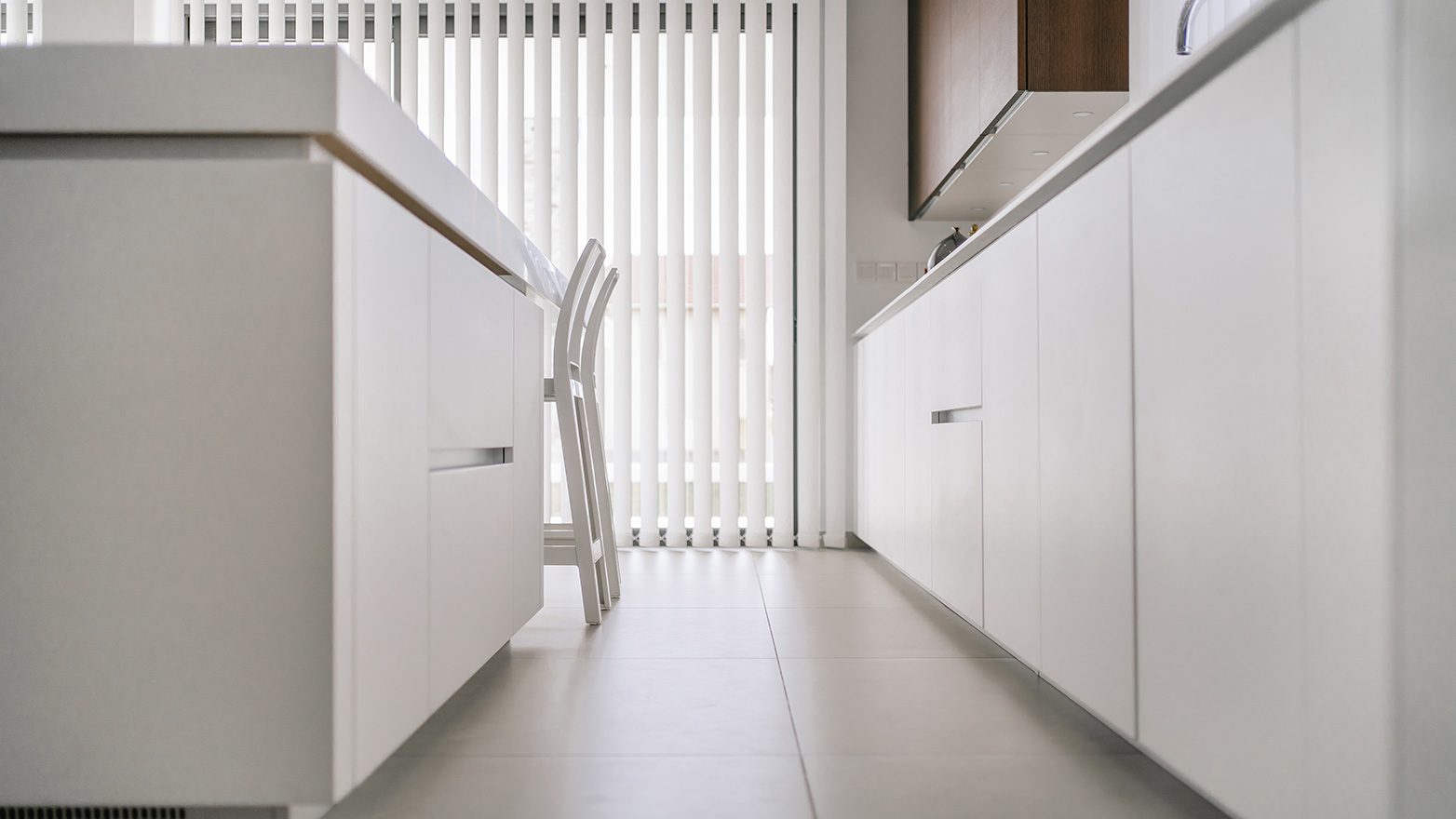 The kitchen is developed with two distinguished models of Zecchinon Cucine; Kalea is selected in milky white matt finish for the back wall area and central, kitchen island, while at the forefront service area and for the upper assistive units tobacco oak modules are designed in approach of an intimate, naturalistic style.