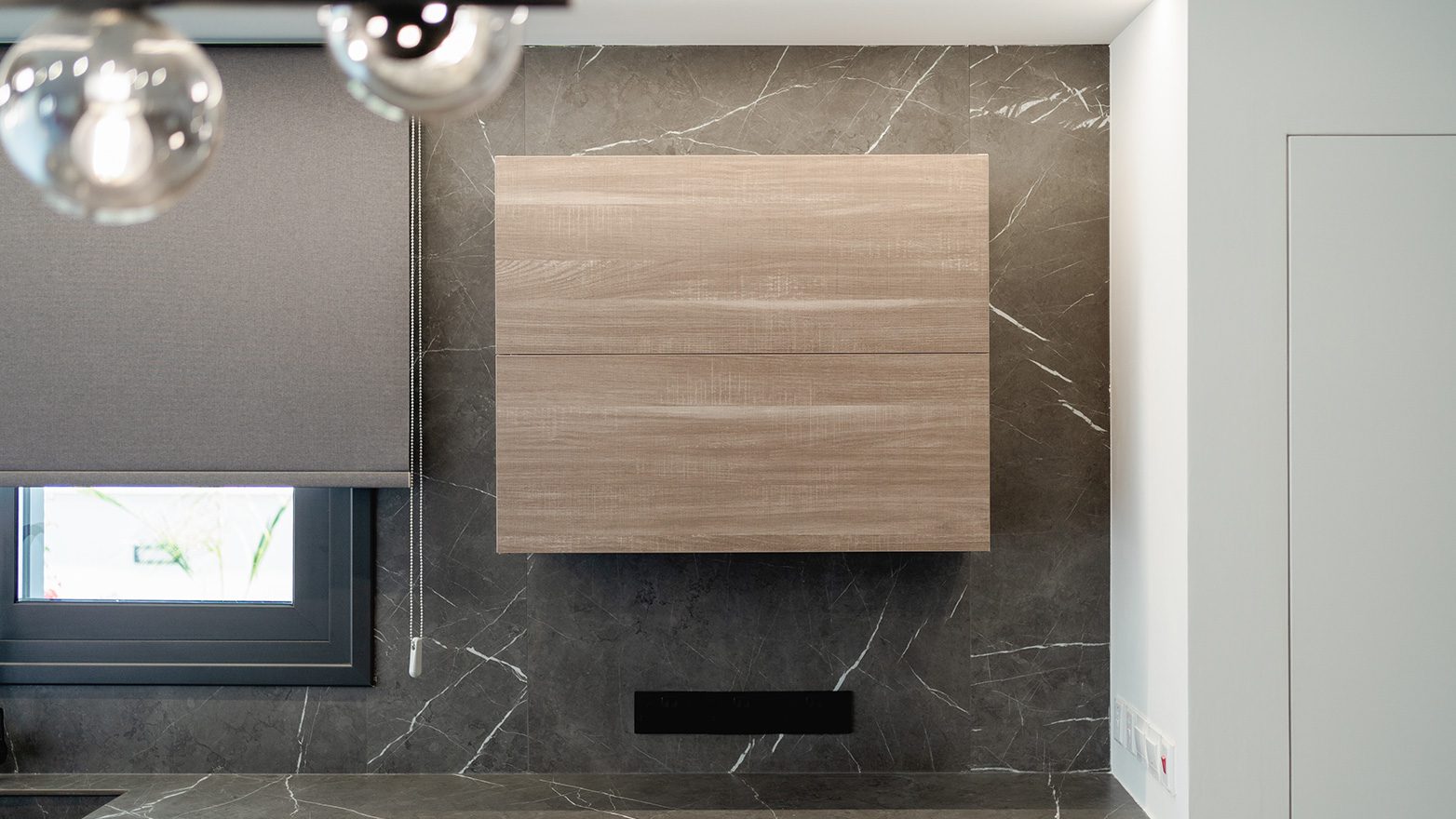 In a closer look, peripheral kitchen units with smooth lacquered MDF in Platino matt color finish, seamlessly integrating home appliances, and kitchen island and lower units with melamine in Rovere Sinai wooden effect finish taking part to the texture/chromatic polyphony.