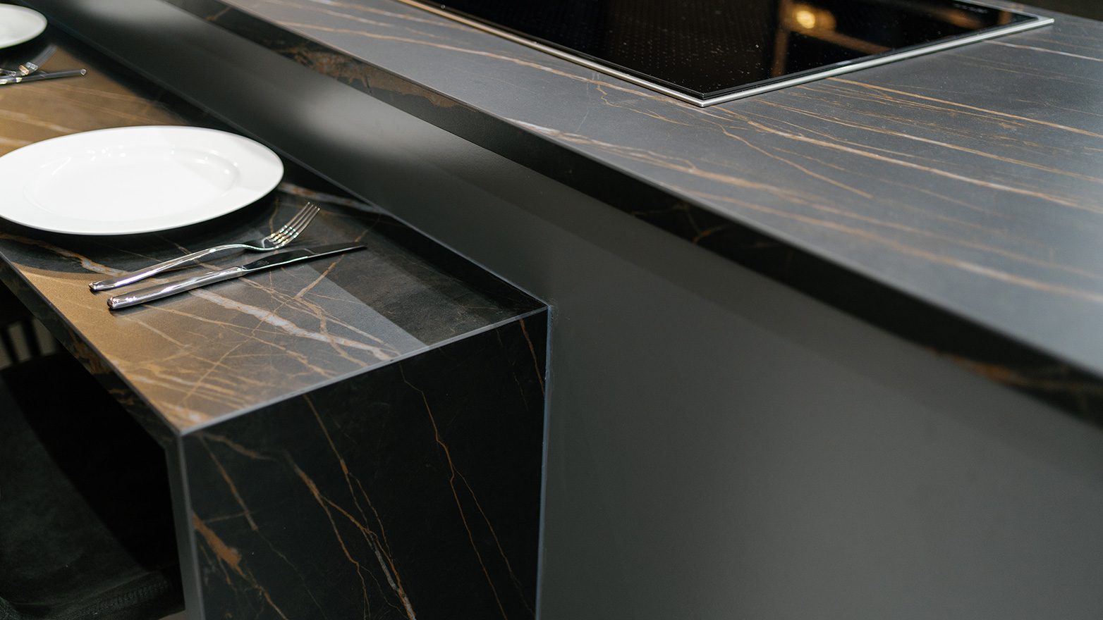 Taking a closer look, peripheral assisting units are developed with melamine in wooden effect, Rovere Torba finish, while the units above the counter area are matched with the kitchen island drawers, developed with smooth melamine in matt color, Grigio Onice finish.