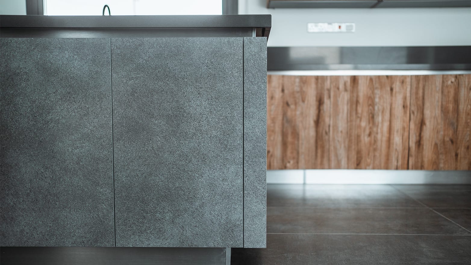 The earthly tones of the synthesis modules are developed peripherally in sherwood miele finish and for the central kitchen module in the cement-like, pietra arenaria finish.