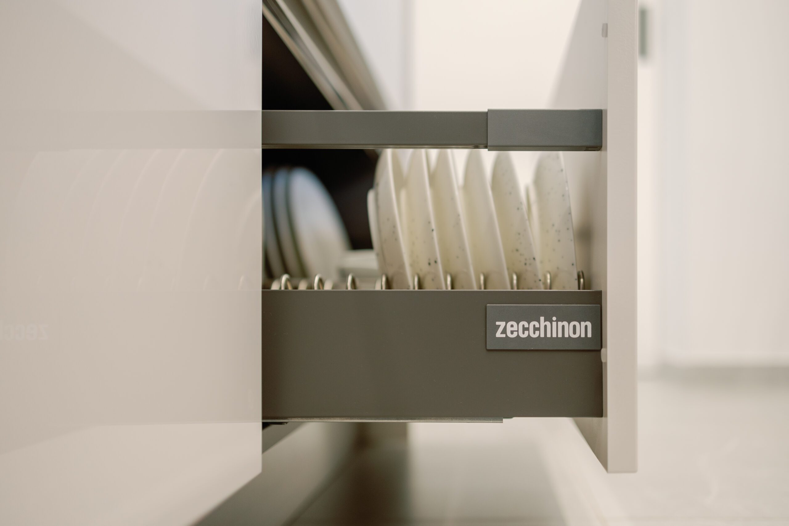 Kalea Model by Zecchinon in wooden finish – Rovere Paglia & Smooth polymeric in gloss colour finish – Grigio Seta Lucido.