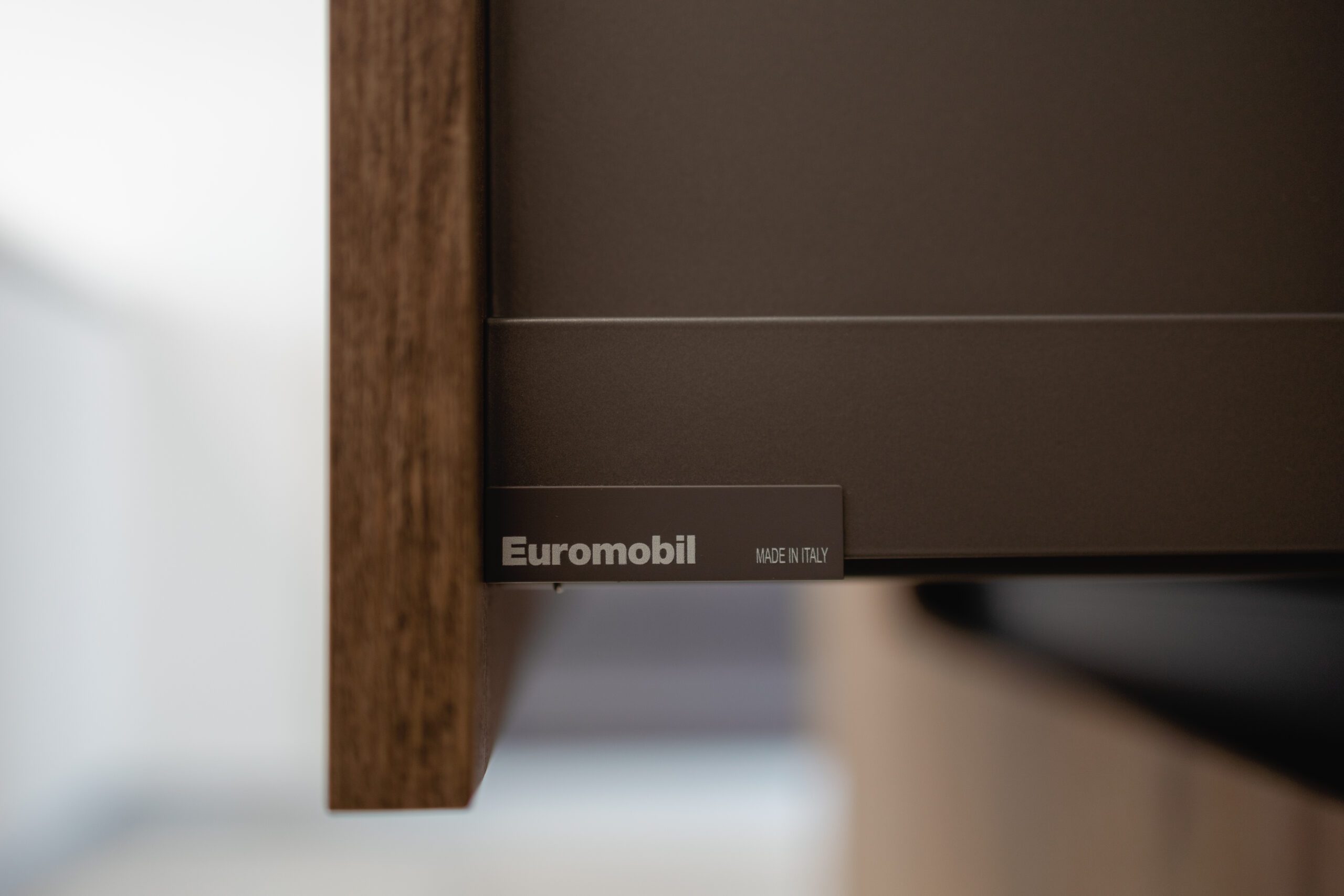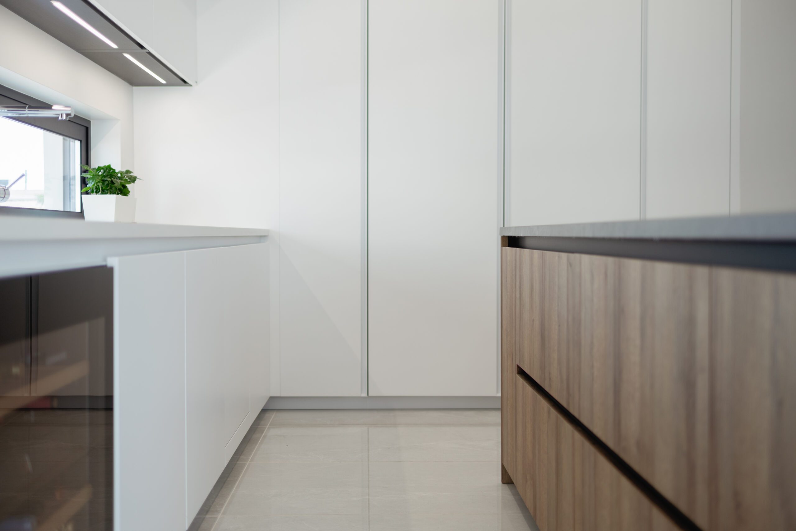 Filo Lain Model by Euromobil in matt colour finish – Optic White & Thermostructure in textured wood-grain effect.