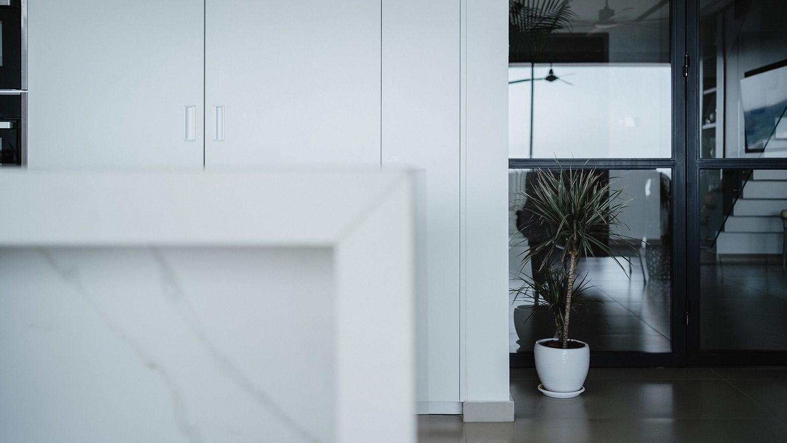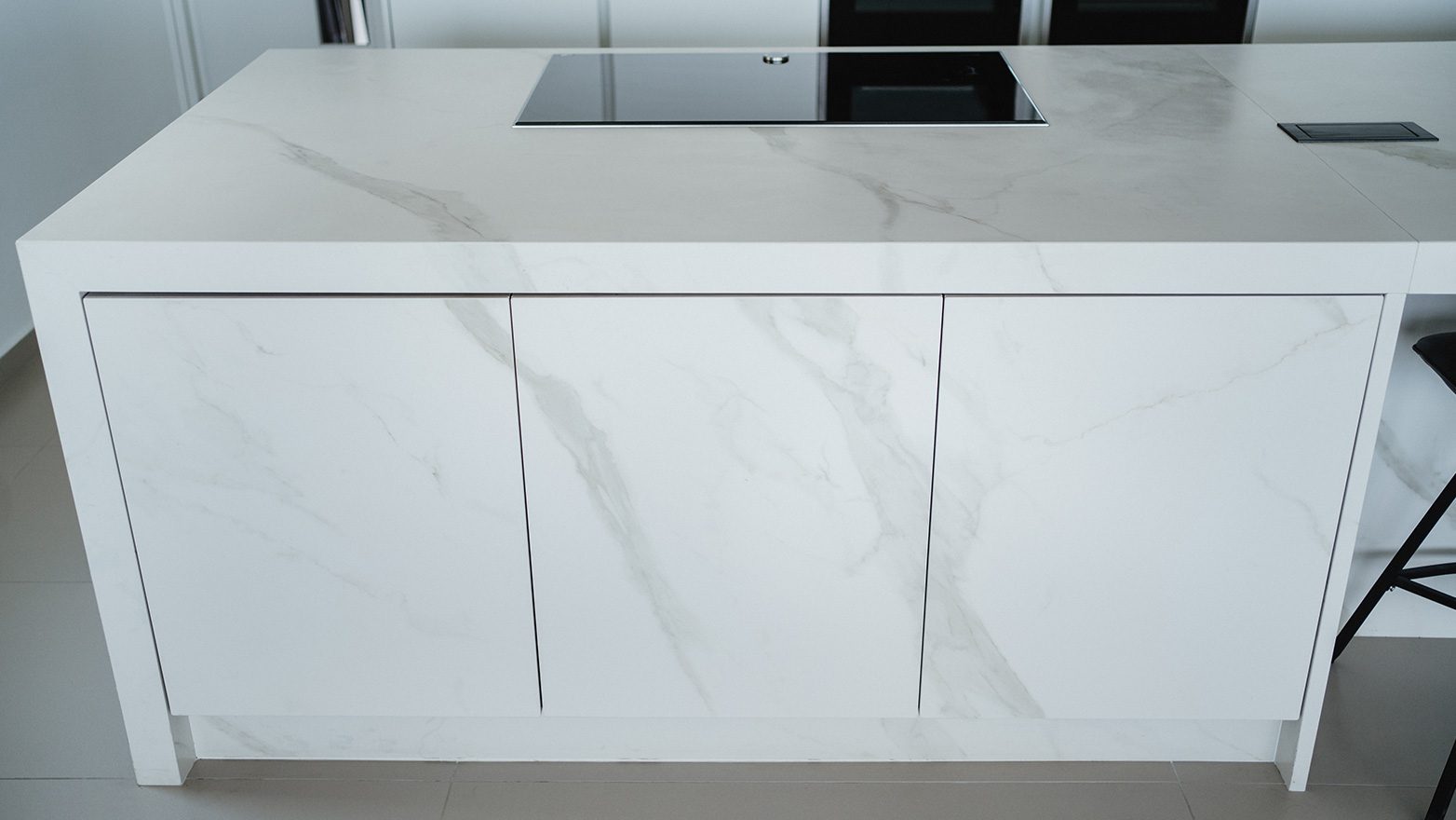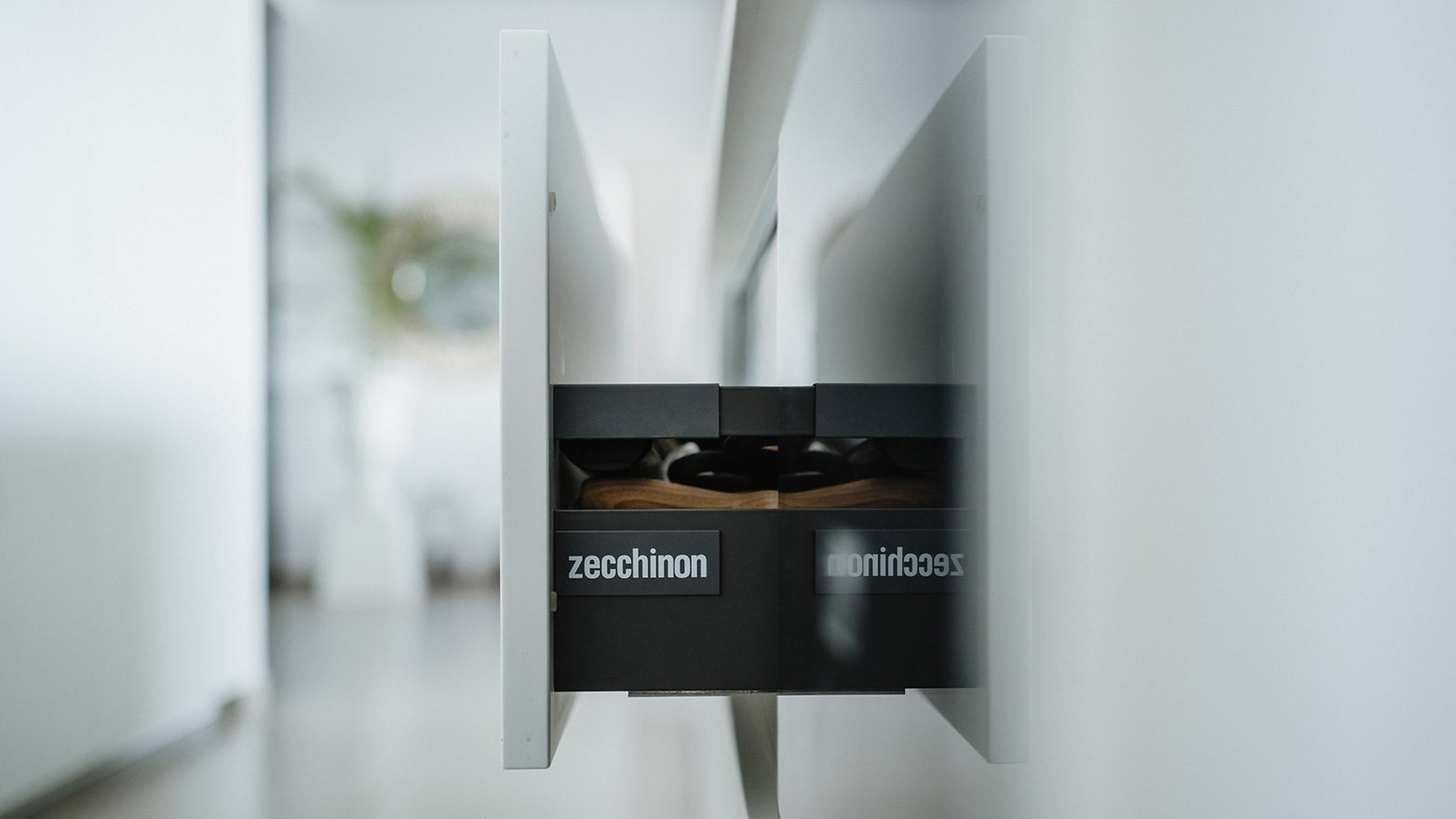 In development, Zecchinon Cucine’s K105 mdf lacquered in white matt finish was selected for almost every kitchen modules, for the highest possible functionality and flexibility in the area, in exception of the aesthetically matched Laminam Calacata doors on the front kitchen-island modules