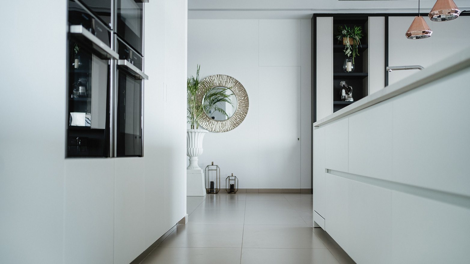 Decoding the kitchen synthesis in terms of special adjustments – a coffee station with pocket doors and a wine cooler space were created, while the peripheral modules were designed in a way that fully integrates the fridge and freezer appliances.