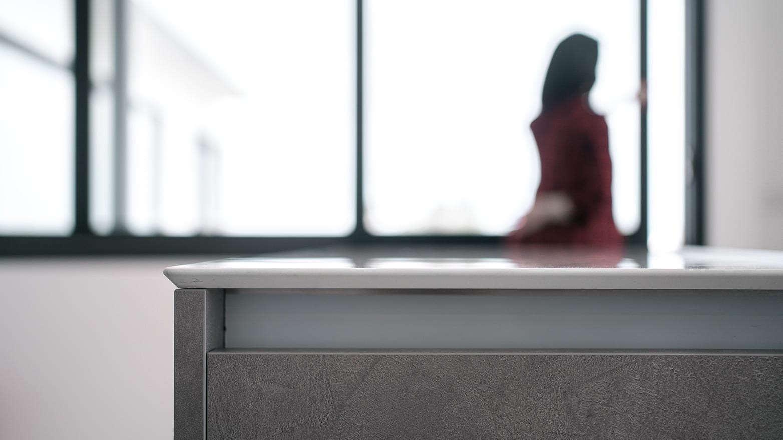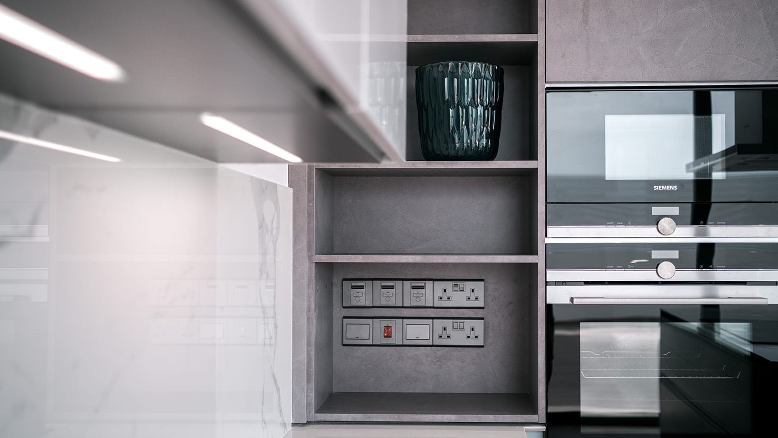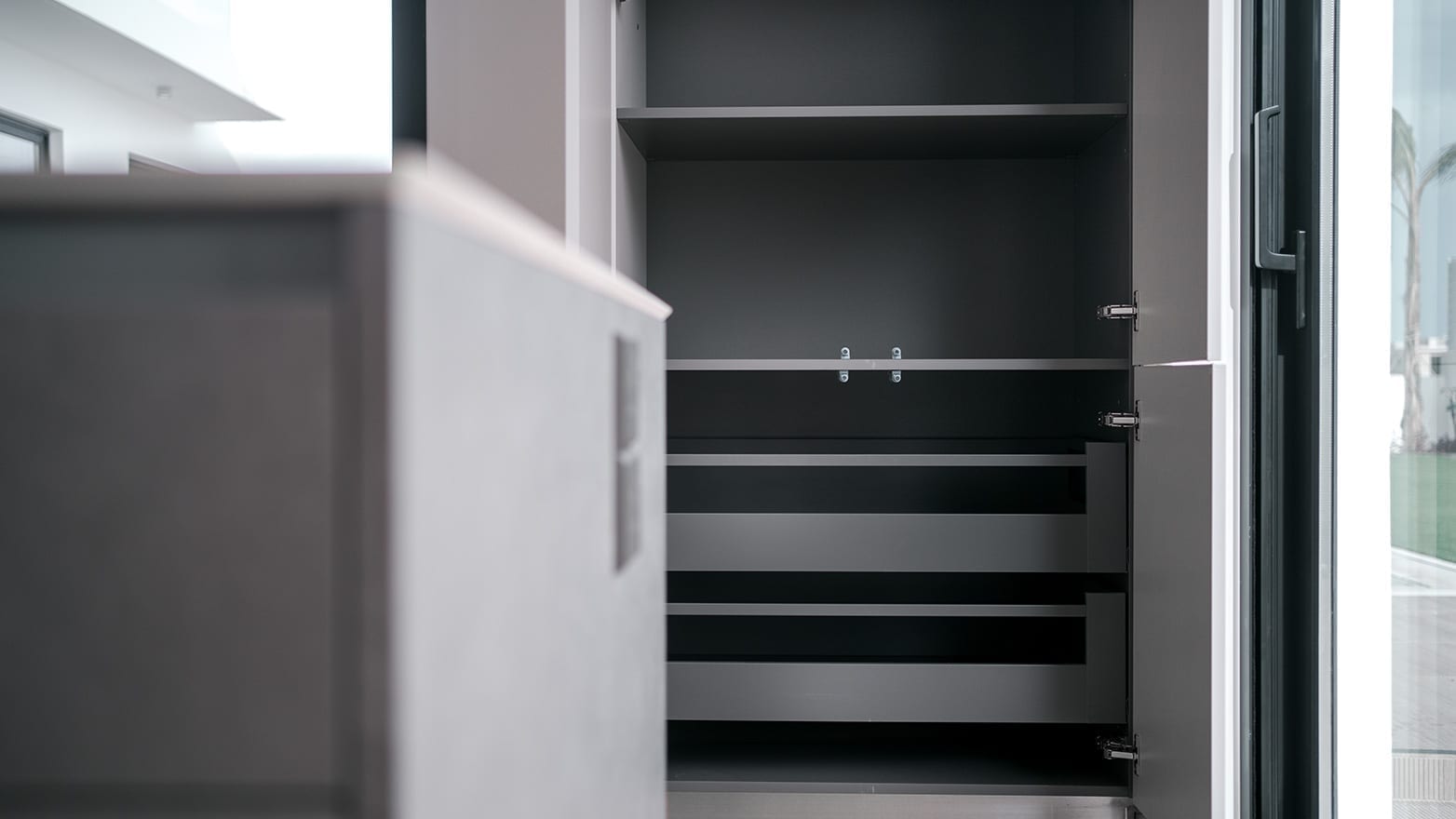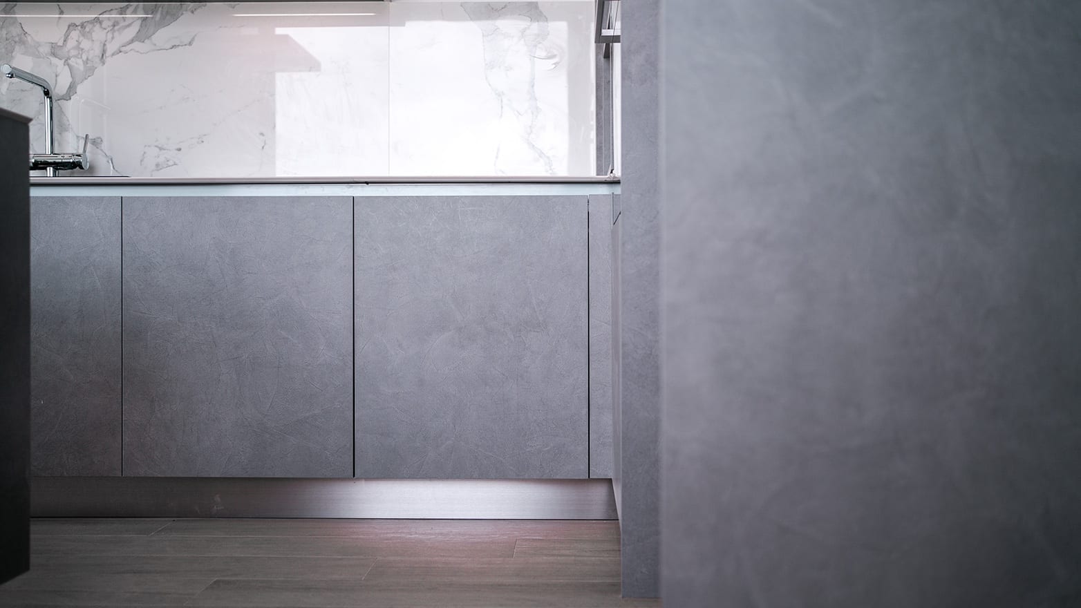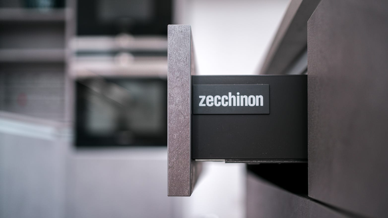In detail, modules on the kitchen island and peripherally are developed in Zecchinon Cucine’s Kalea Grigio Seta gloss and Helene Calce Cement finish, possessing the functional dynamic of materials and system that makes a personalized everyday experience.