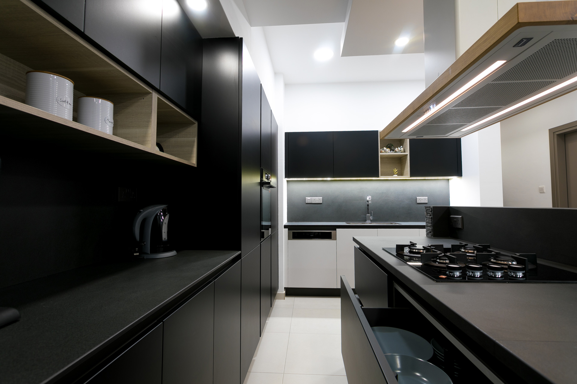 where the kitchen polymeric laminate surfaces create an exceptional ambiance due to the black chromatic synthesis of matt, nero matt and grigio set matt.