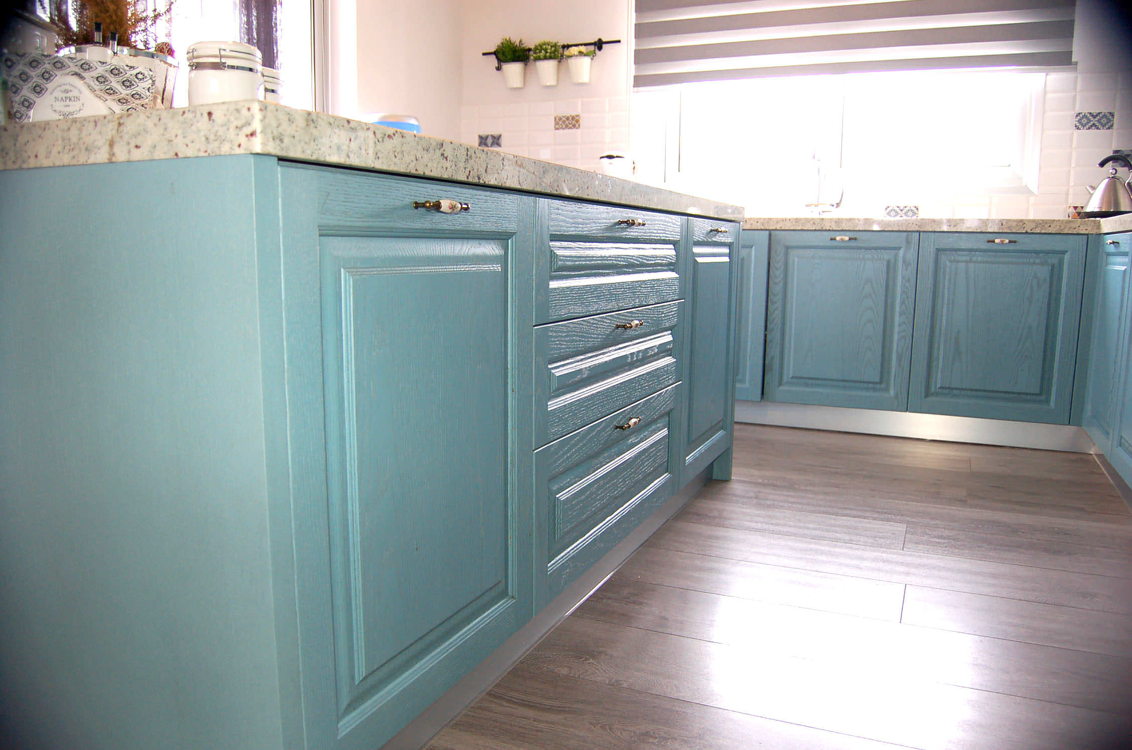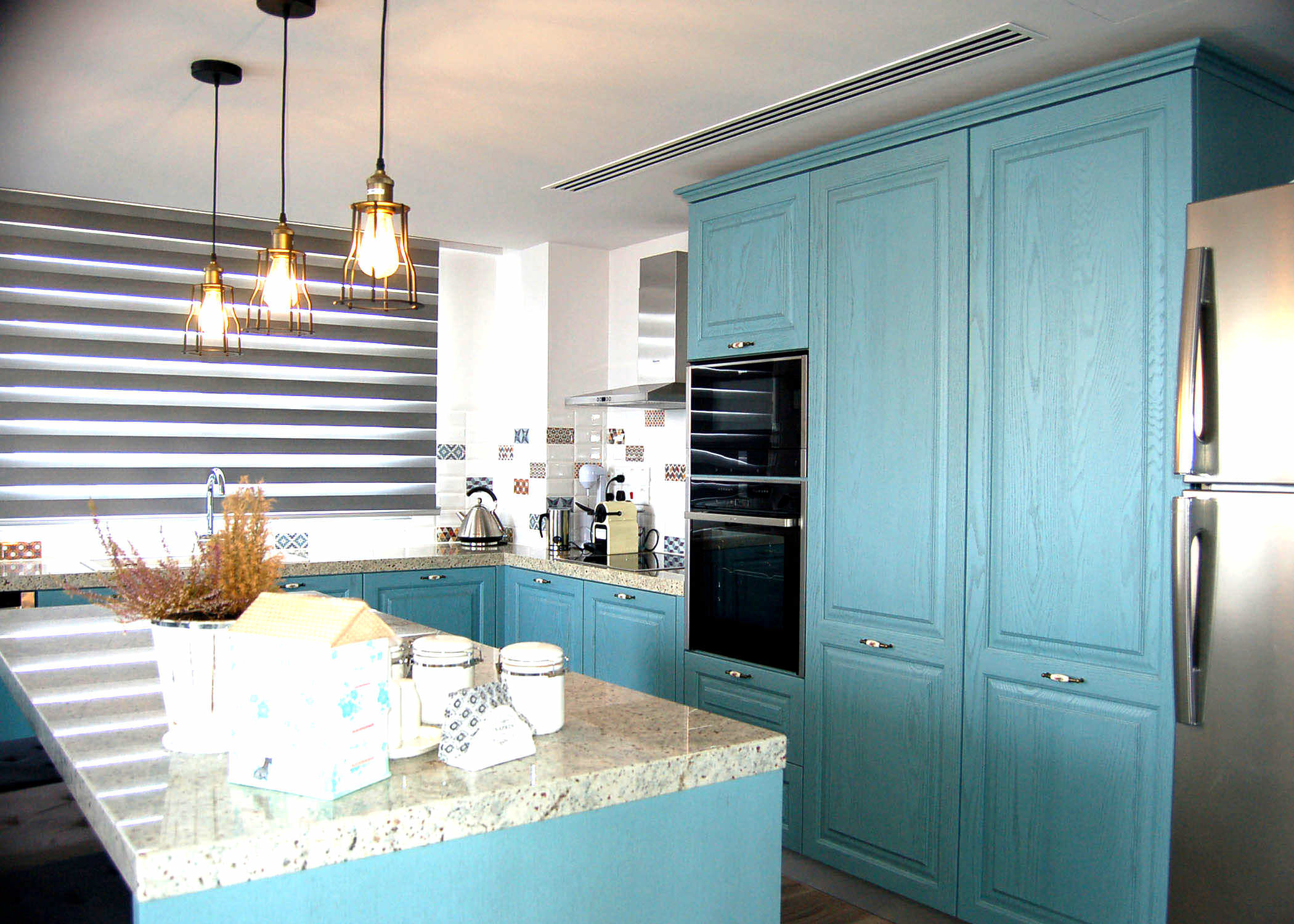 The solid wood in light blue compliments the kitchen area, as the design synthesis creates a nostalgic feeling that celebrates the #morethanliving concept.