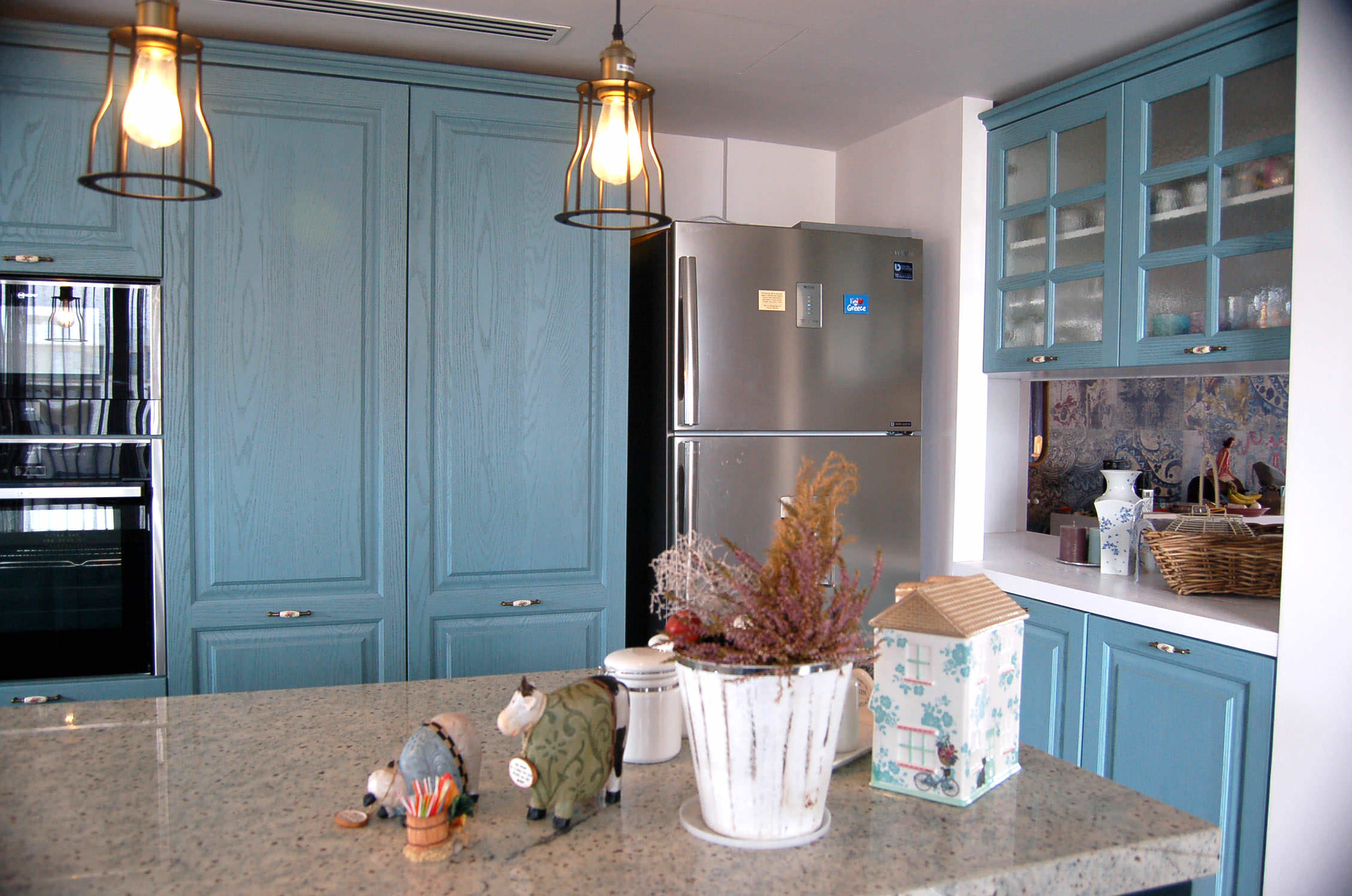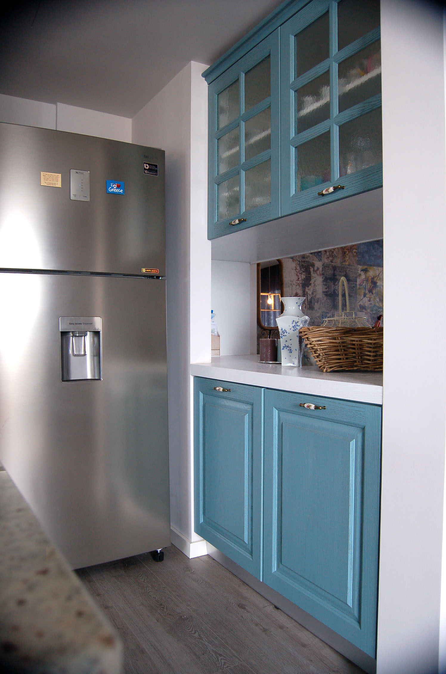 The kitchen is designed to represent a vintage style, while it contributes to the modern living with its functional elements to purpose in the every day use.