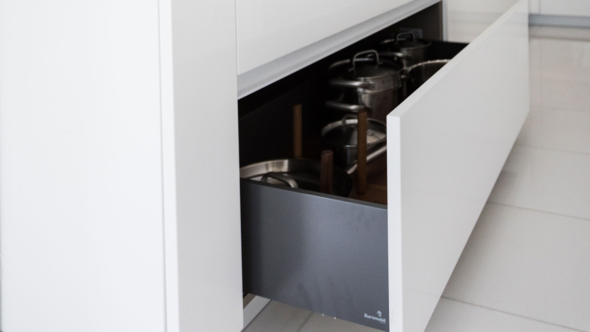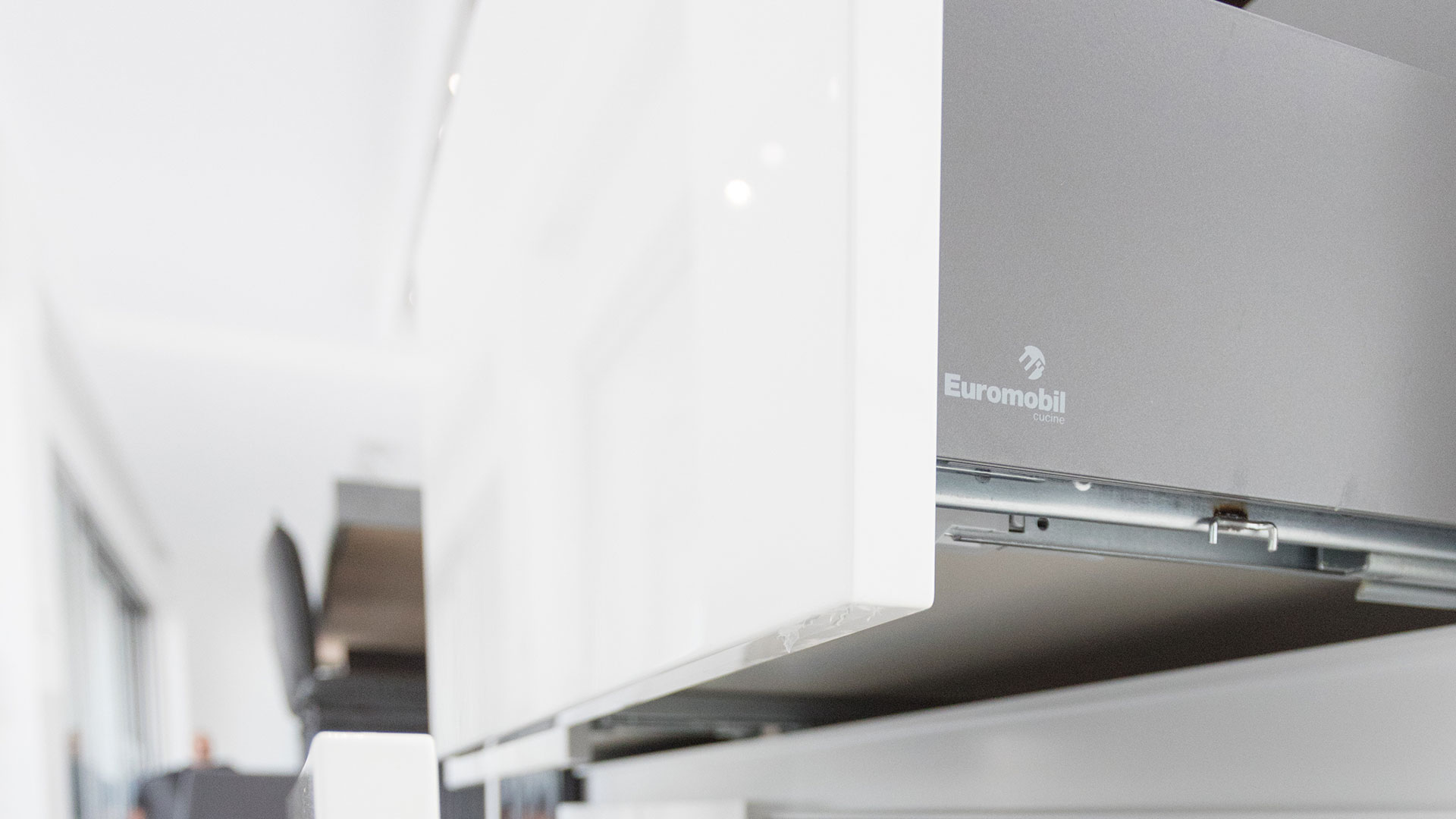 The new kitchen is designed with Gruppo Euromobil Filo Antis model in white gloss lacquered mdf,