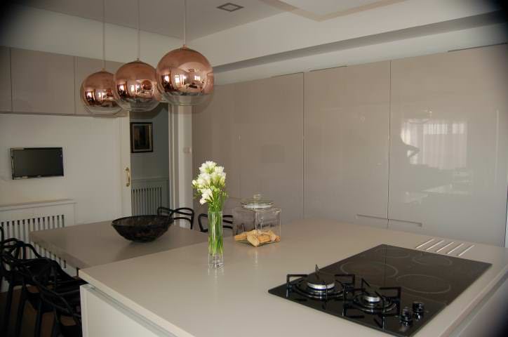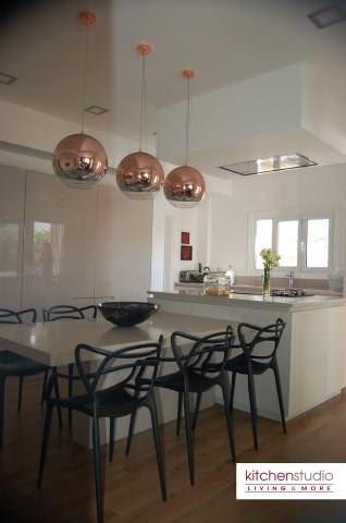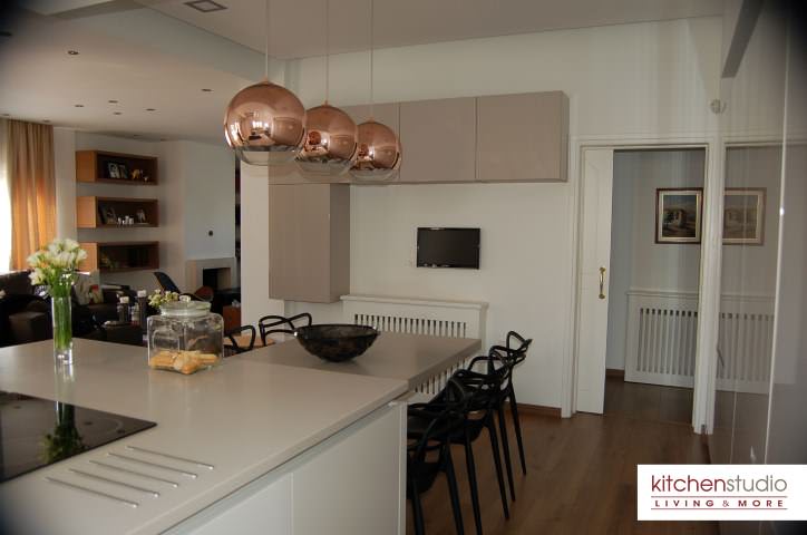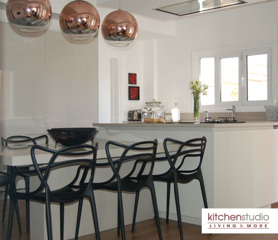 Modernism meets Innovation, in this beautiful house in Larnaca. The kitchen project developed by our interior design team is characterized with an uncluttered innovative design that is a combination of Gruppo Euromobil inspired styles, Asim and Filo. The Asim models add functionality in the kitchen area with the exclusive handle asymmetric and with the M35 Pull & Side Door system that are considered to be the main marks of originality. Additionally, the Filo Escape inspired surfaces in cashmere color contribute to the contemporary style of the kitchen fitting harmoniously with the wooden floor. Kartell’s black themed Master Chairs and Moon Bowl in smoke color come to complete the aesthetically result, conveying the essence of modernism.
