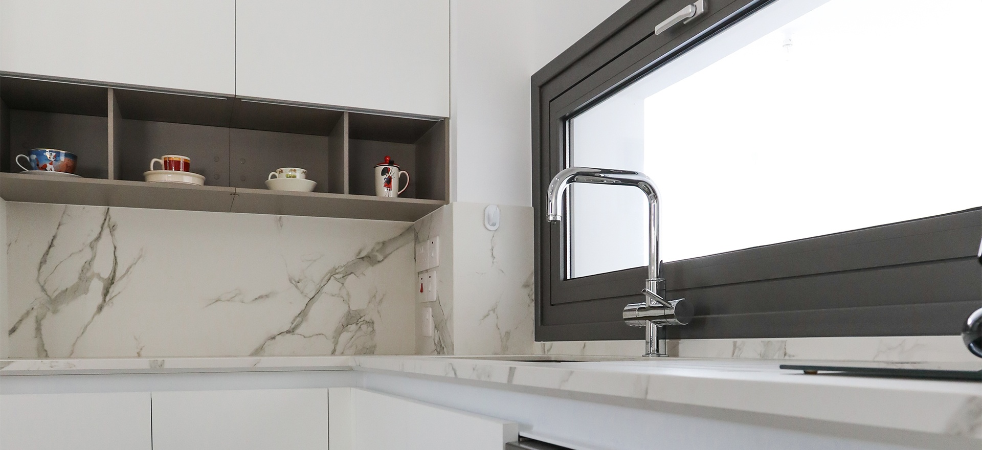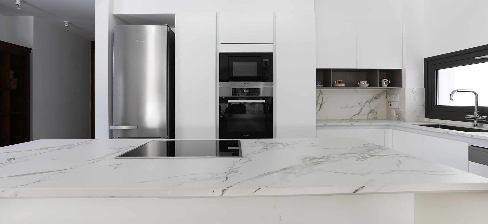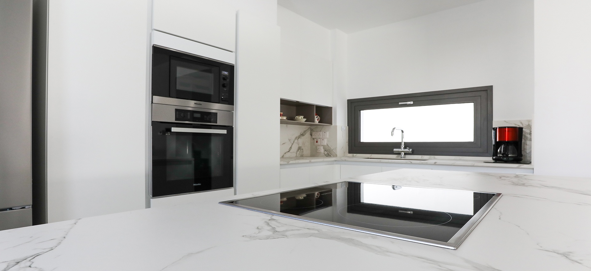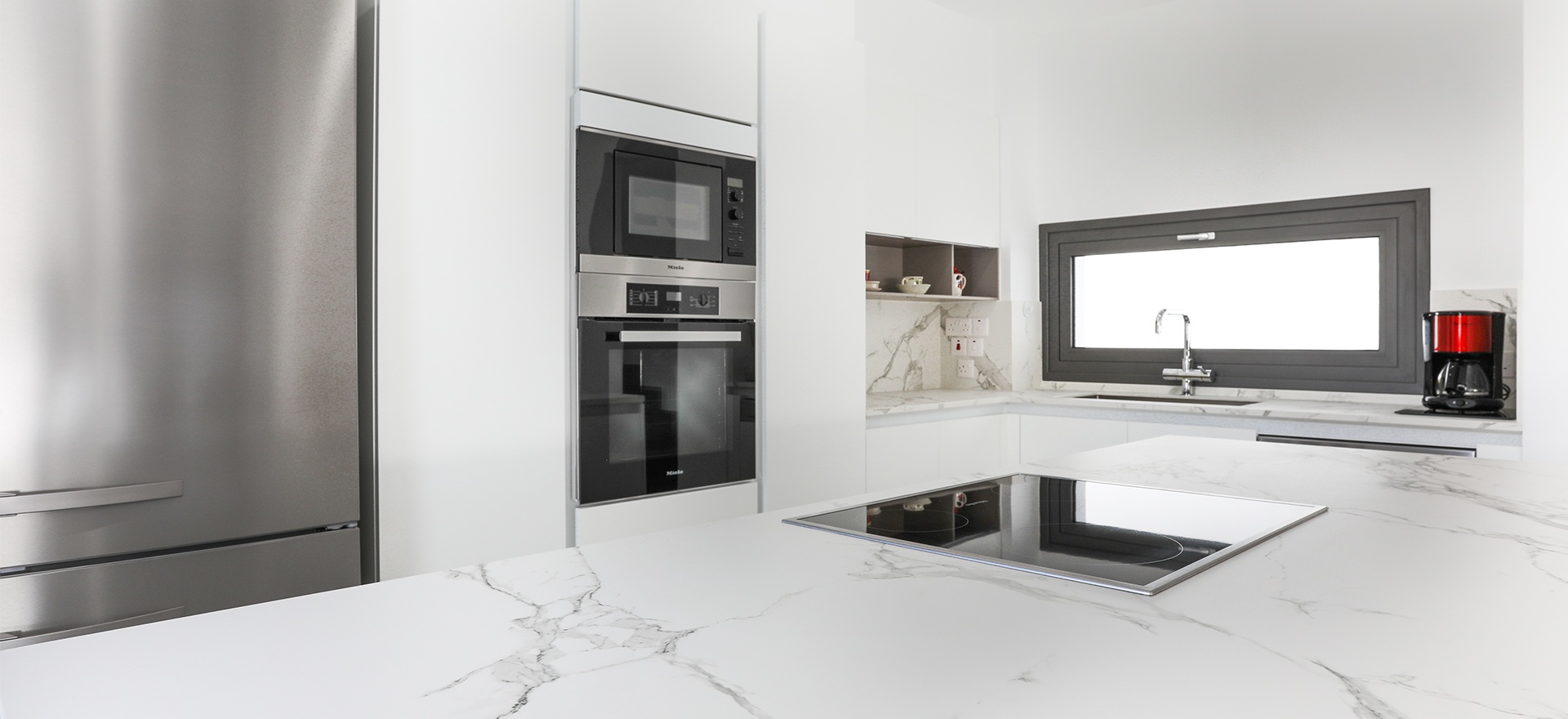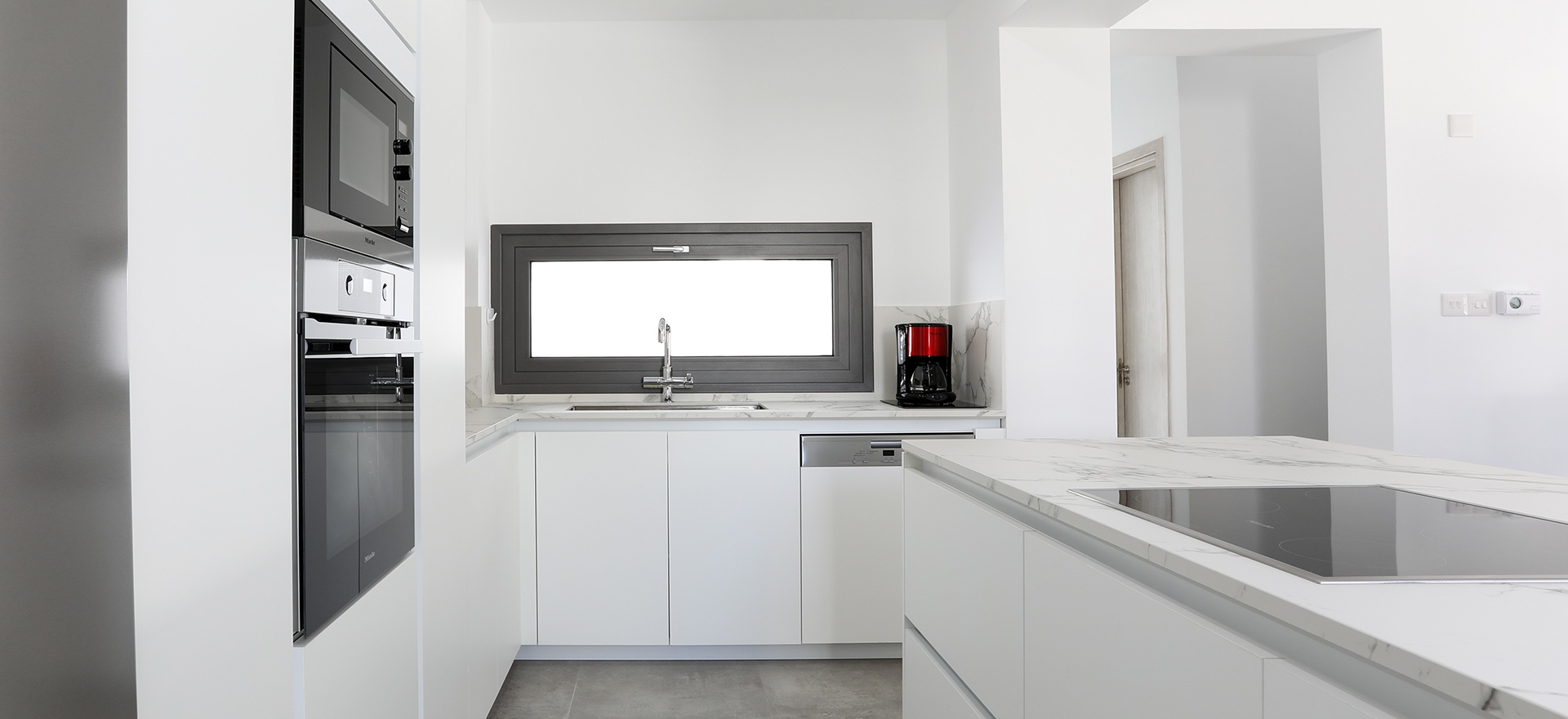 Kitchen Studio Living & More Interiors Designers’ latest project can be found at a modern residence in Livadia. Gruppo Euromobil’s Filo Lain is the basis for an eye-catching result, a kitchen that considers all aspects of convenience, found in white matt surfaces.