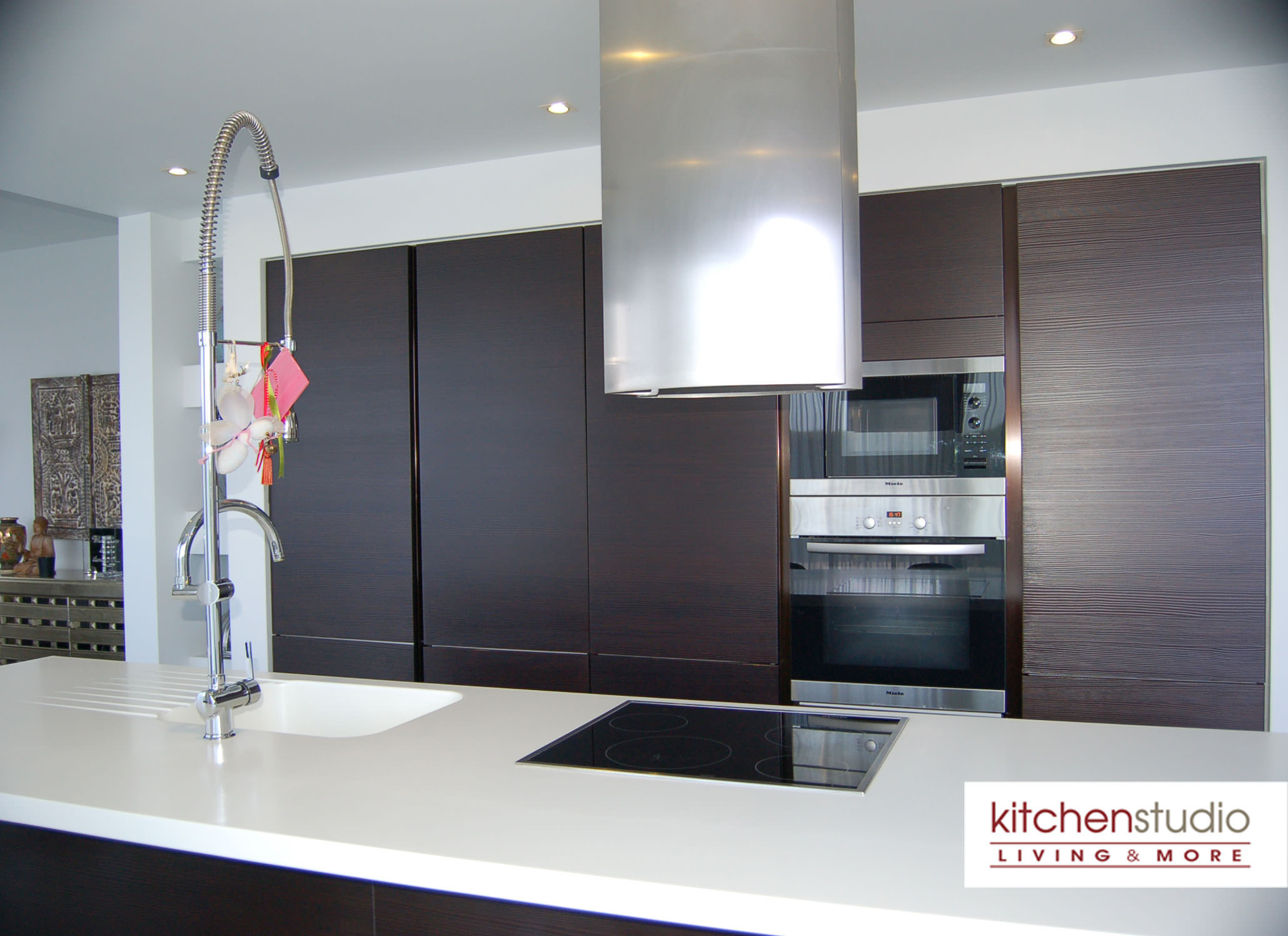 Kitchen Studio Living & More interior design team has used all the creativity and effort to design a contemporary open kitchen in this beautiful residence in Oroklini. The kitchen is formed within an organic theme with Gruppo Euromobil’s Tabula concept, an integral part of the Filo project that offers functionality and customization. Handle-free units makes it ergonomic and ideal for a family house, while the selection of the Moka Pine textures combined perfectly with the wooden flooring, transforming the kitchen area into a warm and cozy area.