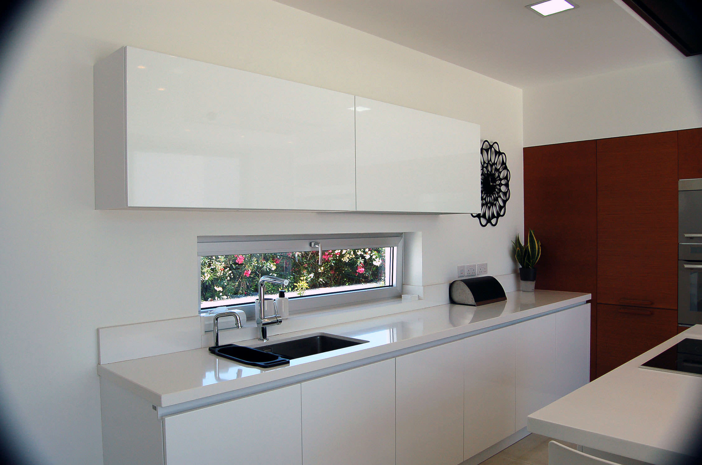 An alternative project with stylish and friendly looks. Kitchen Studio Living & More Interior Design Team presents the new modern kitchen created for the most recent project in Paralimni. Characterized by simple lines and innovative design, the kitchen was developed with Gruppo Euromobil’s Escape in polymeric white gloss finish for a stylish experience, as the storage units in veneered honey pine balance between contemporary and traditional leading to a new contemporary kitchen style.