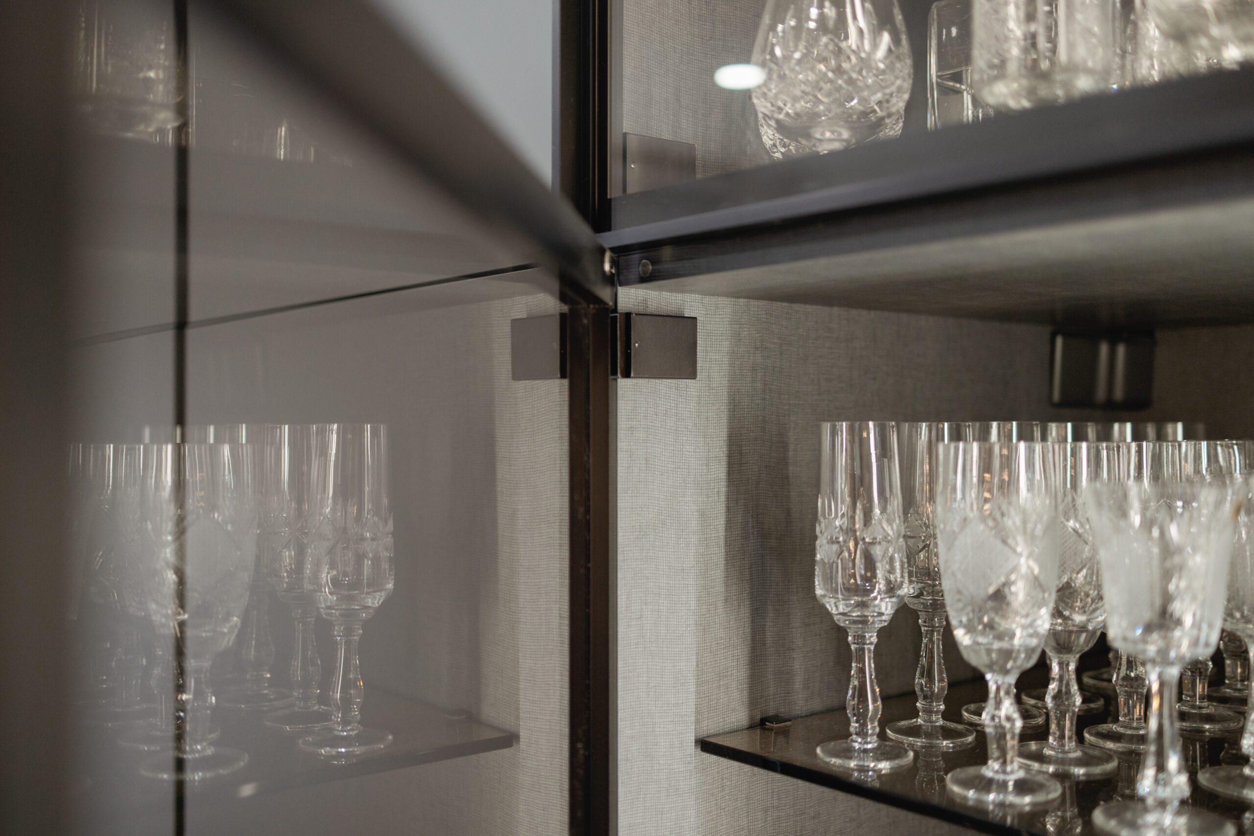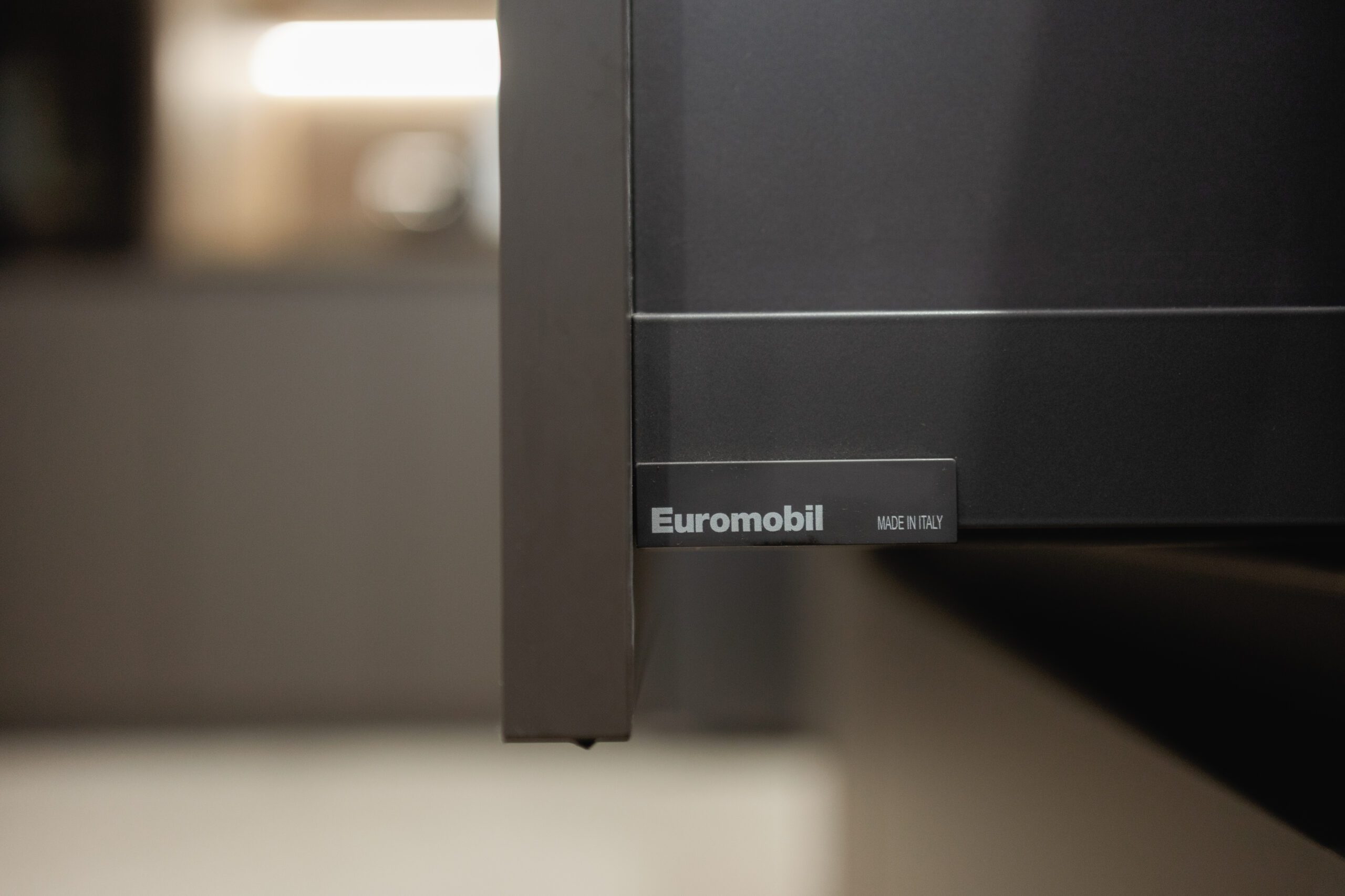 The kitchen features Euromobil cabinetry crafted in Tecnolamina with a Lavagna matt finish, wood-effect melamine in TSS Piave finish, and elegant accents in Teca Fume glass. The combination of textures and tones creates depth, warmth, and visual harmony throughout the space.