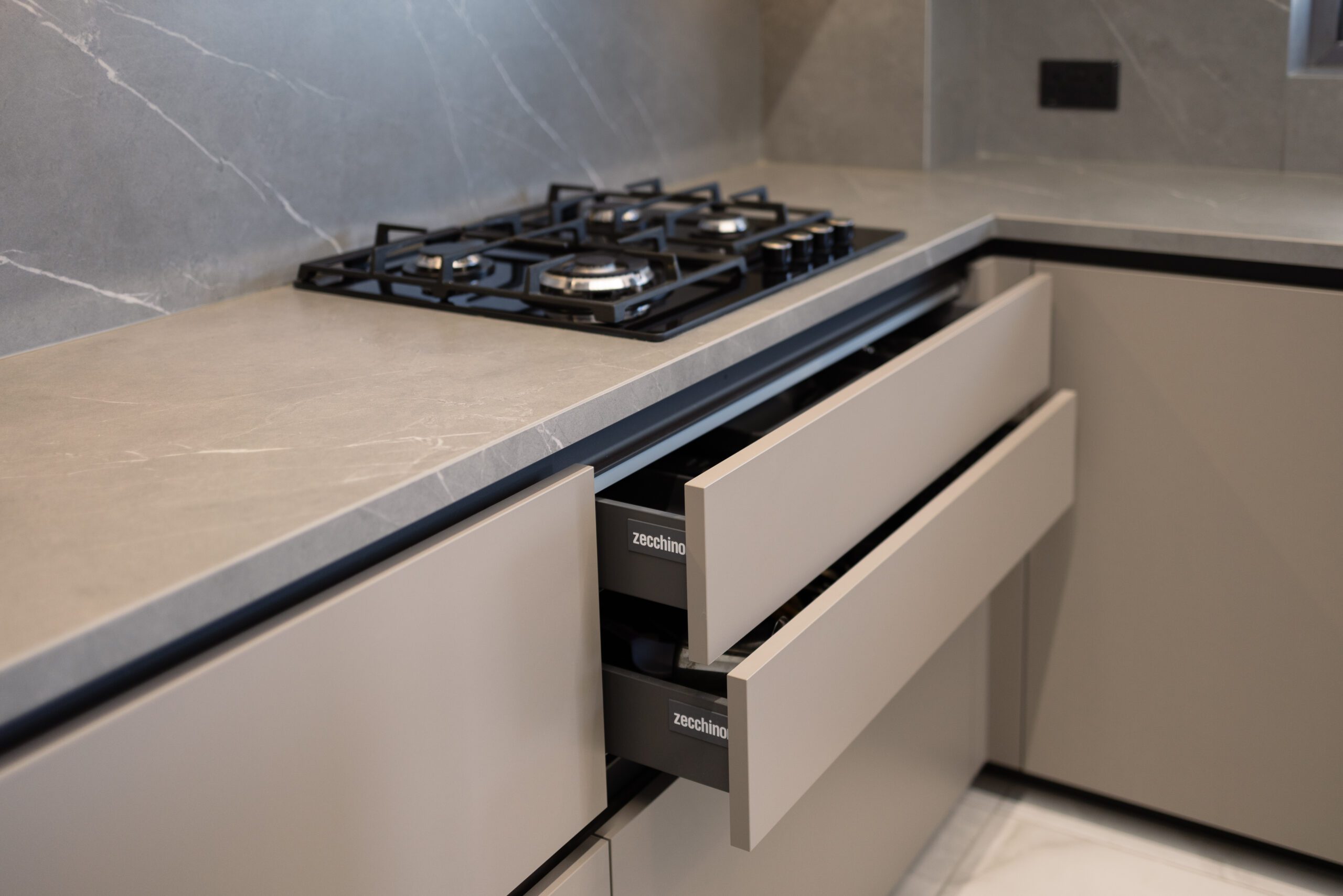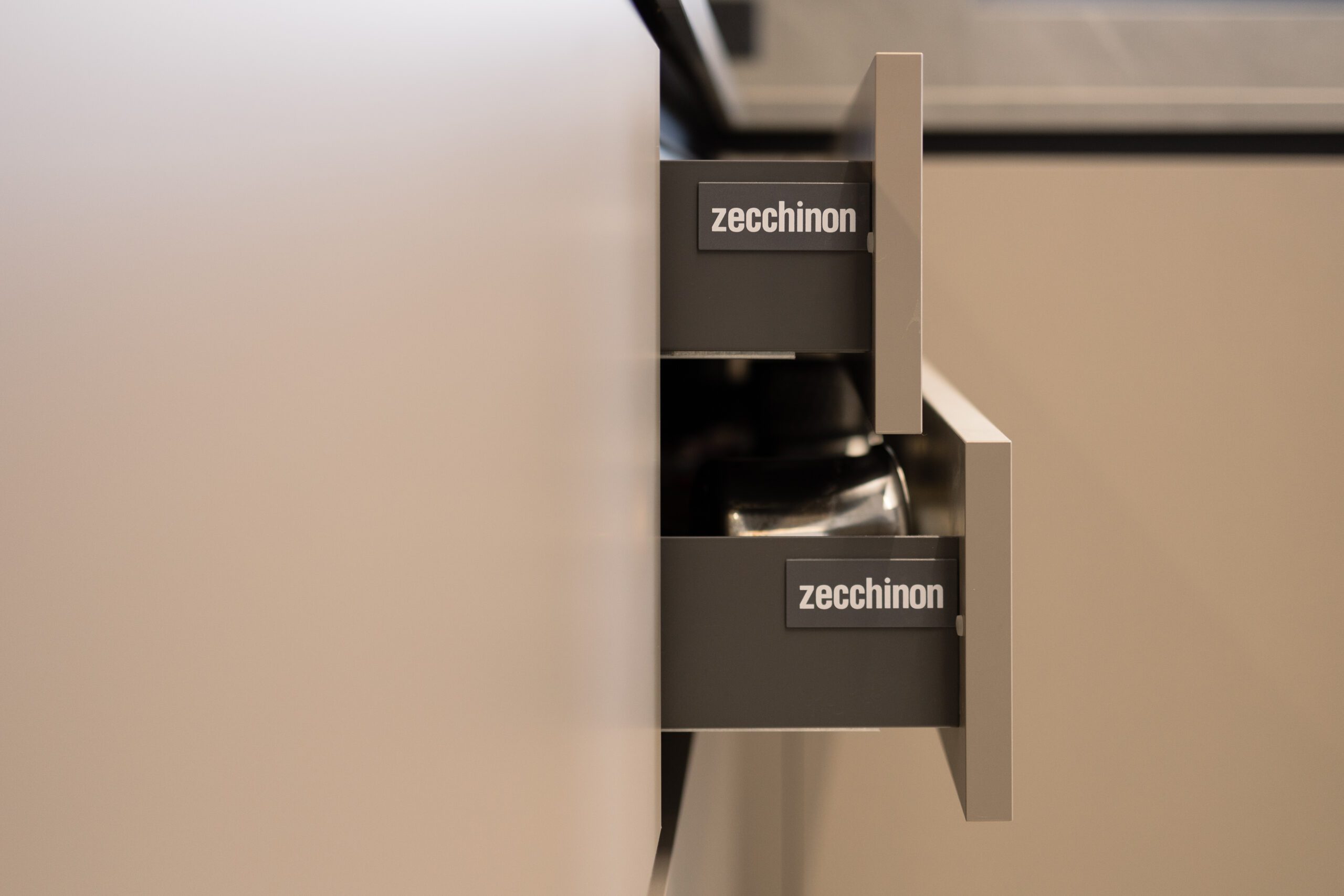 This kitchen features the Tiffany model by Zecchinon, combining material-effect melamine in Visone Soft finish with polymeric fronts in Antracite Super Matt finish. A refined palette of tones and textures creates a sophisticated atmosphere with distinctive character.