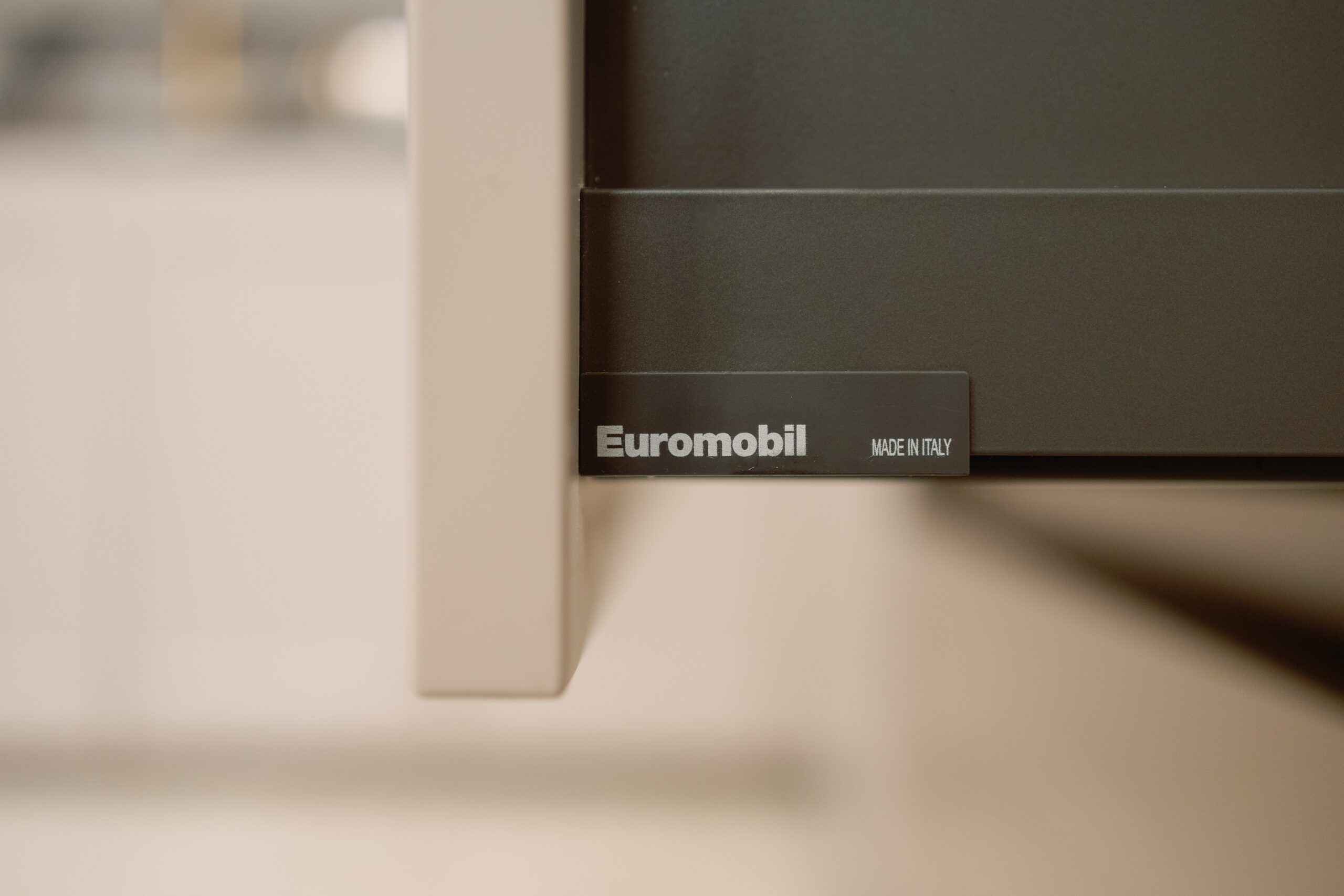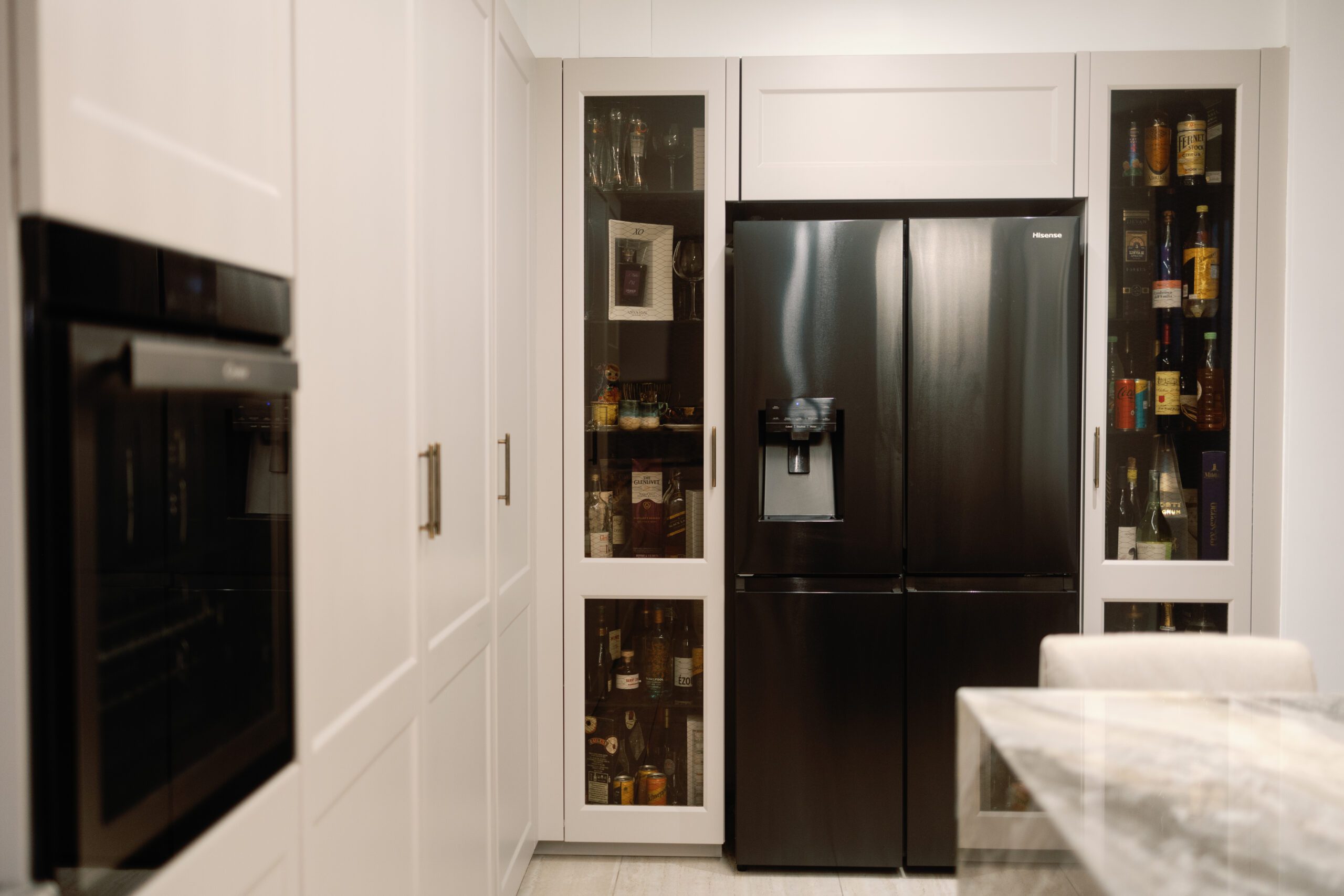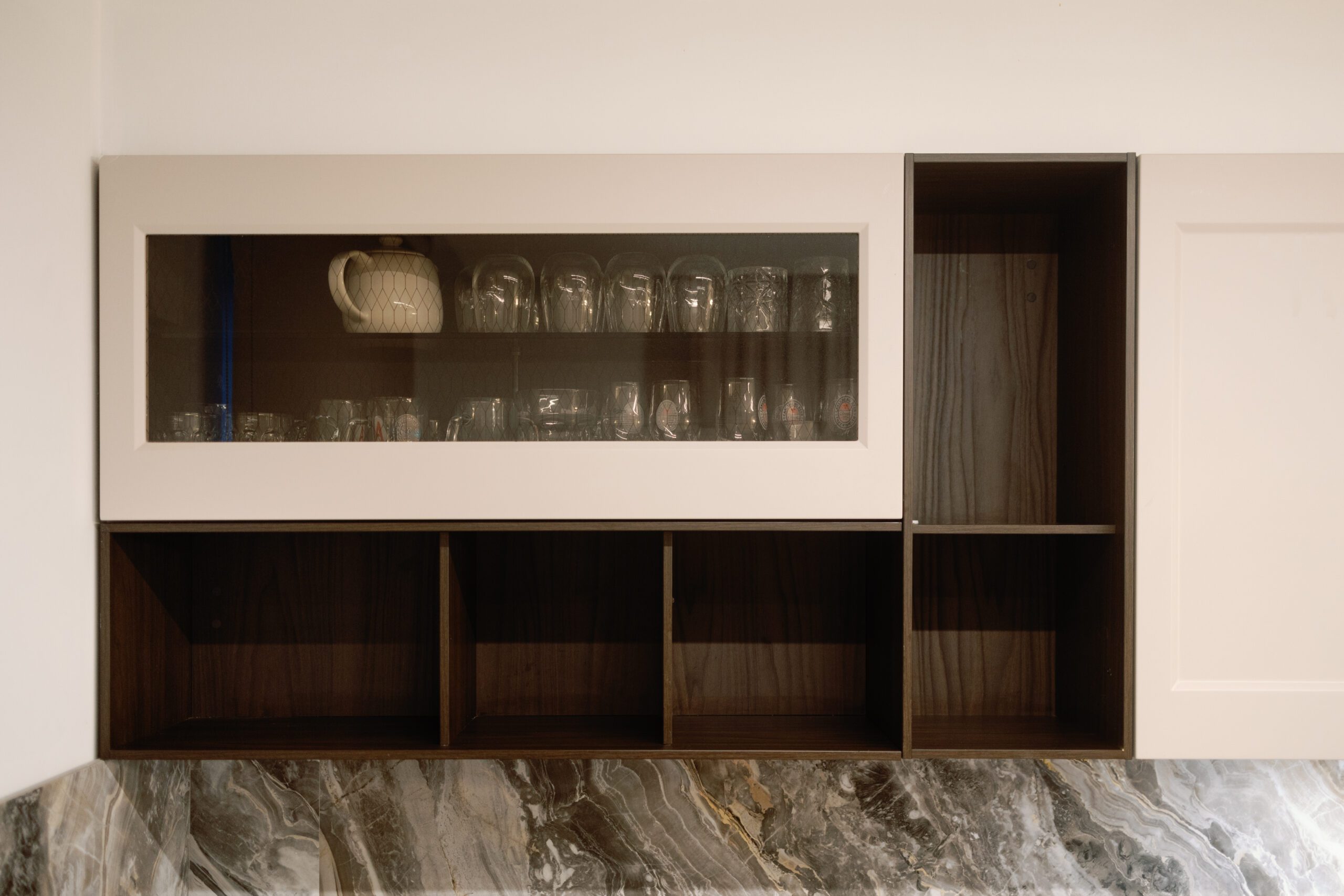 This kitchen features the Filò & Lain Plan models by Euromobil, combining MDF lacquered surfaces in Cashmere finish with elegant Frame Fumé glass elements. The result is a balanced composition of softness, transparency, and modern sophistication.